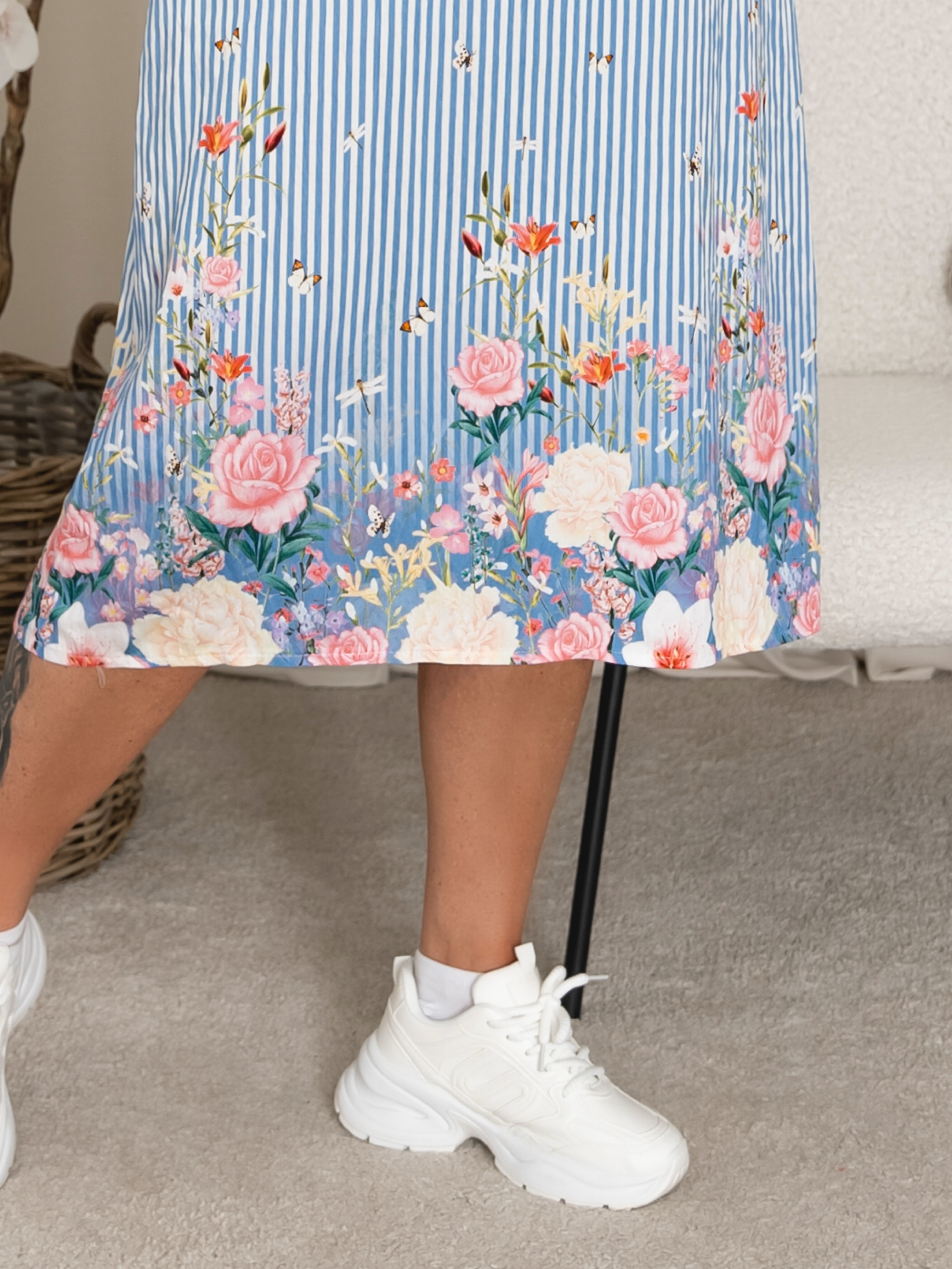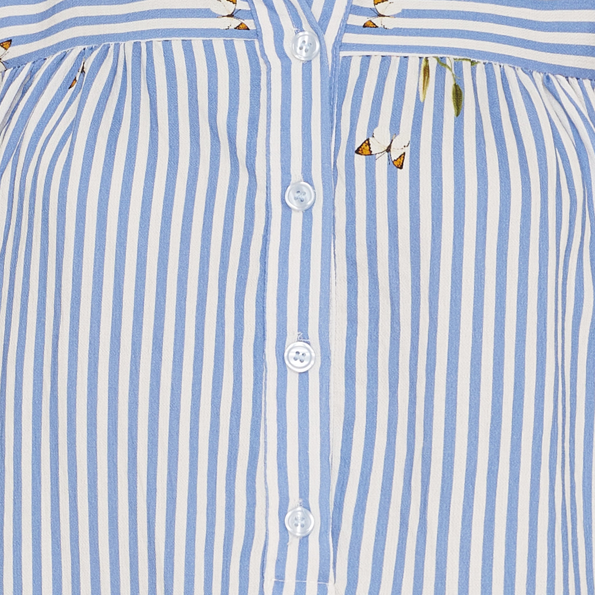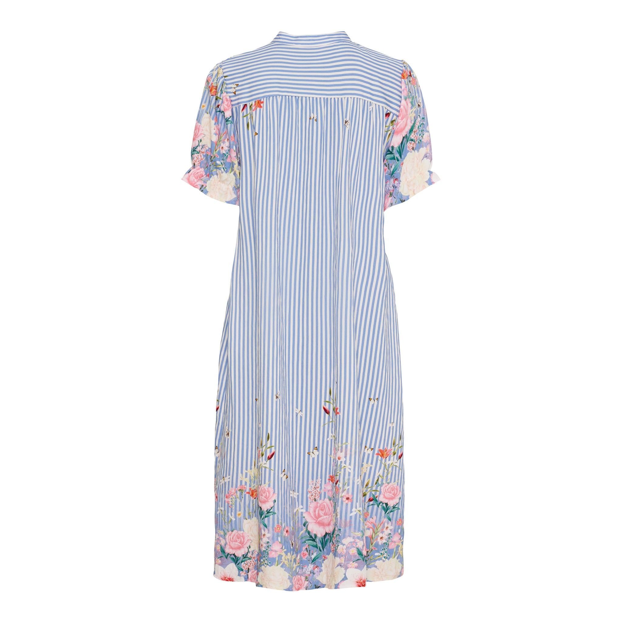Denne luftige kjole er det perfekte miks af klassisk og romantisk. De fine lodrette striber giver en slankende effekt, mens de farverige blomsterdetaljer ved ærmer og nederste kant tilføjer en skøn, sommerlig charme.