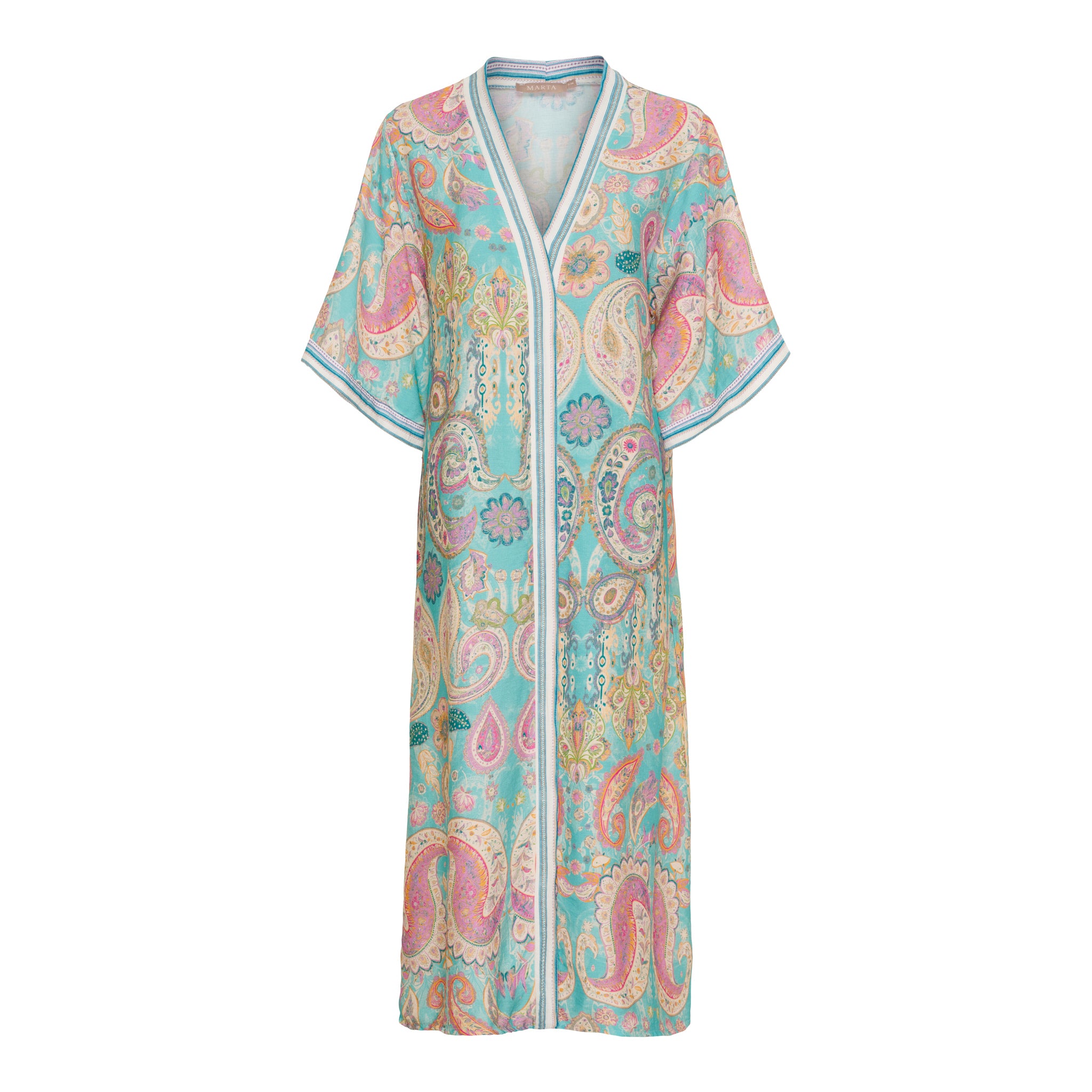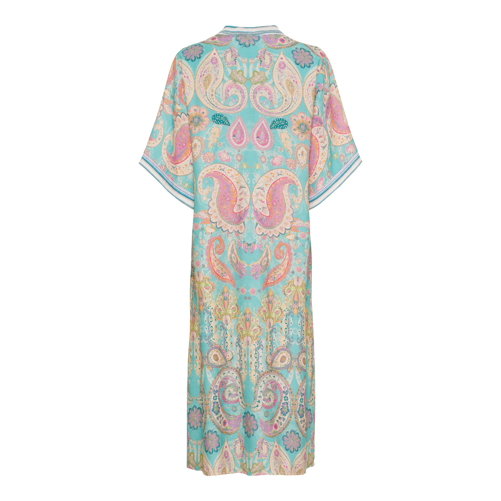 Denne kjole er skabt til dig, der elsker at skille dig ud med stil. Det iøjnefaldende paisley mønster kombineret med den stribede kant i samme nuancer skaber et dramatisk og moderne look, der emmer af selvtillid og personlighed.