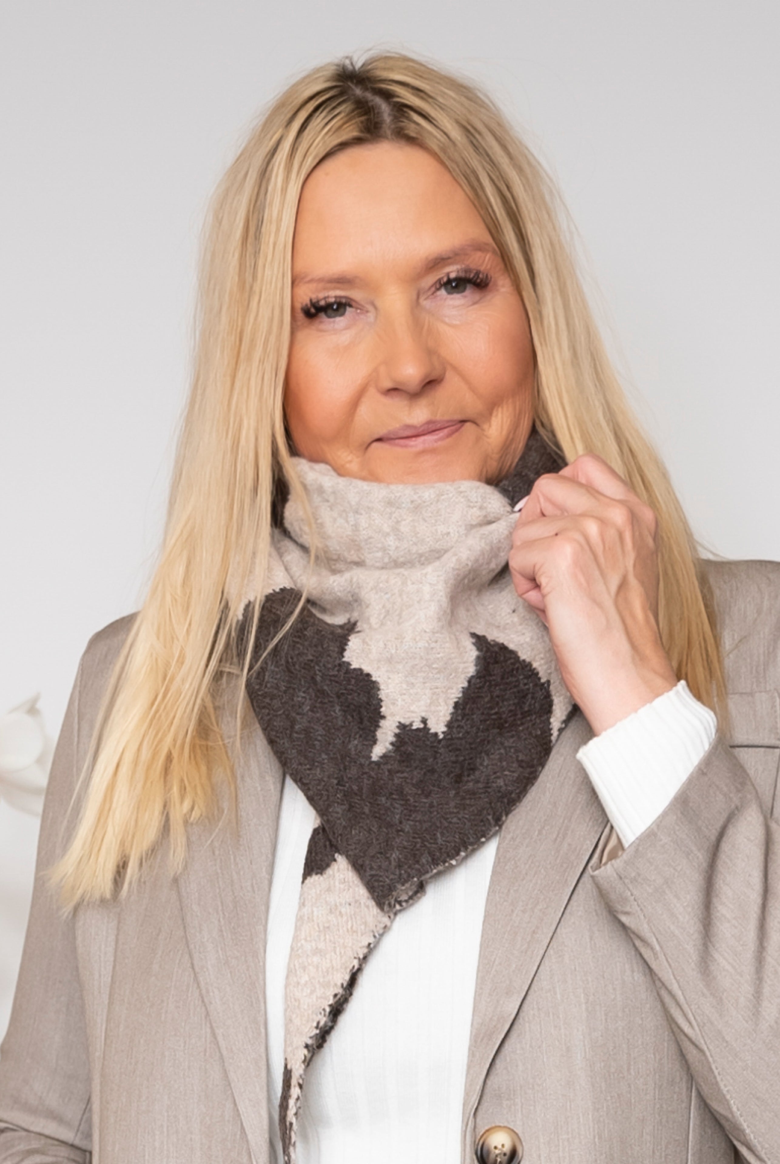 Dette smukke tørklæde med et detaljeret mønster tilføjer et stilfuldt og feminint touch til ethvert outfit. Det lette materiale gør det behageligt at have på, samtidig med at det giver varme på kølige dage. Det sofistikerede mønster skaber en elegant kontrast til både casual og formelle looks, hvilket gør tørklædet alsidigt og nemt at style.