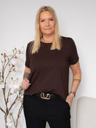 Denne enkle T-shirt er et alsidigt basisitem, der kombinerer et rent udtryk med en behagelig pasform. Det glatte, lette materiale falder flot på kroppen og gør blusen nem at style til både afslappede og mere sammensatte looks.