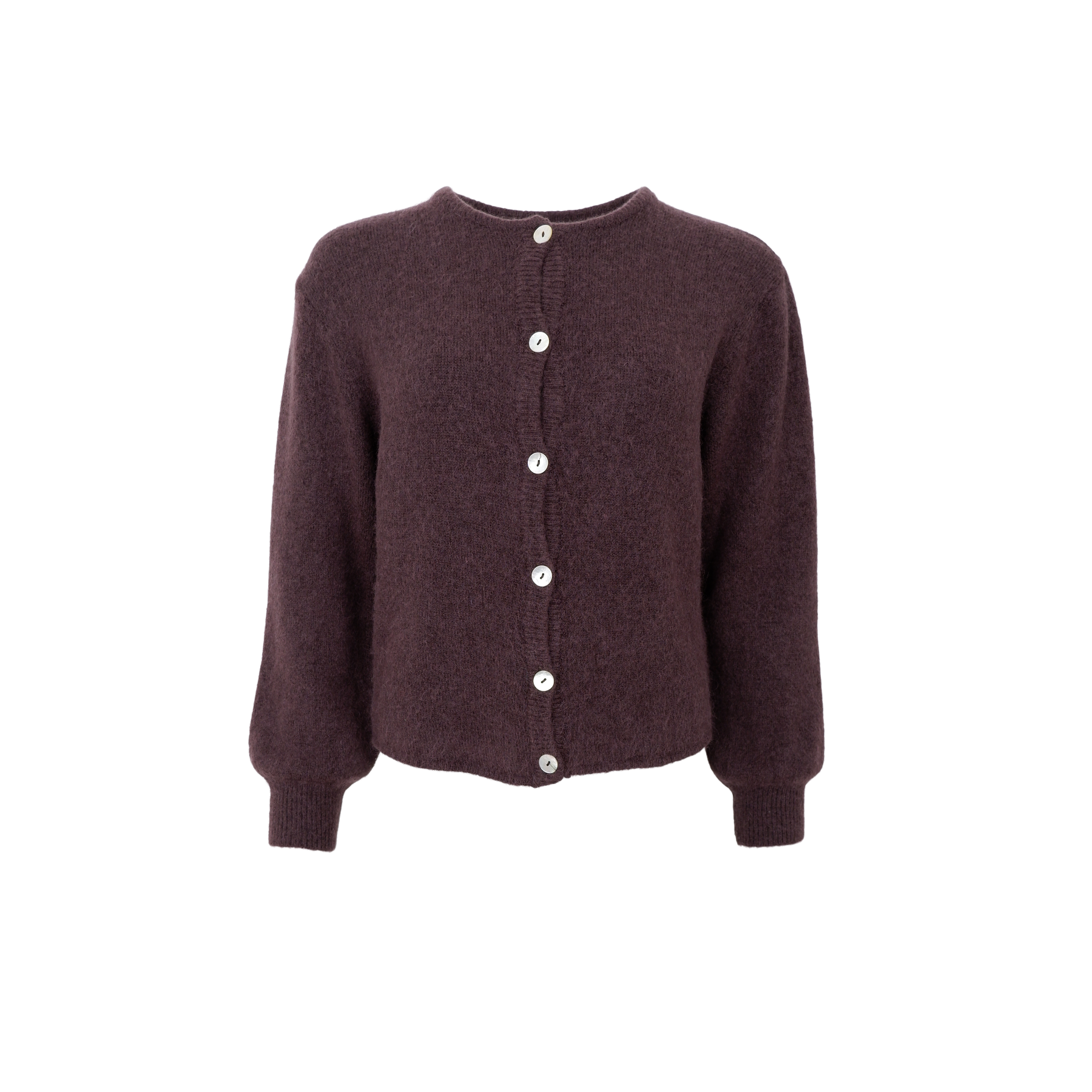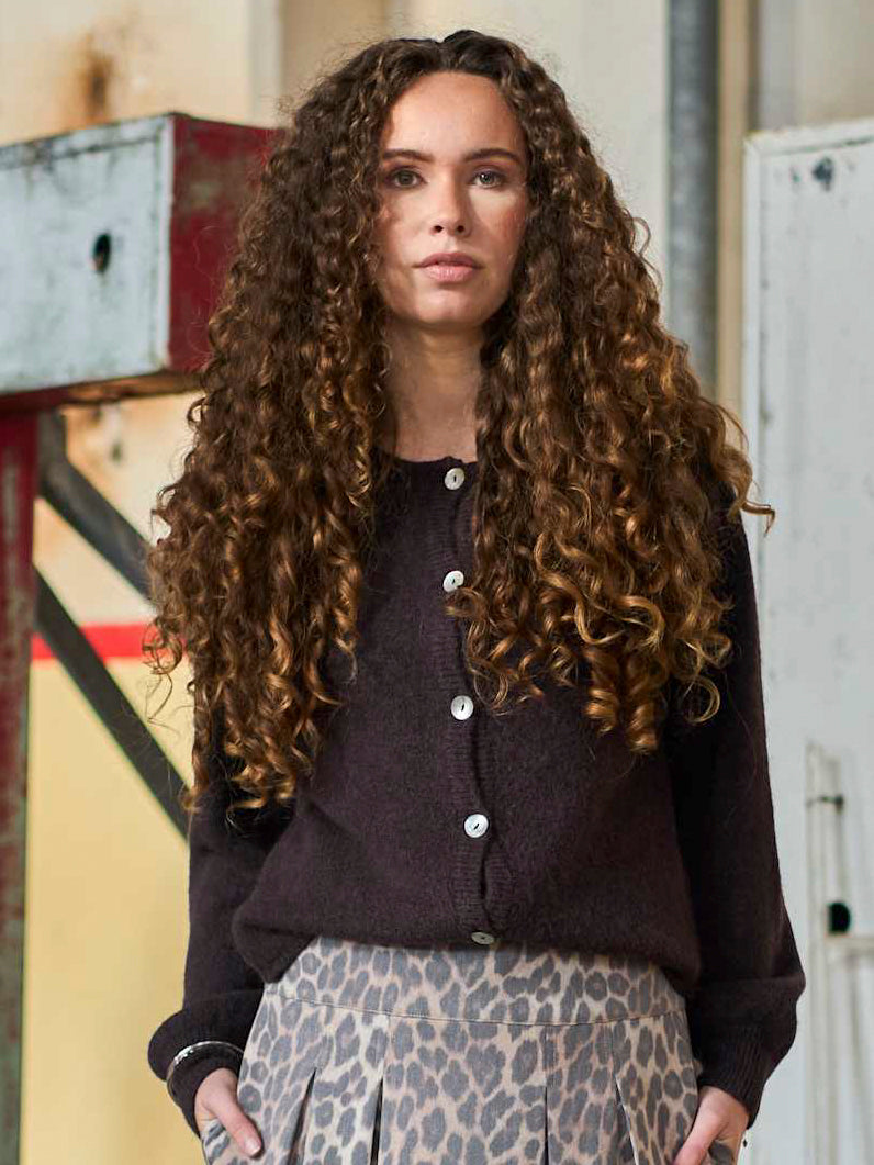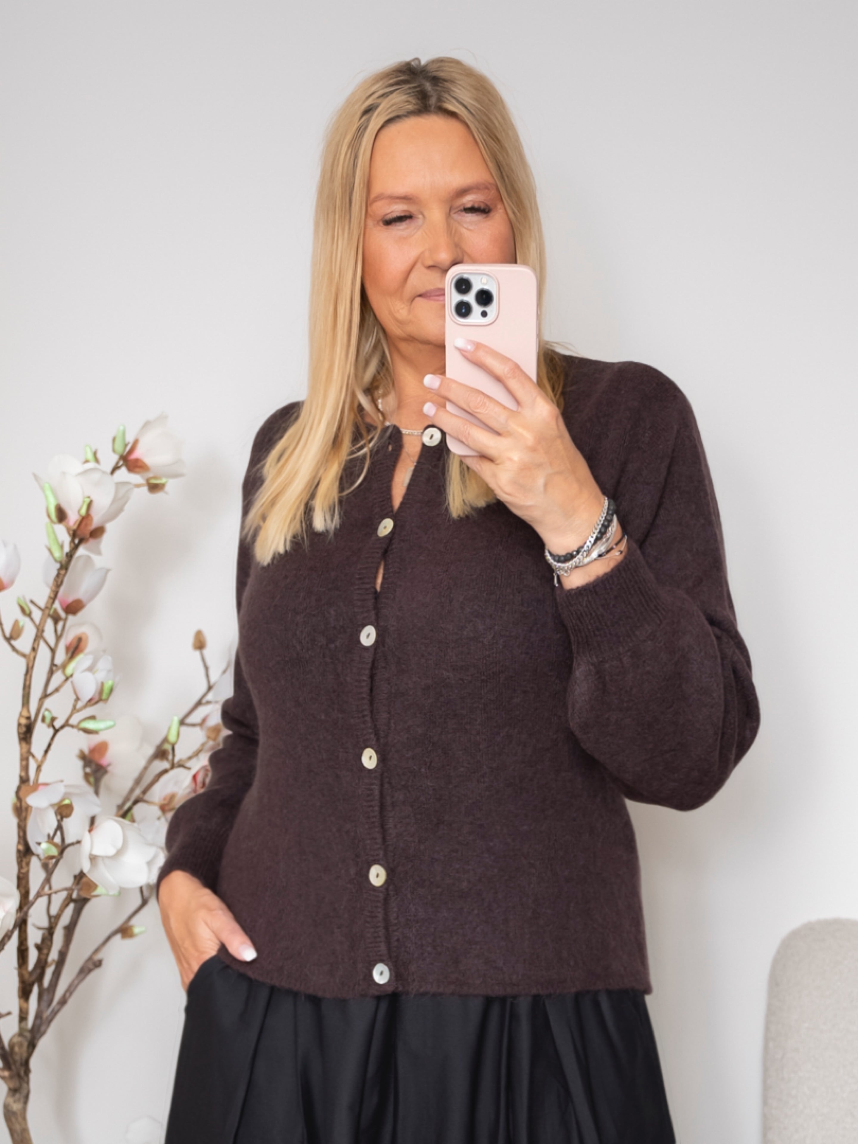 Cardiganen har en let boxy pasform med rund hals og lange ærmer, som gør den nem at style over både kjoler, toppe og skjorter. Ribkanter ved ærmer og bund giver en diskret afslutning, og knaplukningen i front tilføjer et klassisk touch.