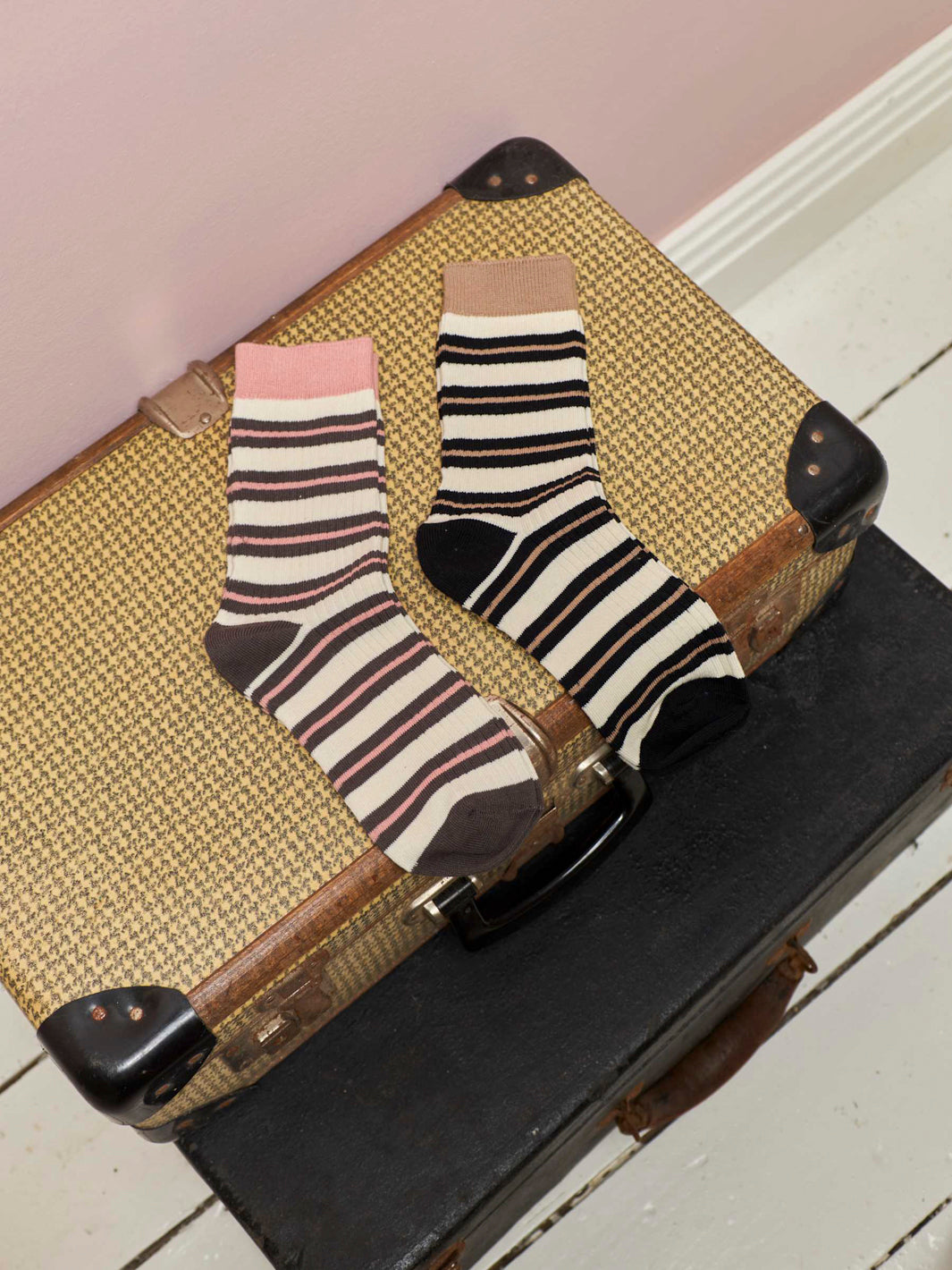 Denne strømpe har et klassisk og stilfuldt udtryk med et horisontalt stribet design, der giver et tidløst og let sporty look. Farvekombinationen skaber en flot kontrast, som gør strømpen nem at style til både hverdag og mere afslappede outfits.