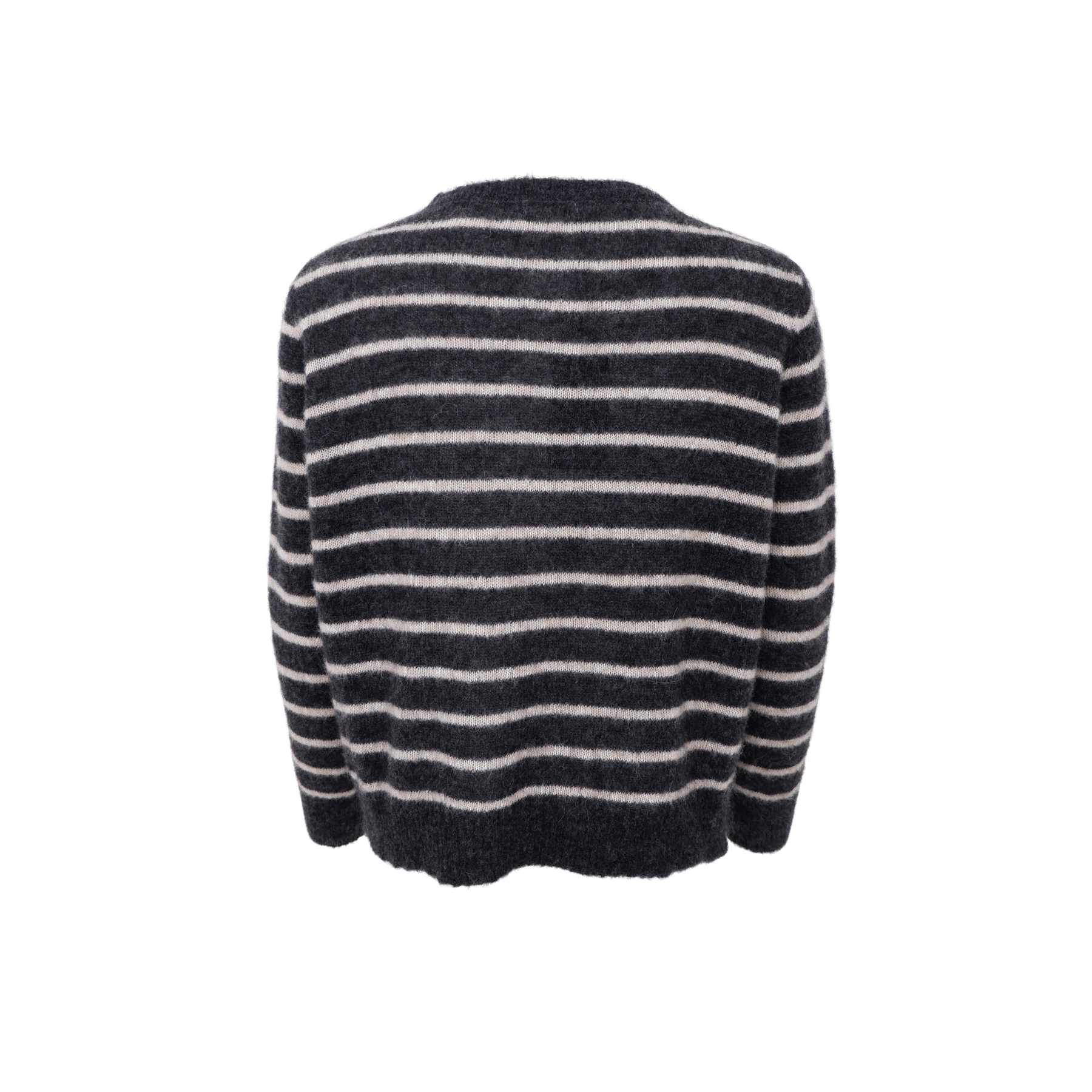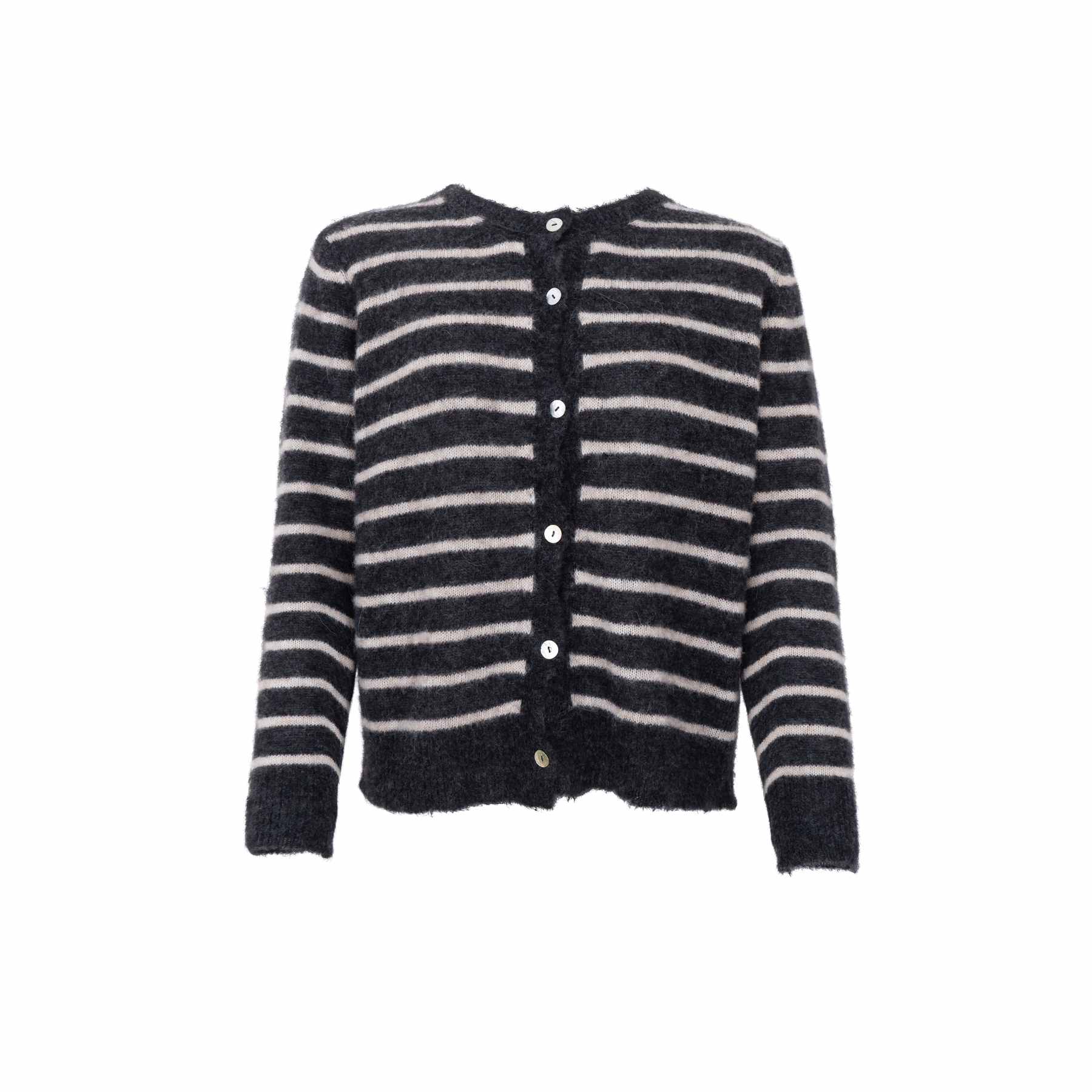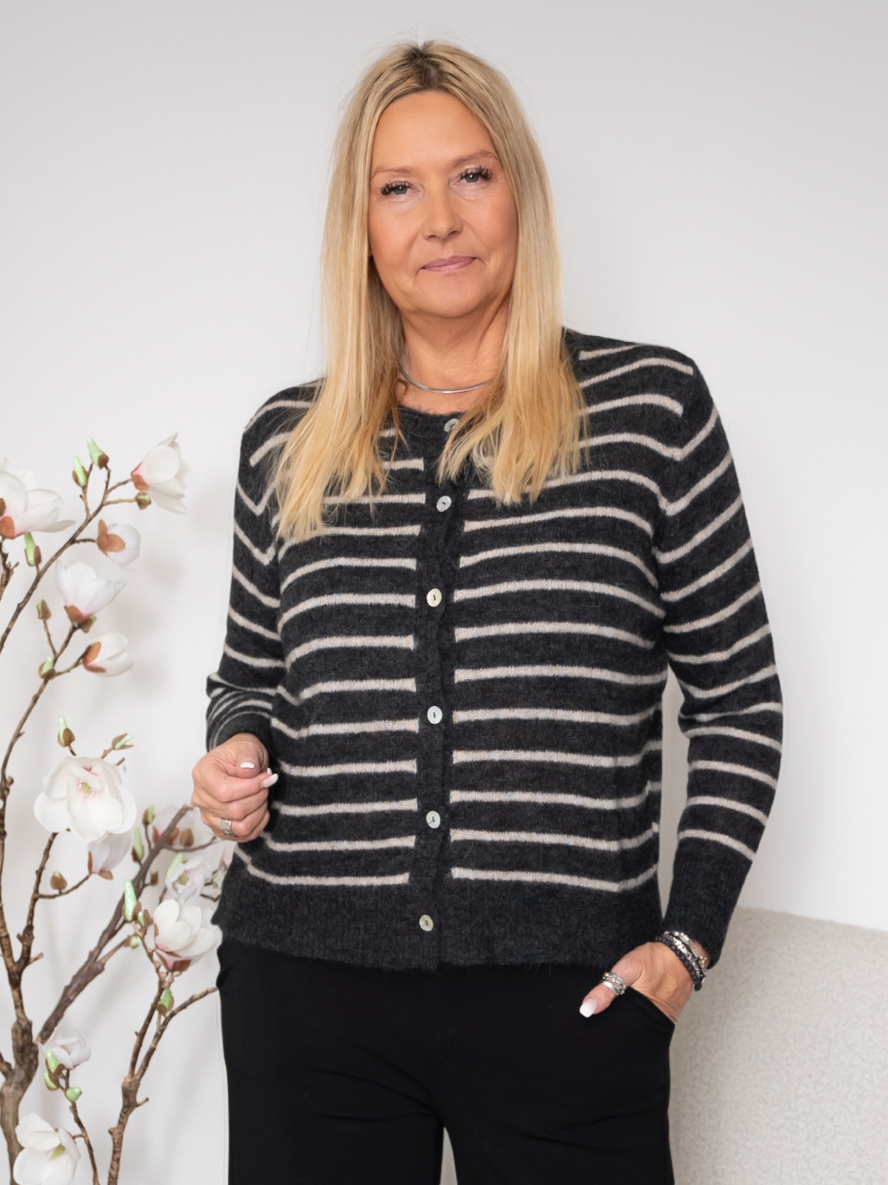 Denne ultrabløde strikkede cardigan har et klassisk og afslappet udtryk, der gør den nem at integrere i en alsidig garderobe. Det bløde, let lodne strik giver en behagelig fornemmelse og et afslappet look, mens det enkle stribede mønster tilfører struktur uden at virke dominerende.