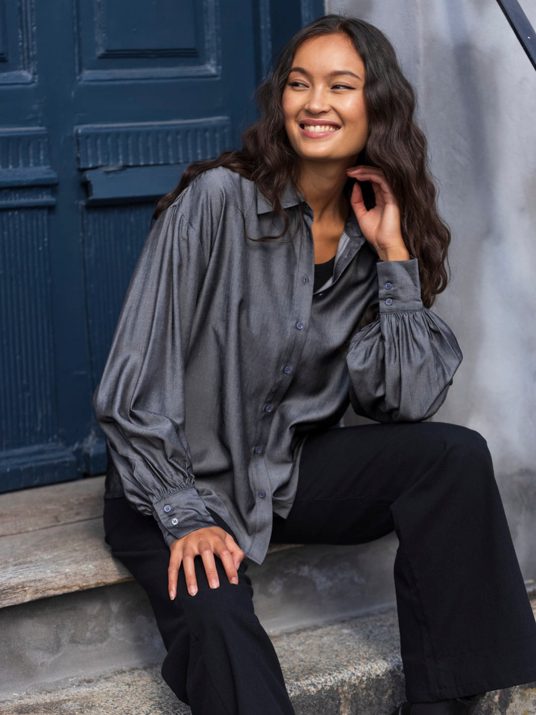 Denne skjorte forener klassisk elegance med et moderne twist. Den har en løs pasform og er fremstillet i et let skinnende materiale, der giver et sofistikeret udtryk. Skjorten er designet med knaplukning foran, en klassisk krave og lange ærmer med markante manchetter, der tilføjer volumen og karakter til looket.