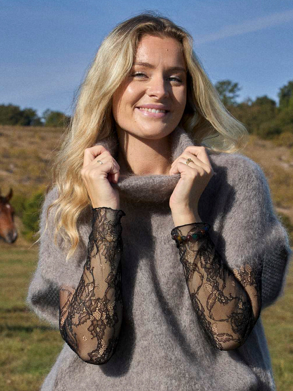 Modellen har en tætsiddende pasform med rund halsudskæring og lange ærmer, hvilket gør den ideel at style under en vest, blazer eller kjole – eller alene med en top under for et festligt look.