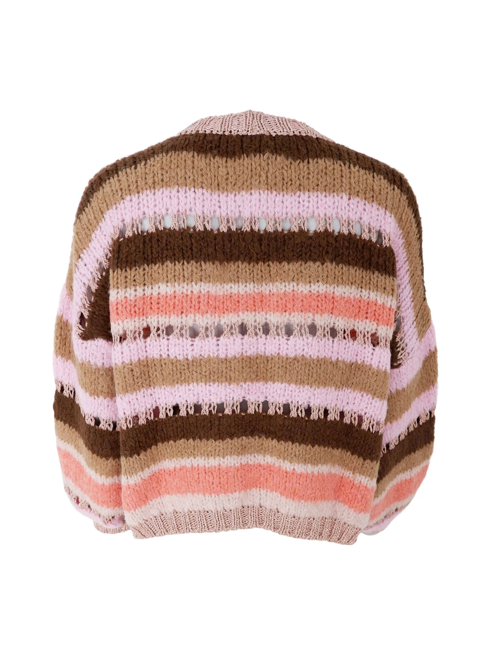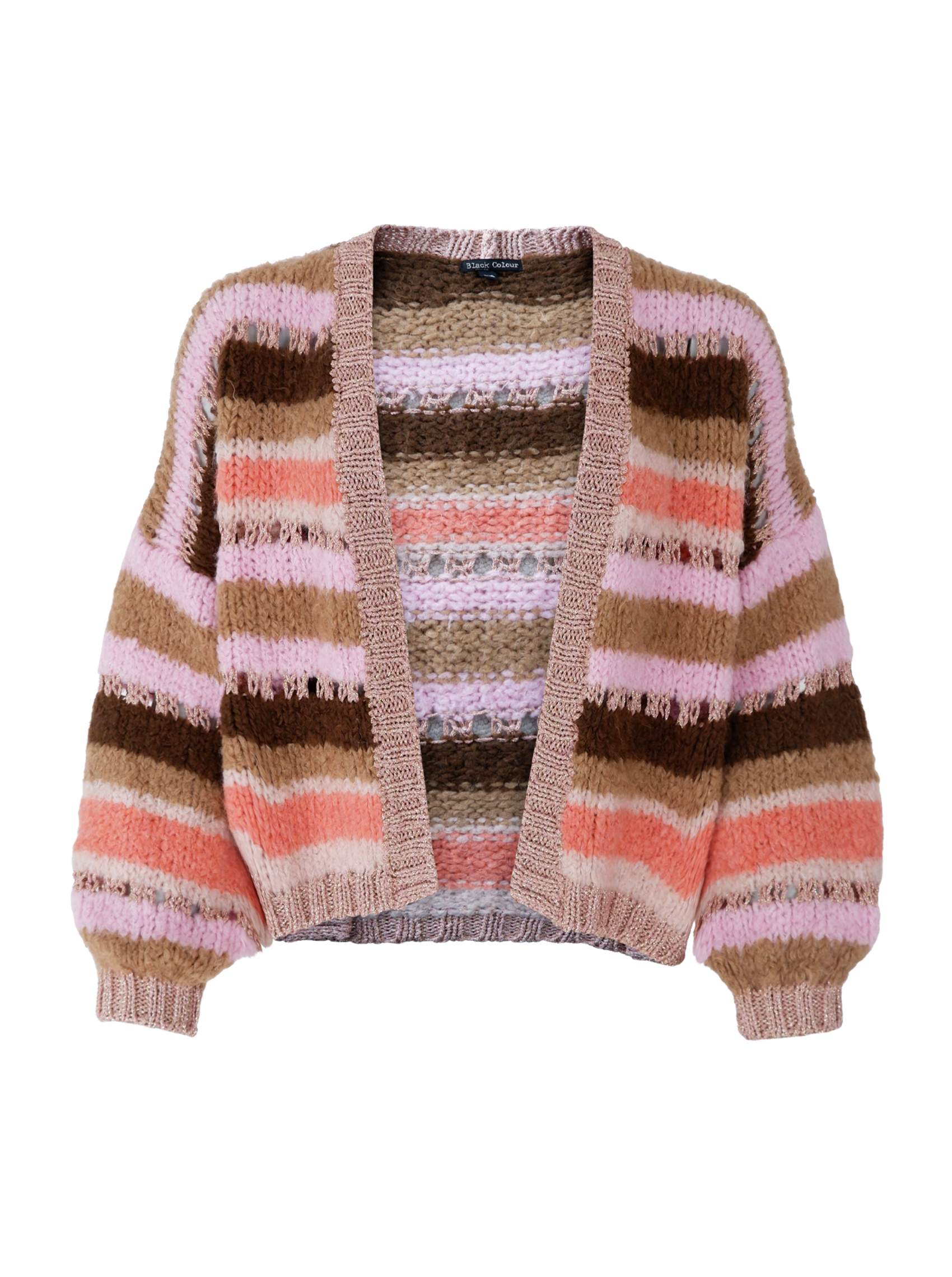 Denne strikcardigan har et varmt og hyggeligt udtryk med brede, horisontale striber i bløde og harmoniske farver. Kombinationen af rosa, brun, beige og koral giver et feminint og moderne look, som er nemt at style i hverdagen.