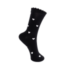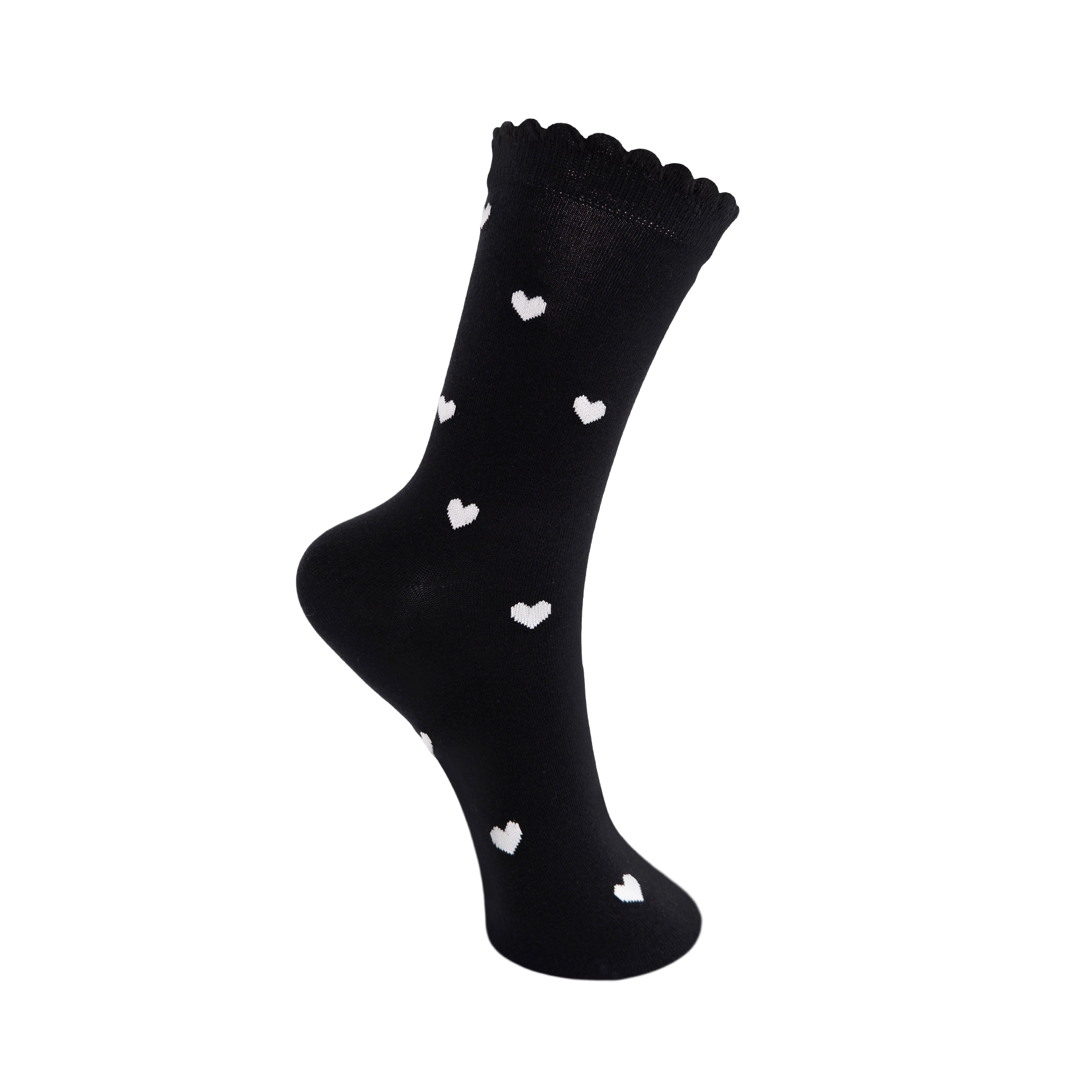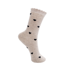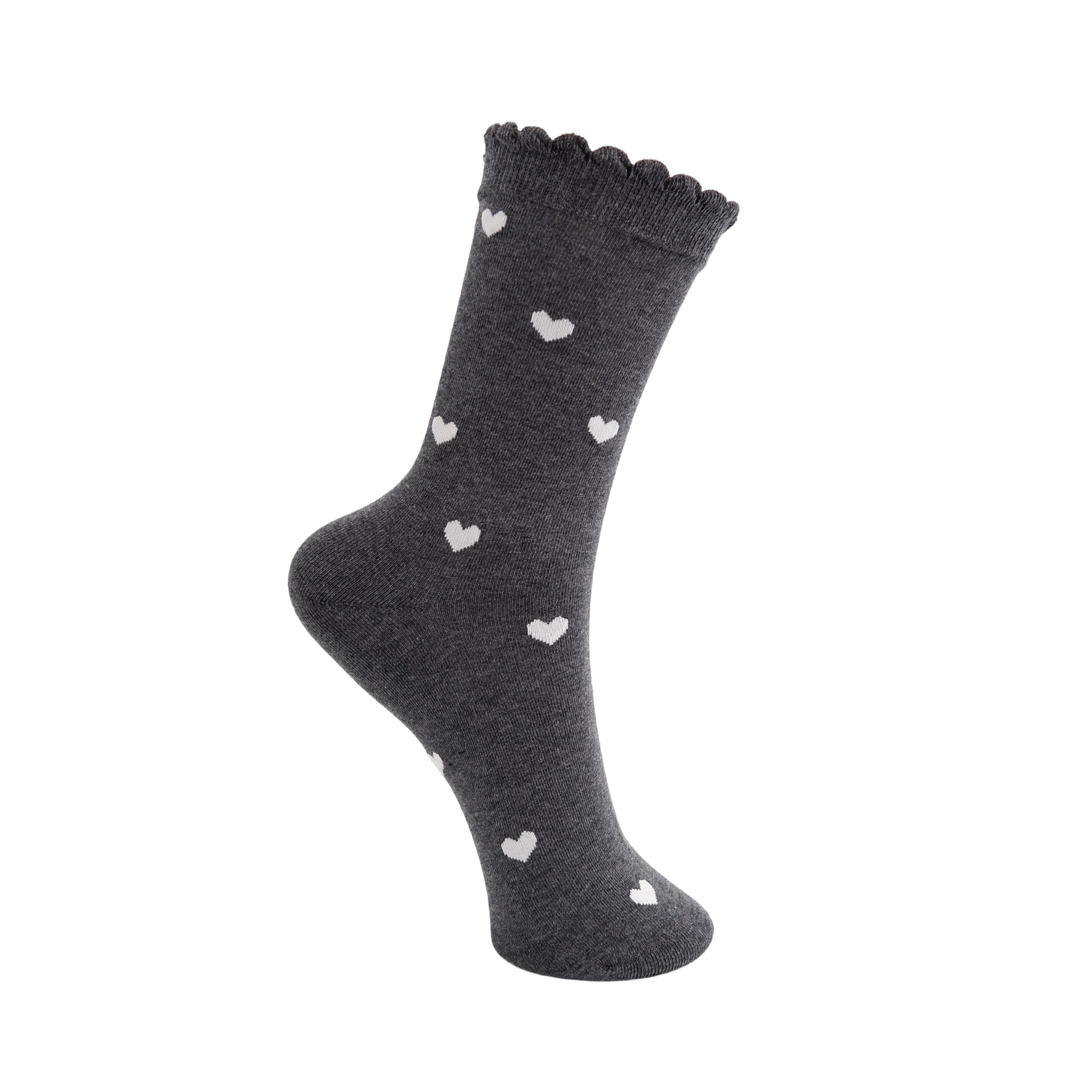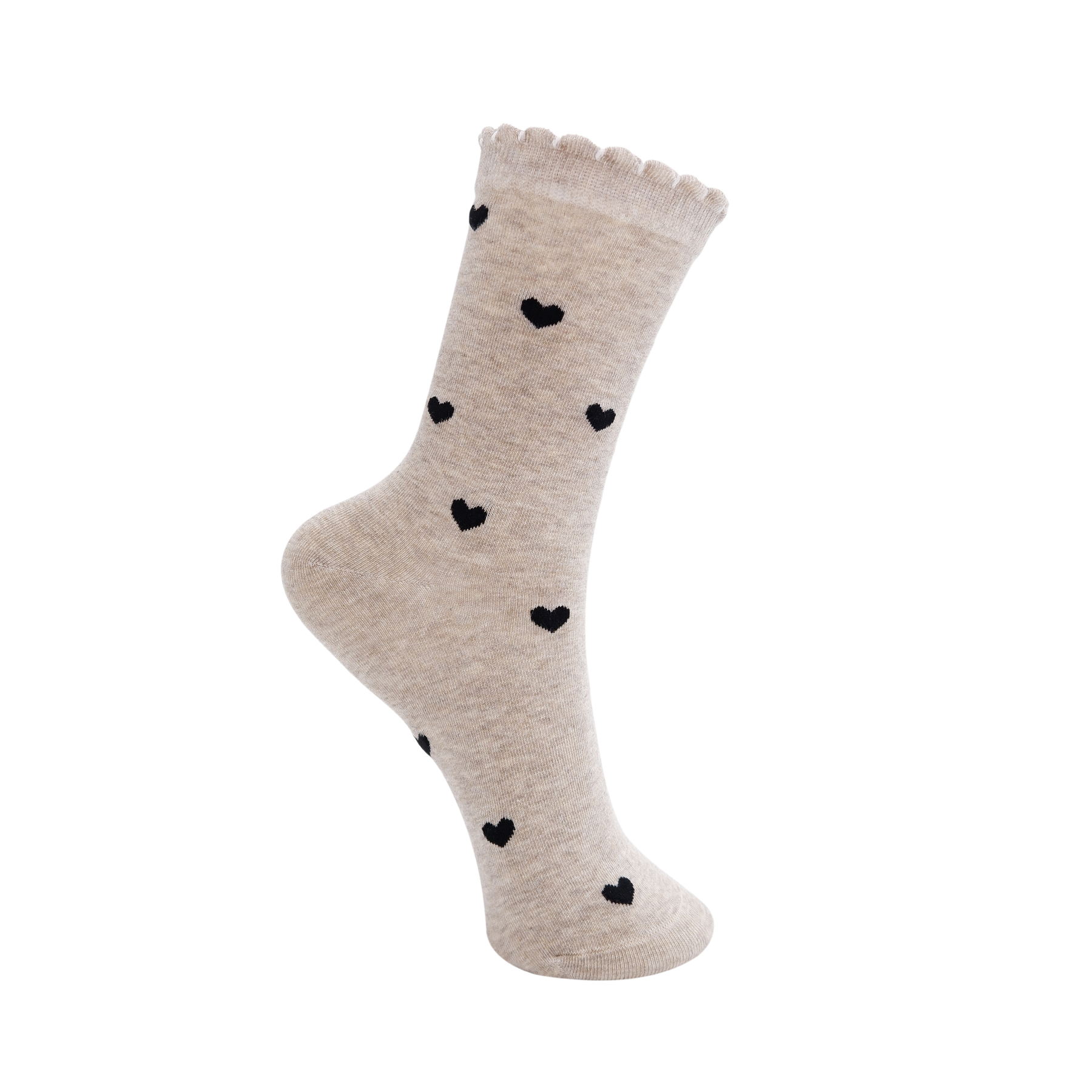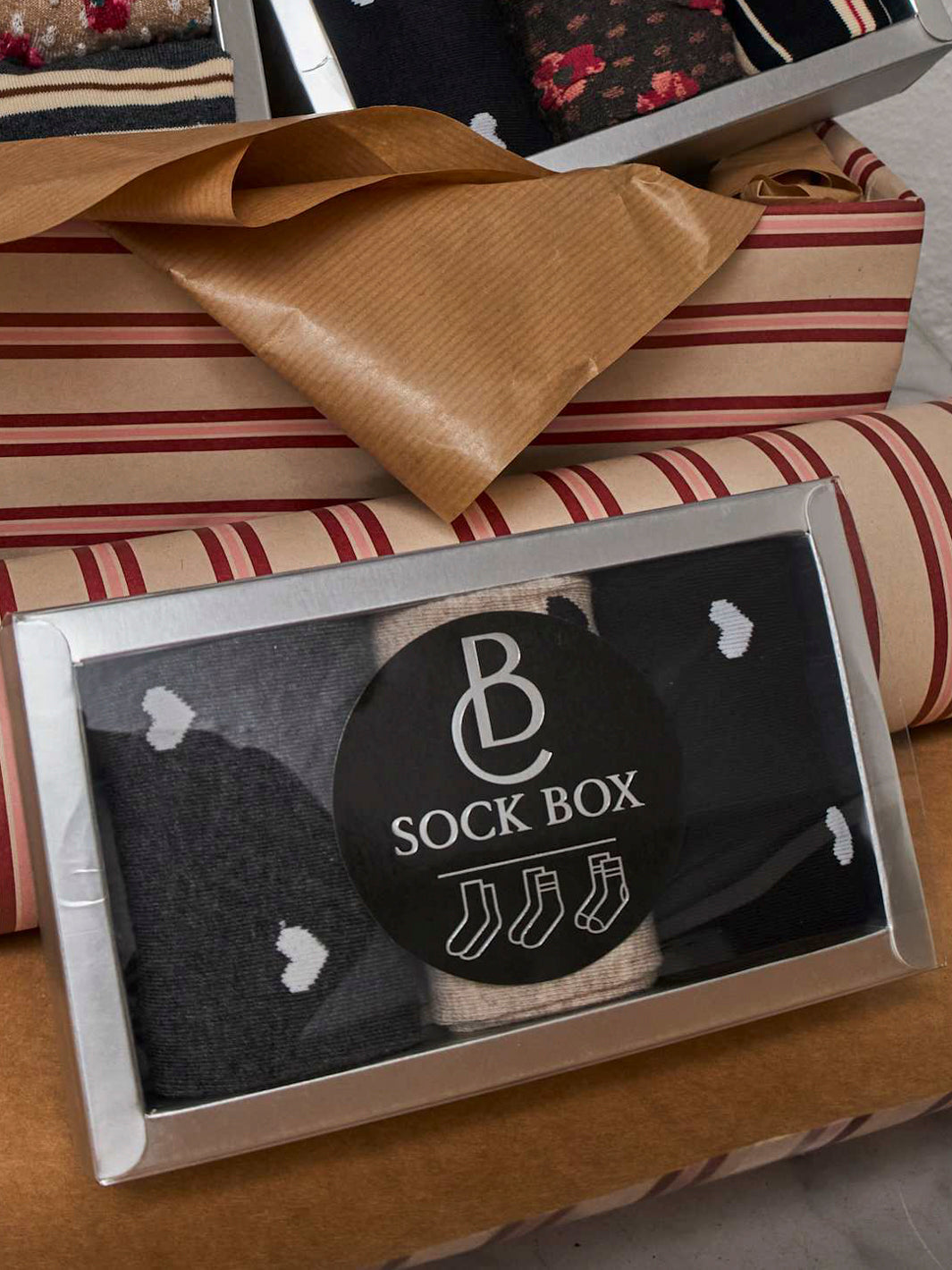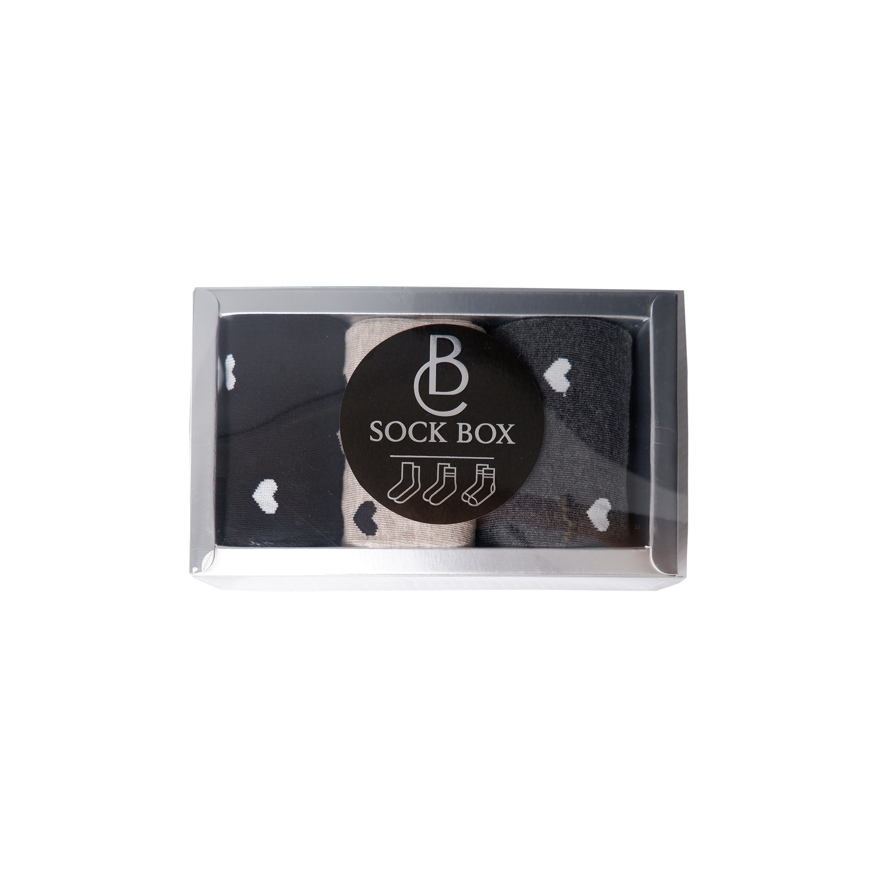 Æsken indeholder tre par sokker med små hjerter i neutrale farver, som passer til de fleste outfits og årstider.