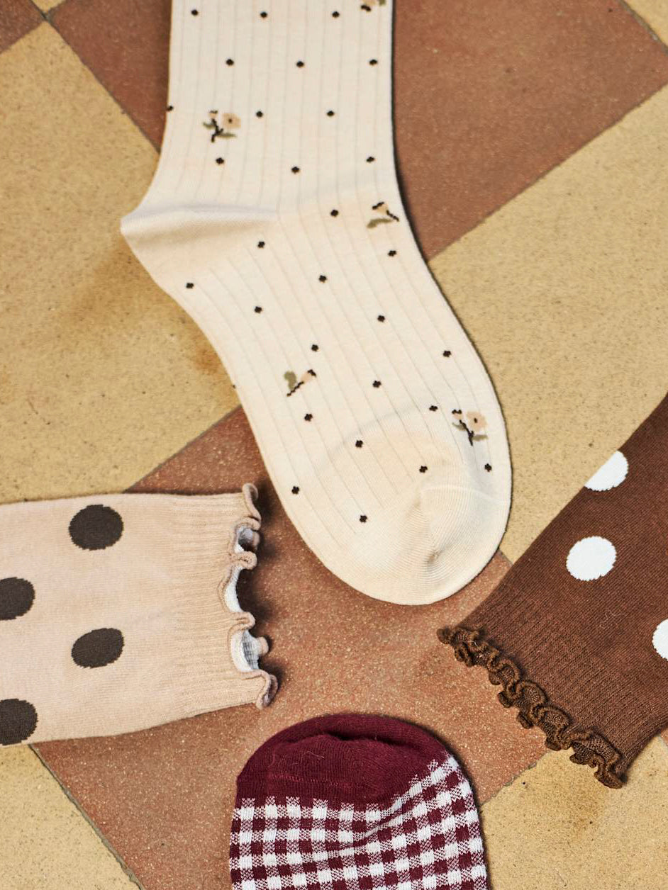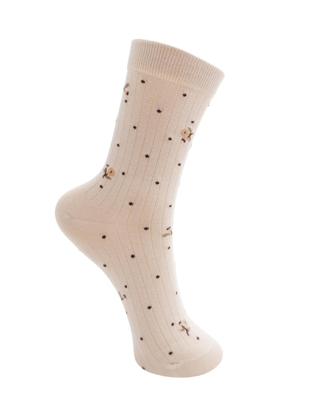 Denne strømpe har et fint og feminint udtryk med et diskret prikket mønster og små blomsterdetaljer, der giver et sødt og stilfuldt look. Den bløde og elastiske kvalitet sikrer høj komfort og en behagelig pasform hele dagen.