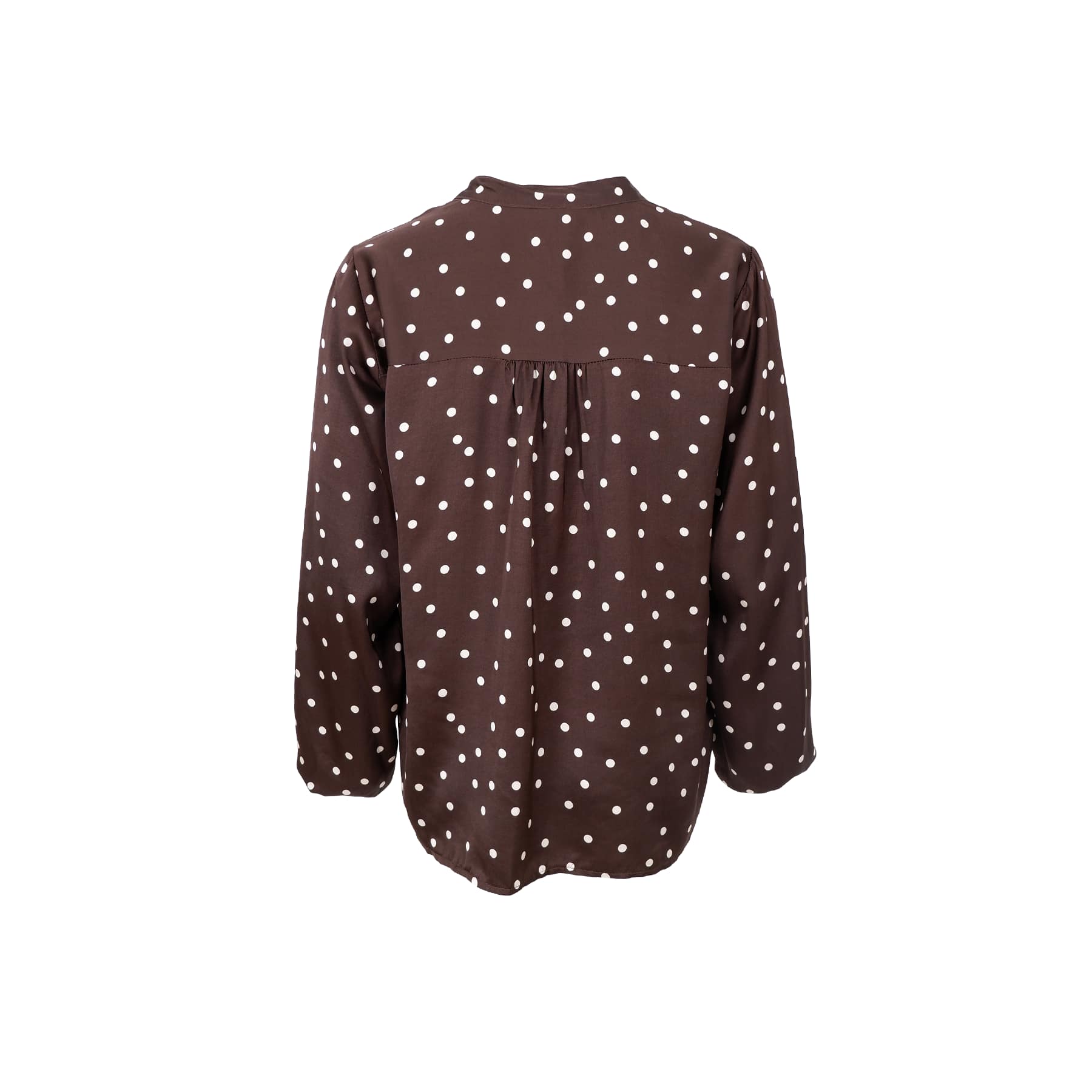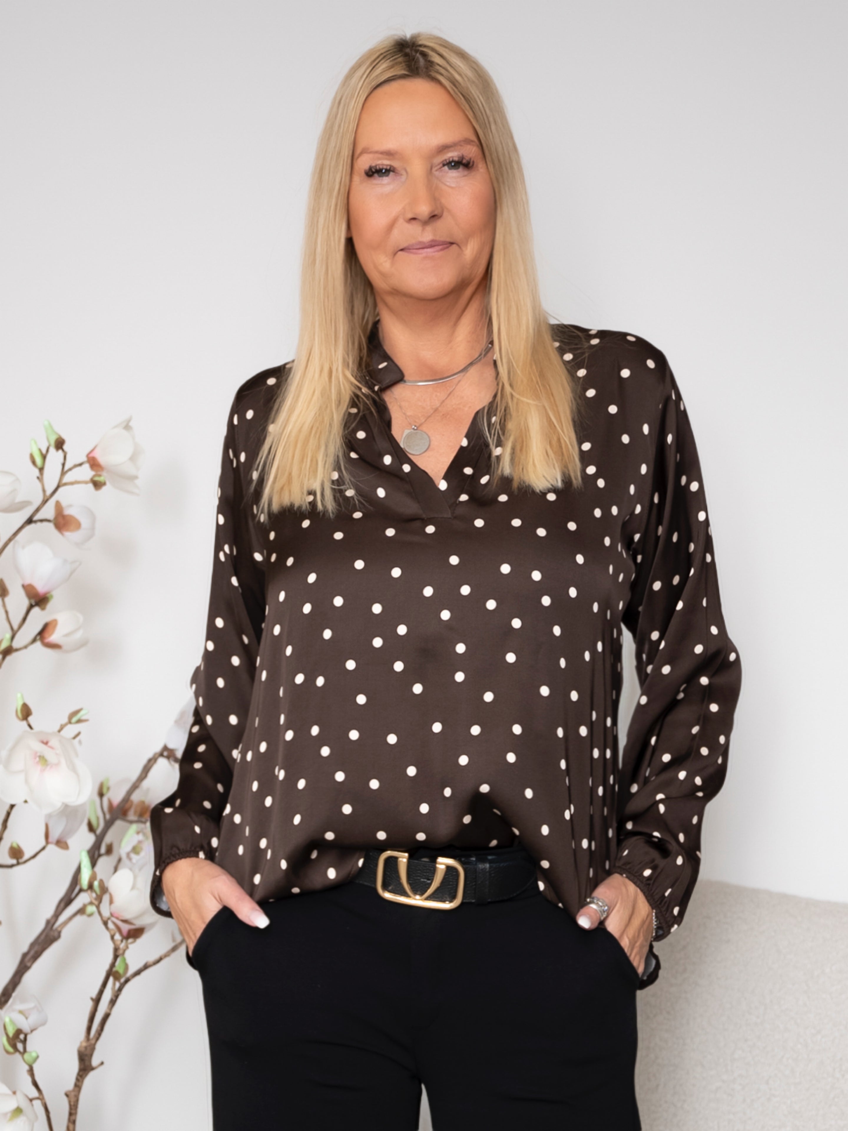 Denne bluse har et let og feminint udtryk, der kombinerer et klassisk mønster med en afslappet silhuet. Det bløde, glatte stof falder flot og giver en behagelig fornemmelse, mens det diskrete prikkede mønster tilfører liv uden at dominere.