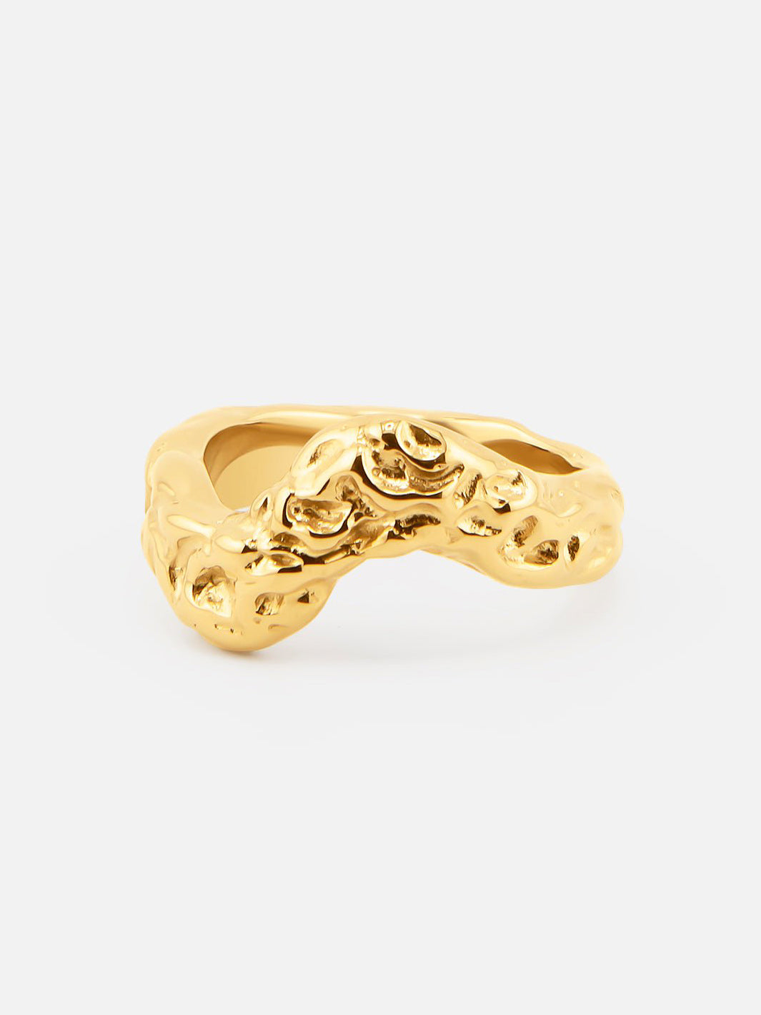 En skulpturel ring med en ujævn, organisk overflade, der giver et råt og levende udtryk. De bløde fordybninger og former skaber dybde og karakter og gør ringen til et markant statement med et kunstnerisk præg.