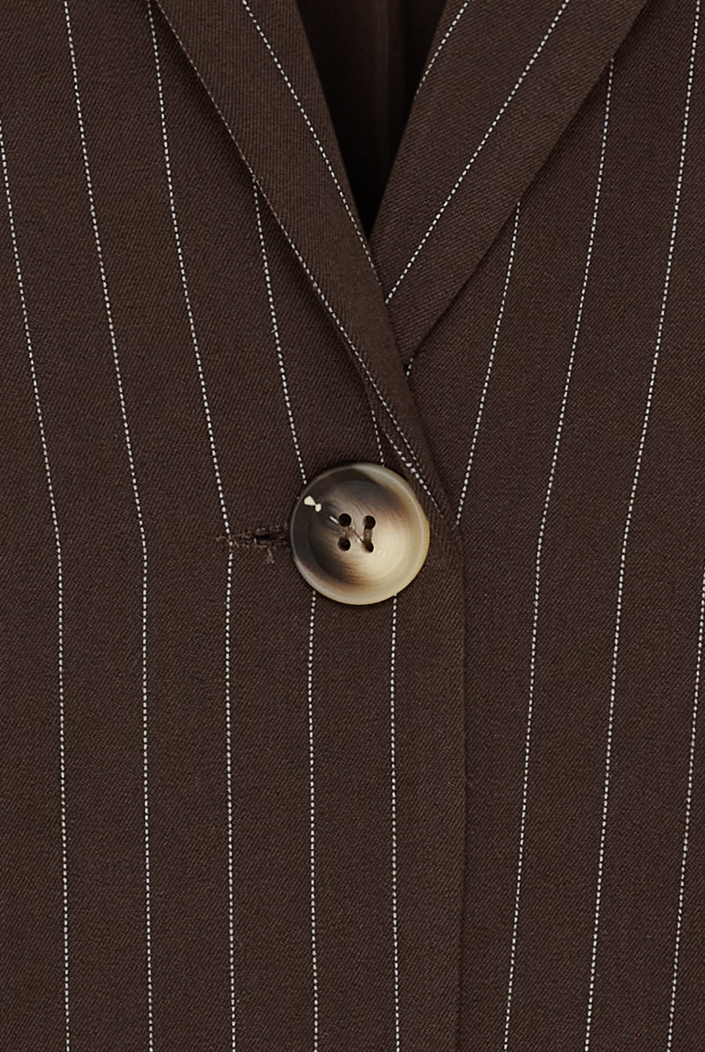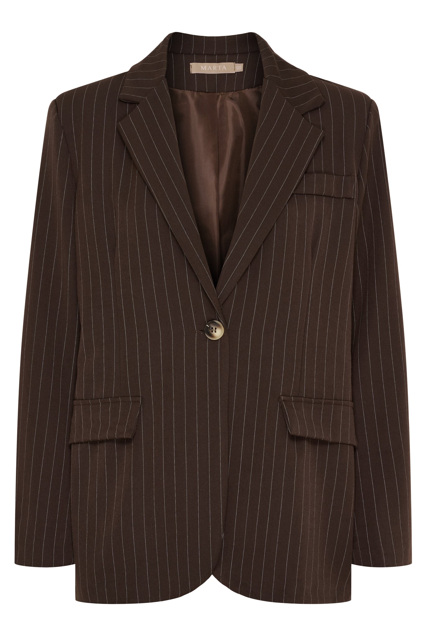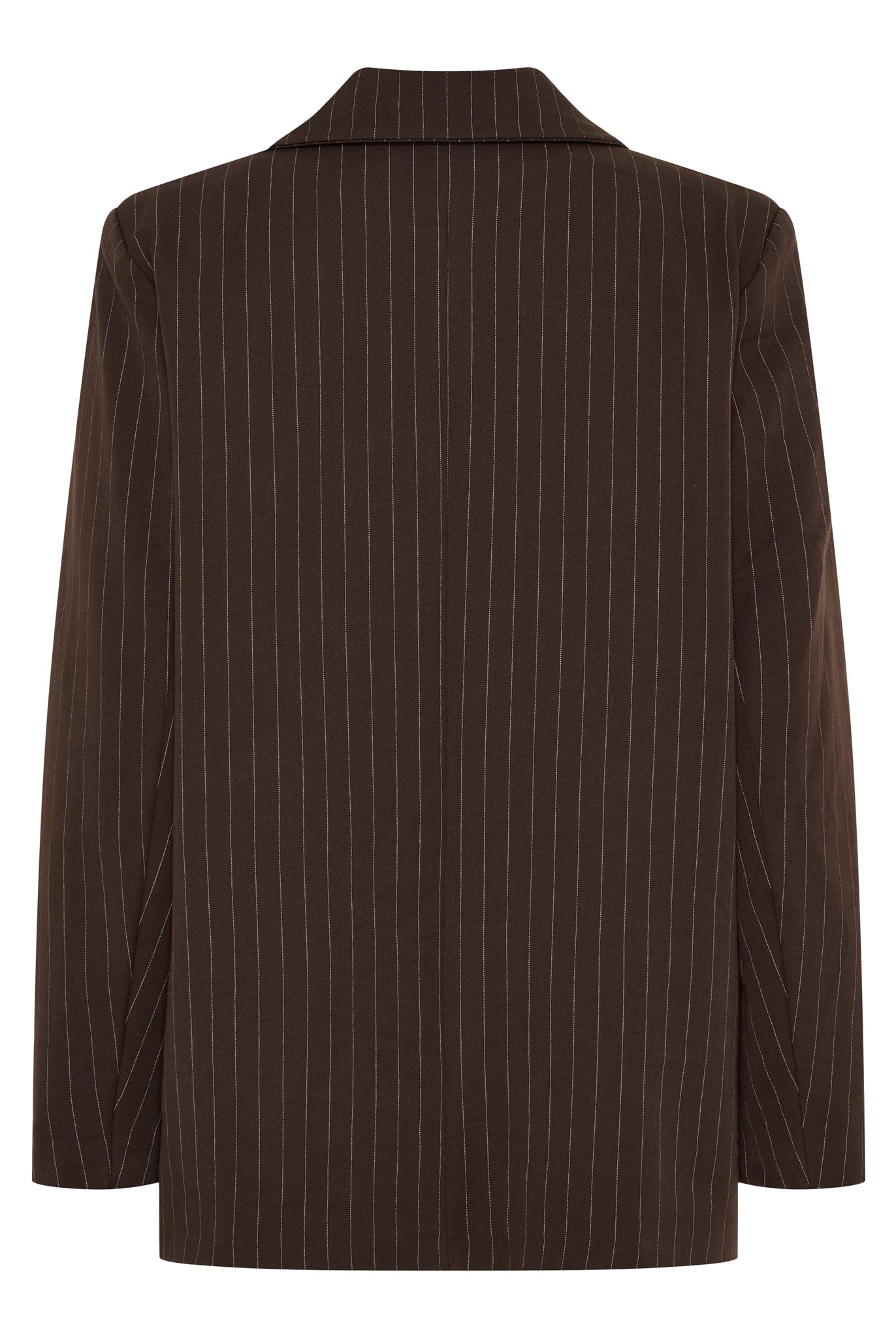 Denne klassiske blazer forener tidløst design med moderne komfort. Den let strukturerede metervare med fine, lodrette striber skaber et elegant udtryk, der både forlænger og flatterer silhuetten. Den enkeltstående knaplukning og de markante revers giver et skarpt og sofistikeret look, mens pasformen er let oversized for et afslappet, men stilfuldt udtryk.
