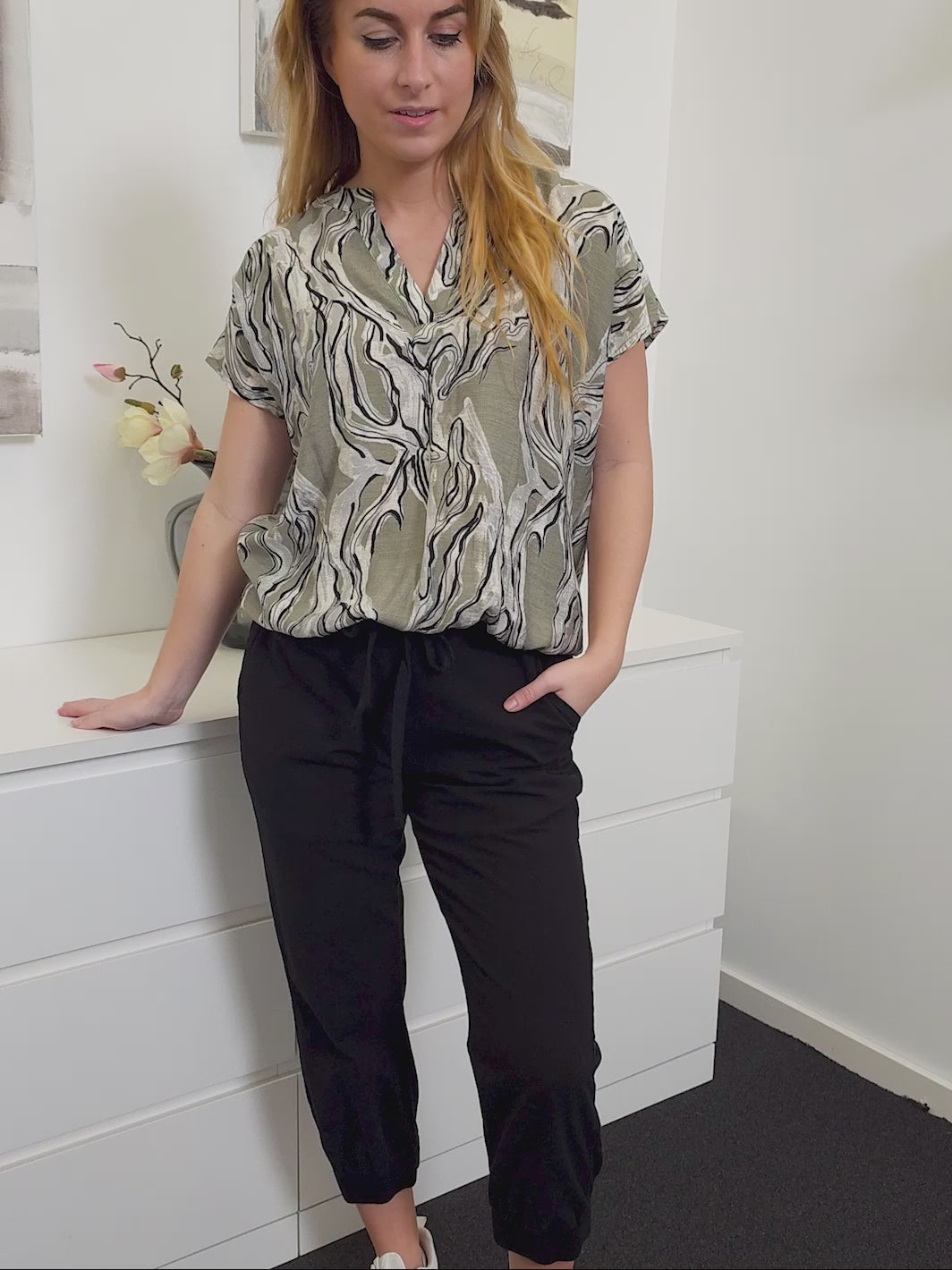 Top moderne pants fra Kaffe i en lækker capri model med elastik og bindesnore i livet. Buksen er fremstillet i et let materiale der er behageligt at have på og er let at kombinere med andre styles da de er i et flot stilrent design. Der er elastik for enden af buksebenene samt lommer i siderne. Perfekte til ethvert outfit.