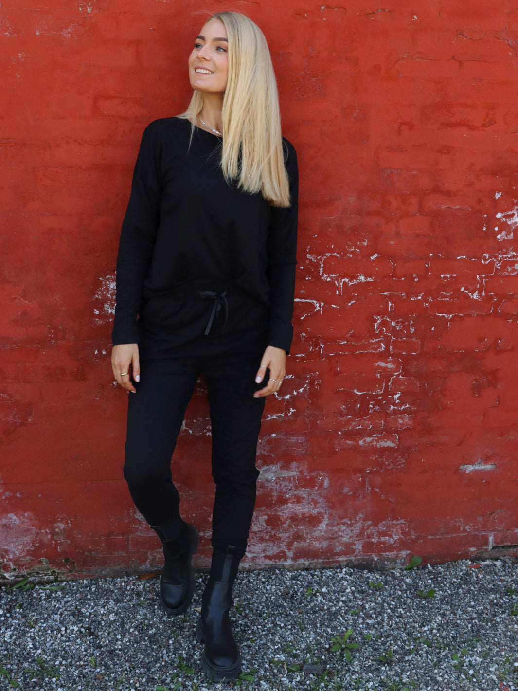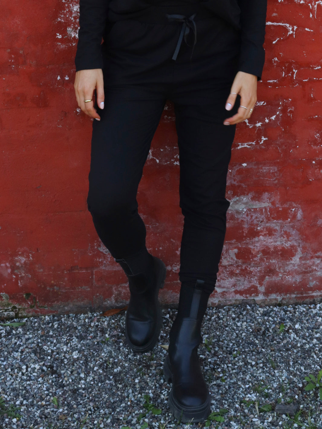 - Bløde fleecebukser med elastisk talje og justerbar snøre