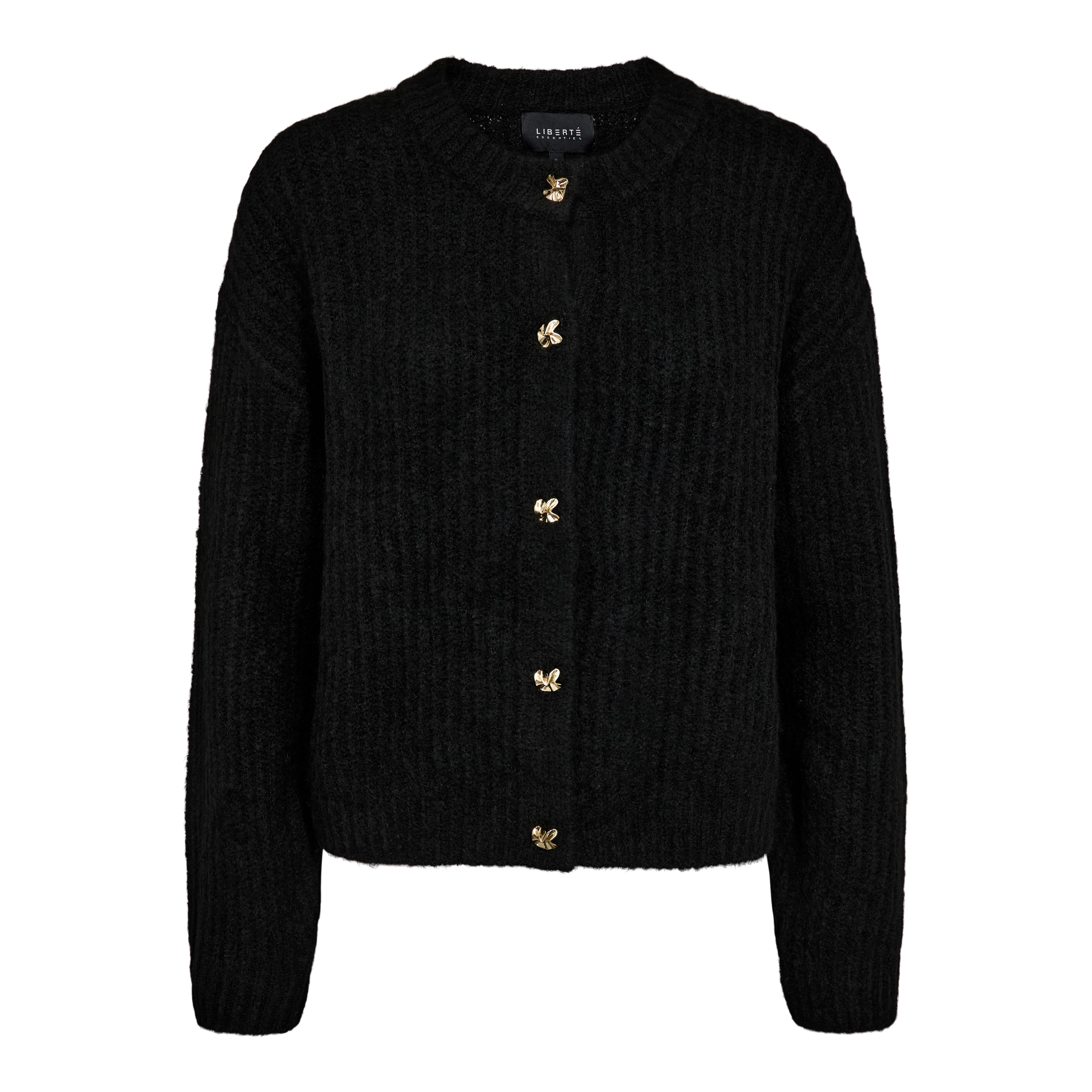 Cardiganen har rund hals, lange ærmer og en lige pasform med ribkanter, som giver en klassisk silhuet. De dekorative knapper foran i skinnende finish tilføjer et eksklusivt præg og gør modellen velegnet både til hverdagsbrug og pænere lejligheder.