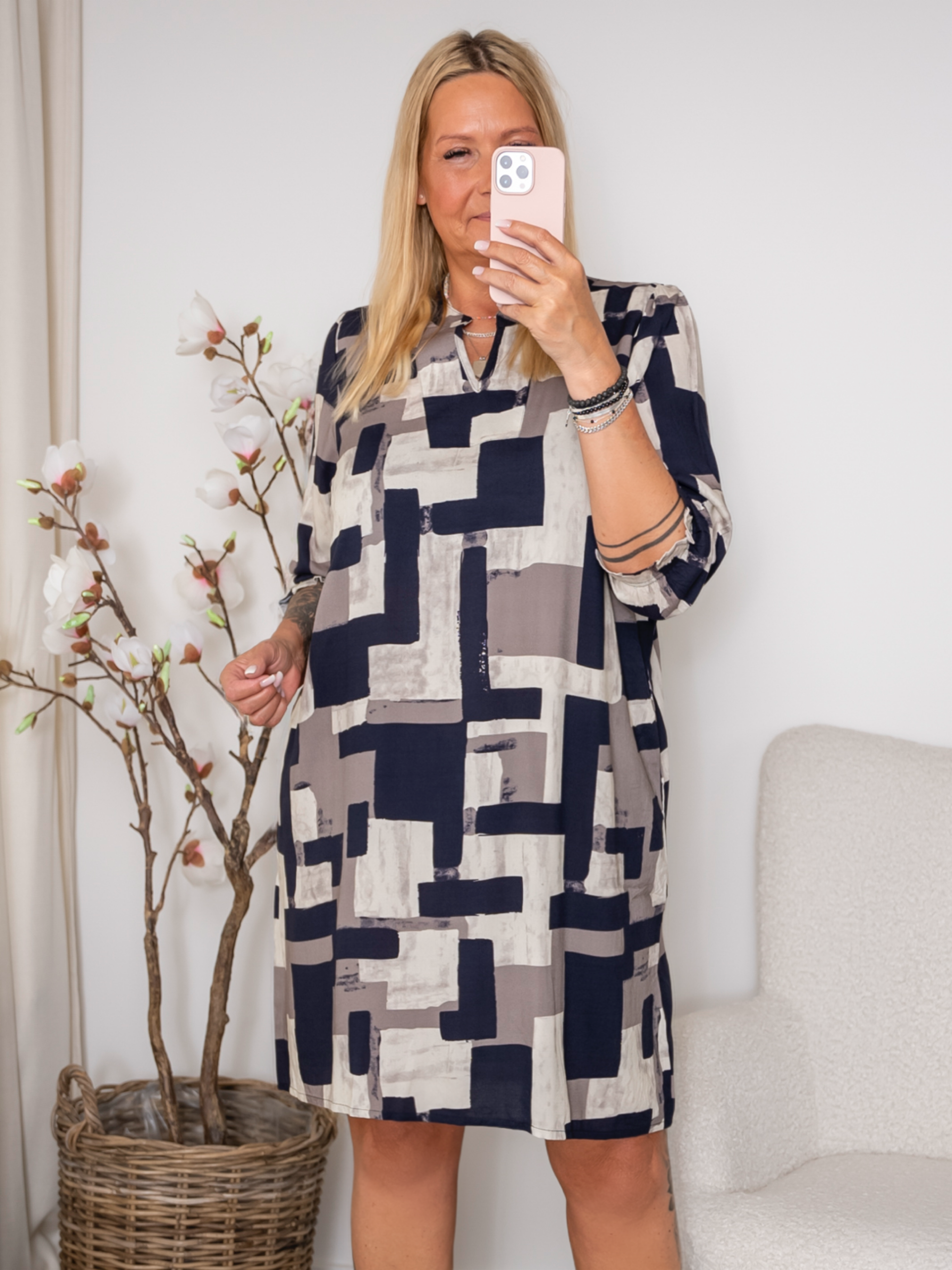 Denne kjole kombinerer et moderne grafisk print med en enkel og flatterende silhuet, som gør den både stilfuld og komfortabel. Det bløde stof falder let og skaber et feminint udtryk uden at stramme, og det stilrene design gør den perfekt til både hverdag og særlige lejligheder.