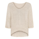 Trøjen har en flatterende rund halsudskæring og trekvartærmer, der gør den ideel til lag-på-lag looks eller som en selvstændig statement-stykke. Den høj-lav kant giver et sofistikeret twist til den klassiske striktrøje, hvilket gør den både alsidig og stilfuld.
