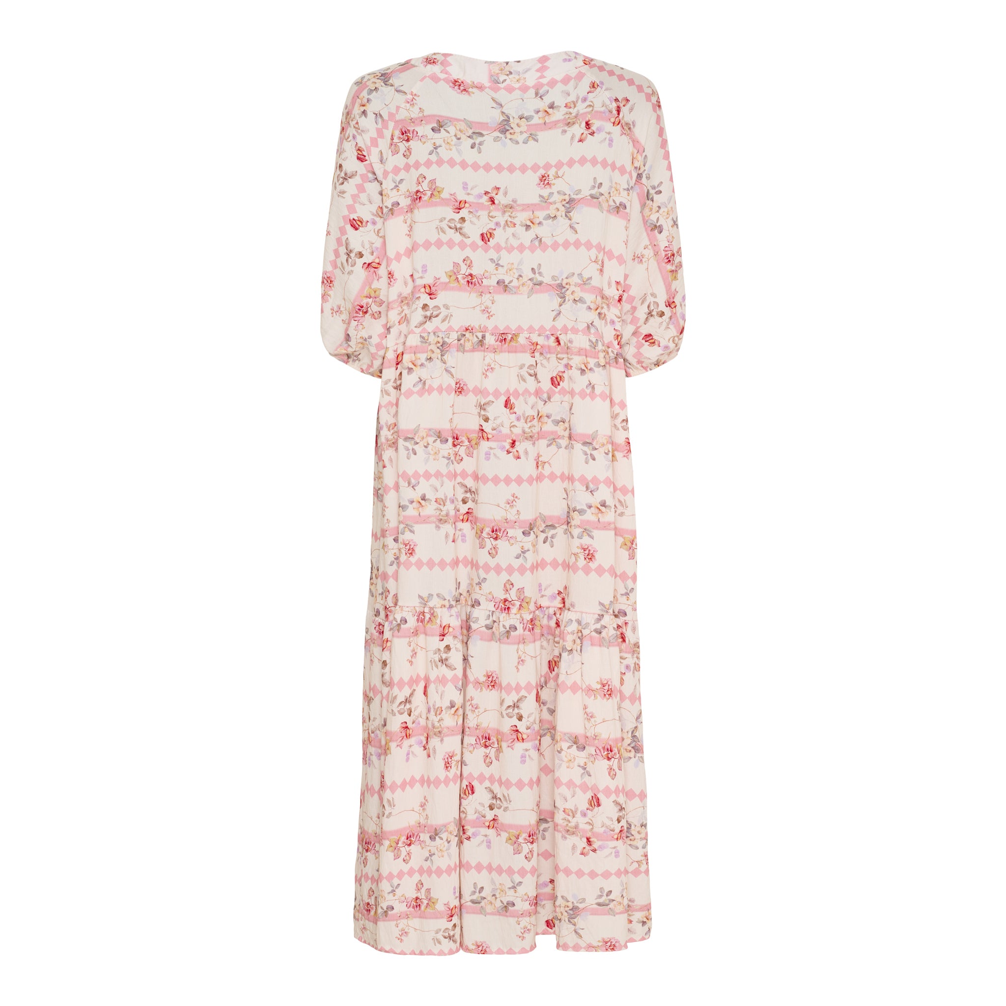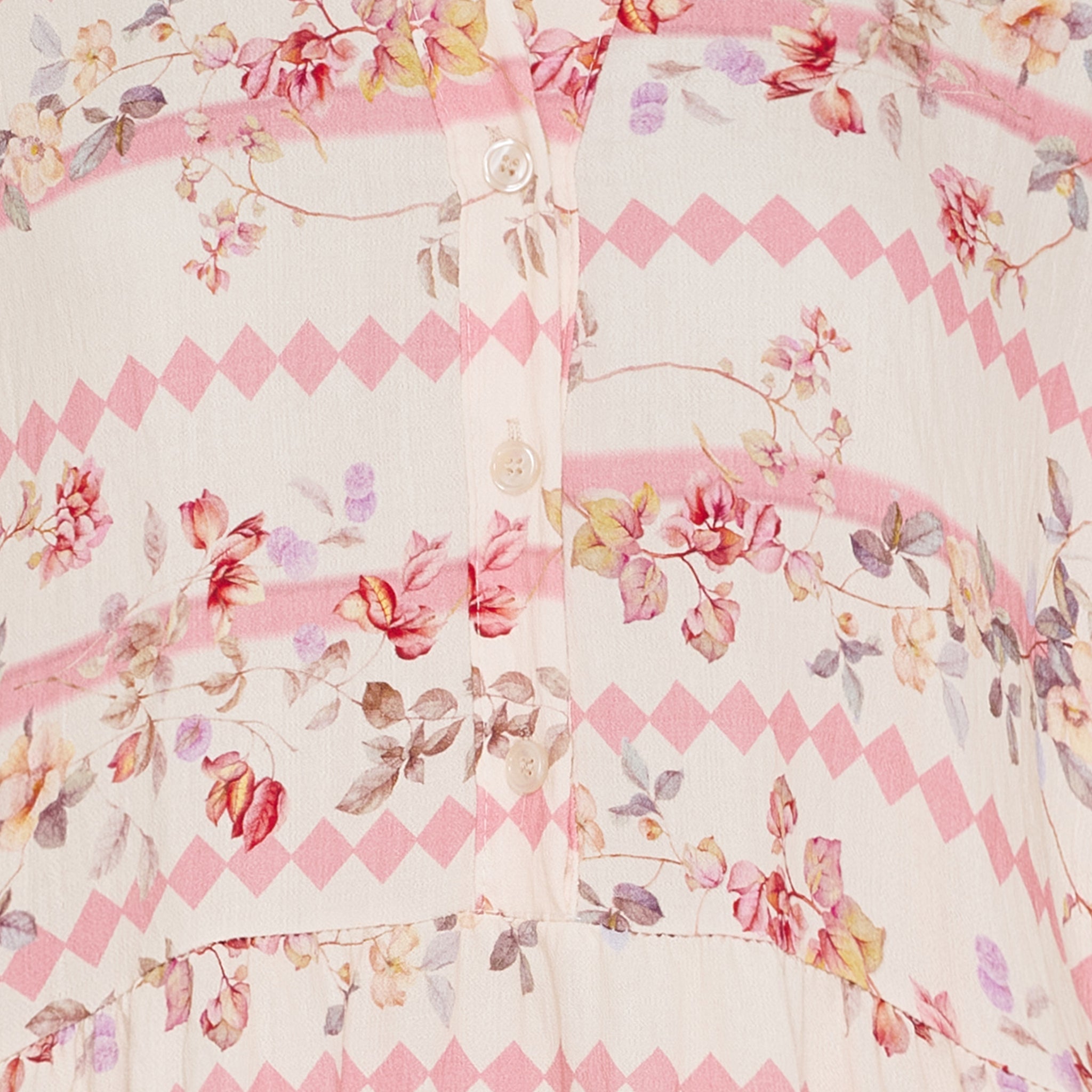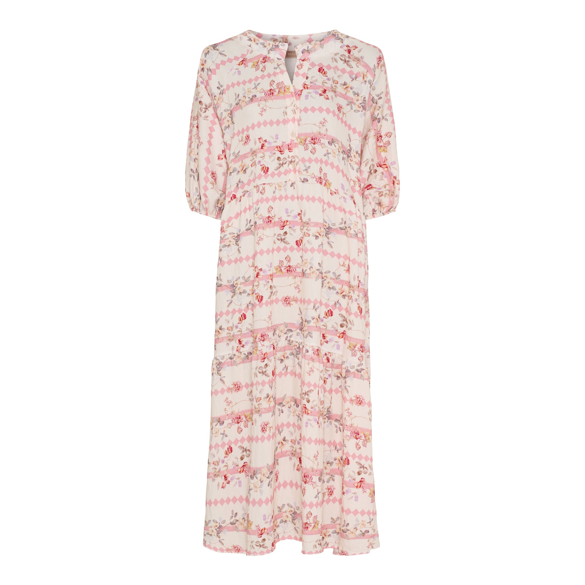 Kjolen har en fin V-udskæring med knapper og ærmer med let puf og elastik for ekstra komfort og stil. Det bløde print i florale og grafiske nuancer giver et feminint, men moderne udtryk.