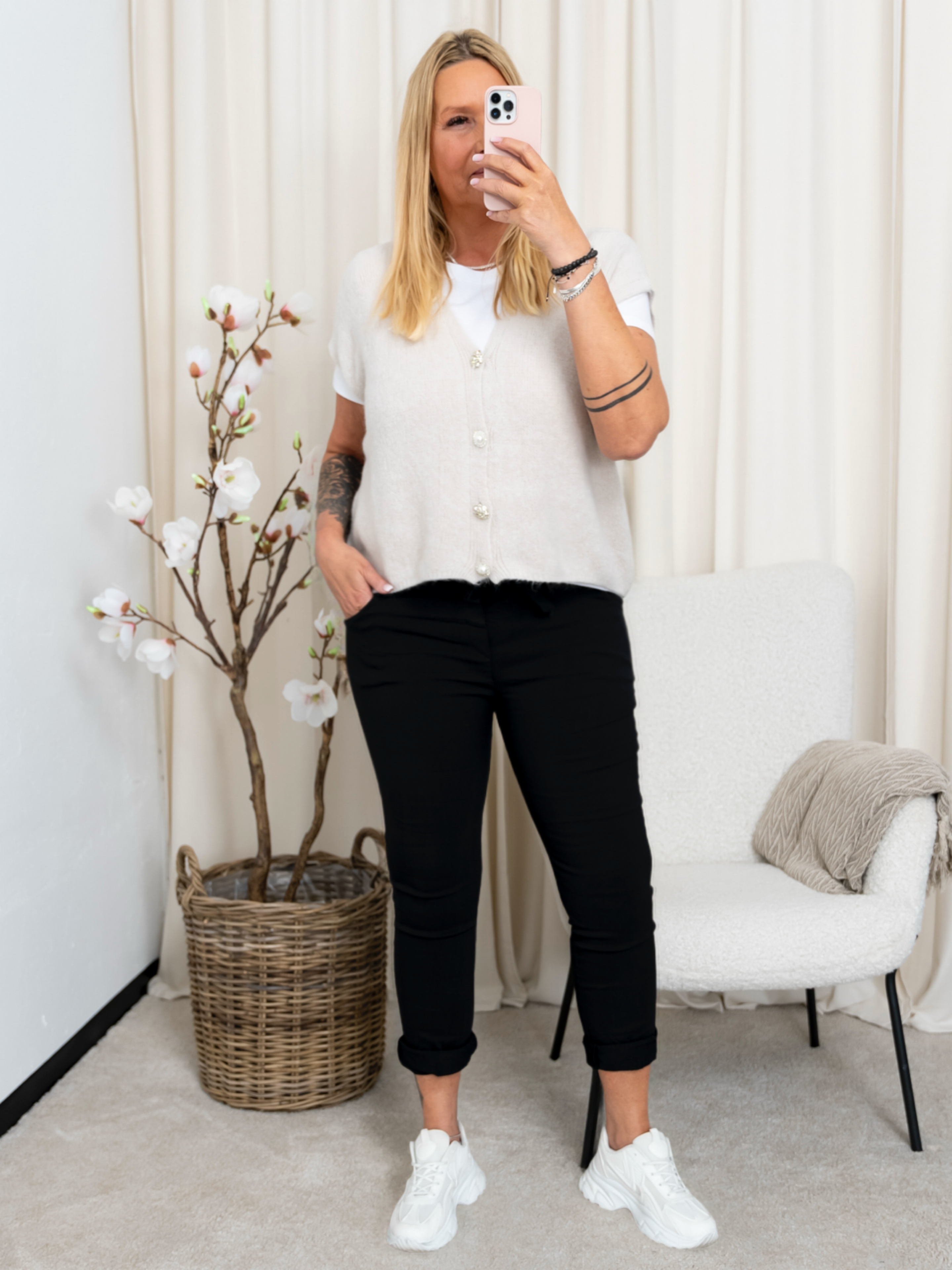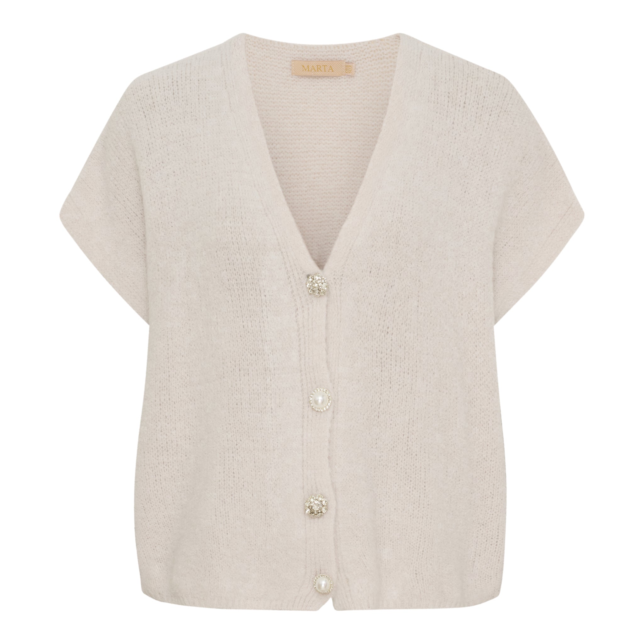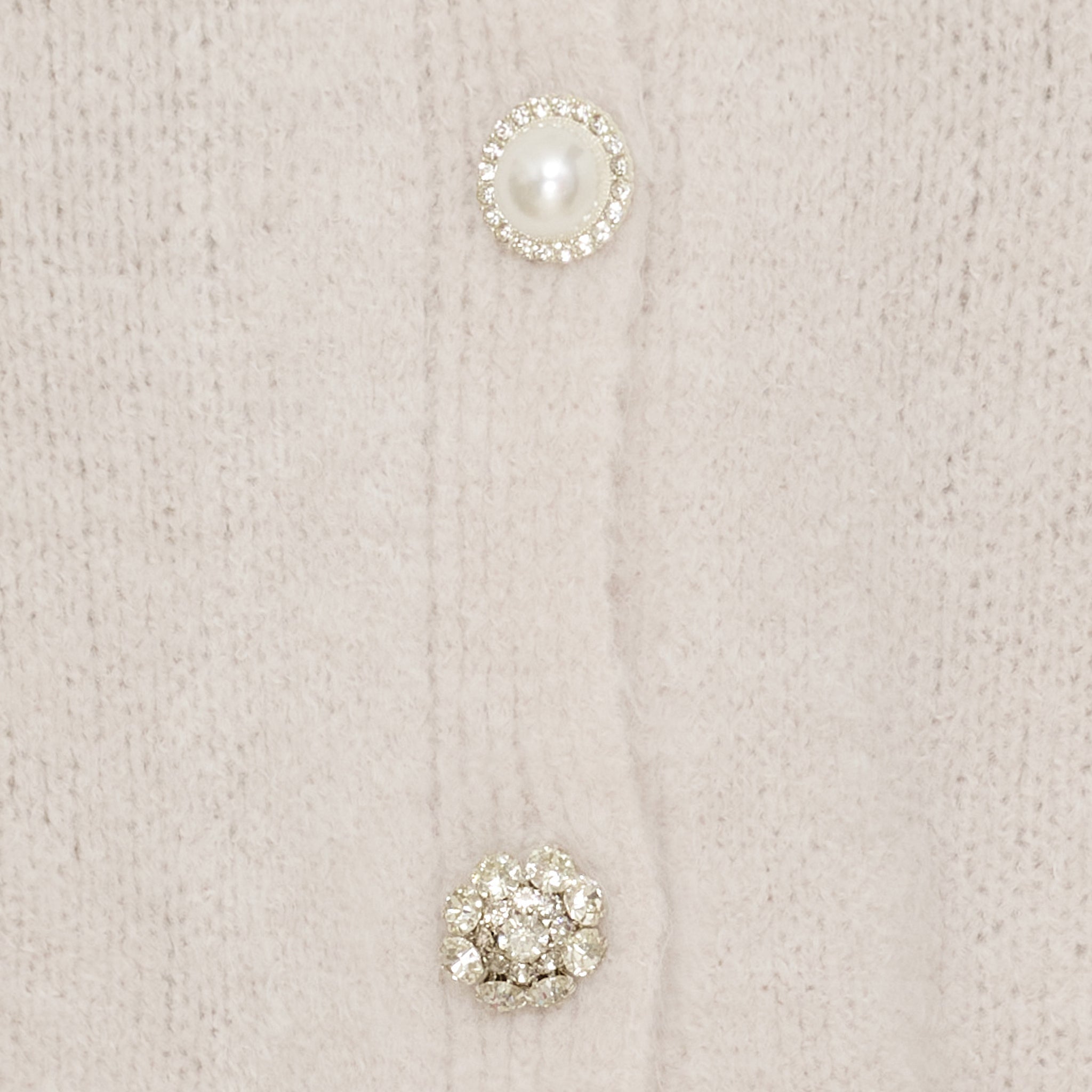 Knappenes smukke perle- og glimmerlook tilføjer et eksklusivt og feminint twist, der løfter hele outfittet. Brug den over en skjorte, en langærmet top eller alene for et sofistikeret og moderne udtryk.