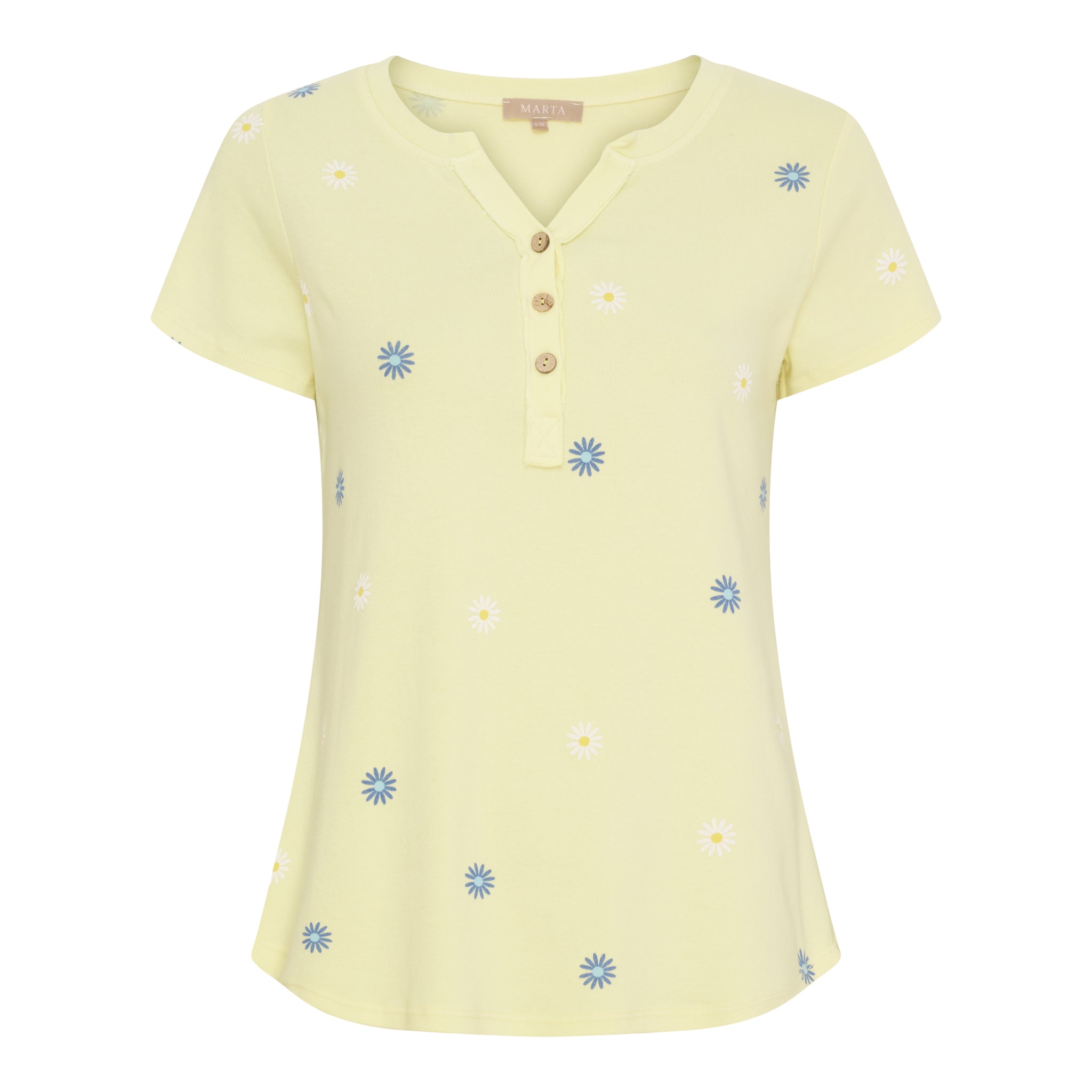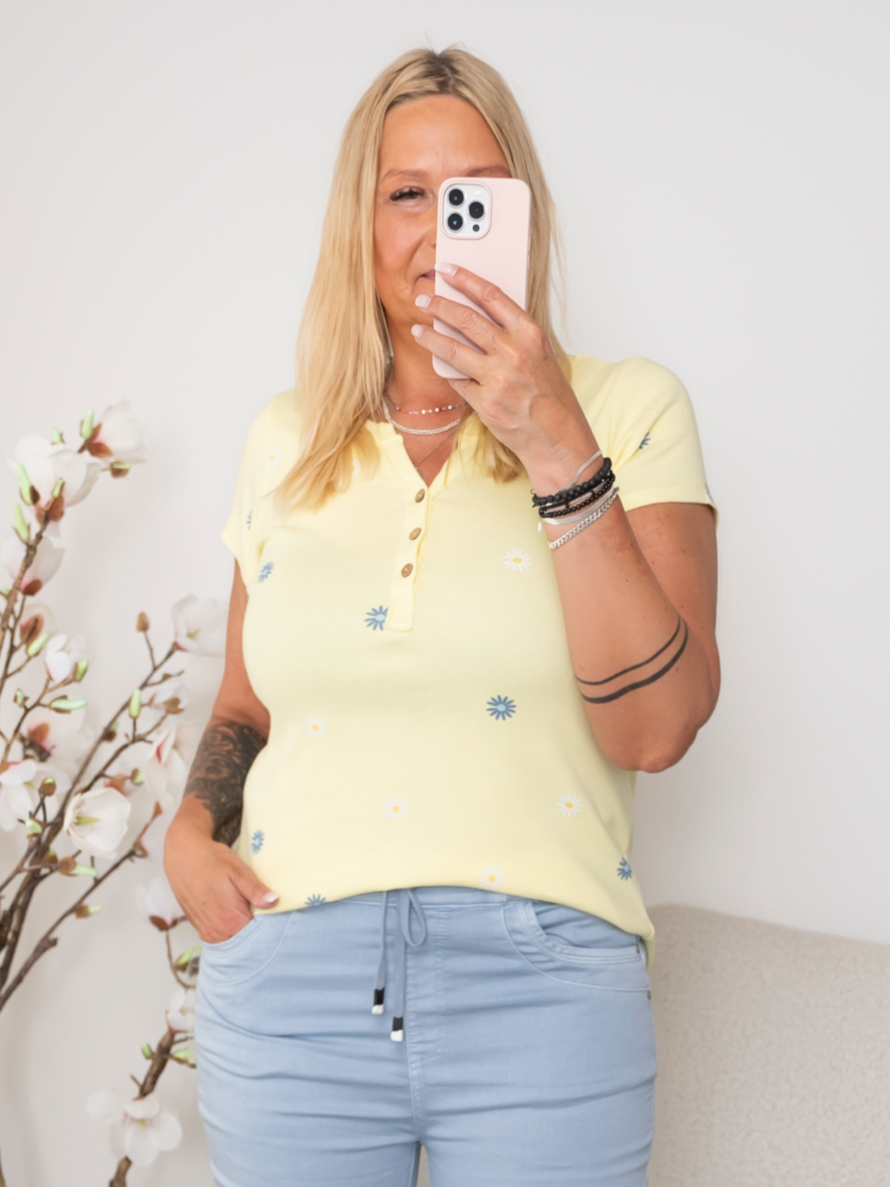 Denne skønne T-shirt oser af sommer, glæde og lethed – perfekt til dig, der elsker et feminint og legende udtryk i hverdagen. Med små, farverige blomster spredt over hele blusen og fine knapper foran, er det svært ikke at blive i godt humør, når man tager den på.