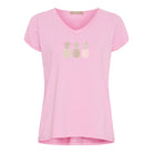 T-shirten har en klassisk V-udskæring og let opfoldede ærmer, som giver et feminint og casual udtryk. Den bløde bomuldskvalitet gør den behagelig at have på – både til hverdag, ferie eller en hyggelig dag derhjemme.