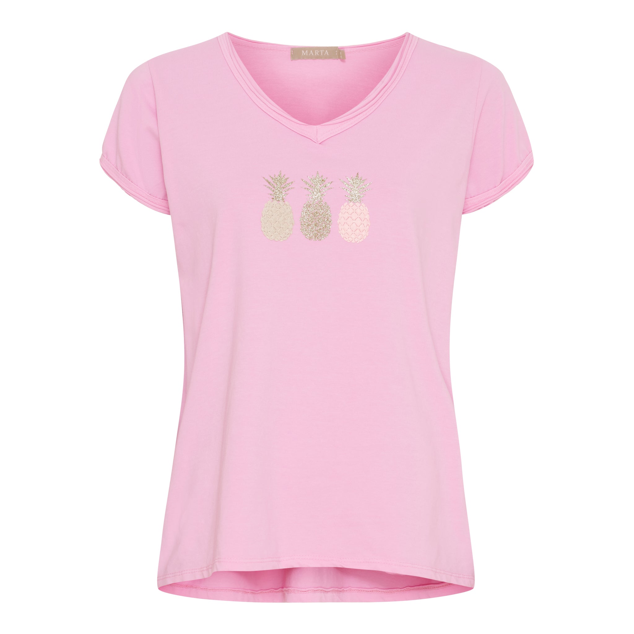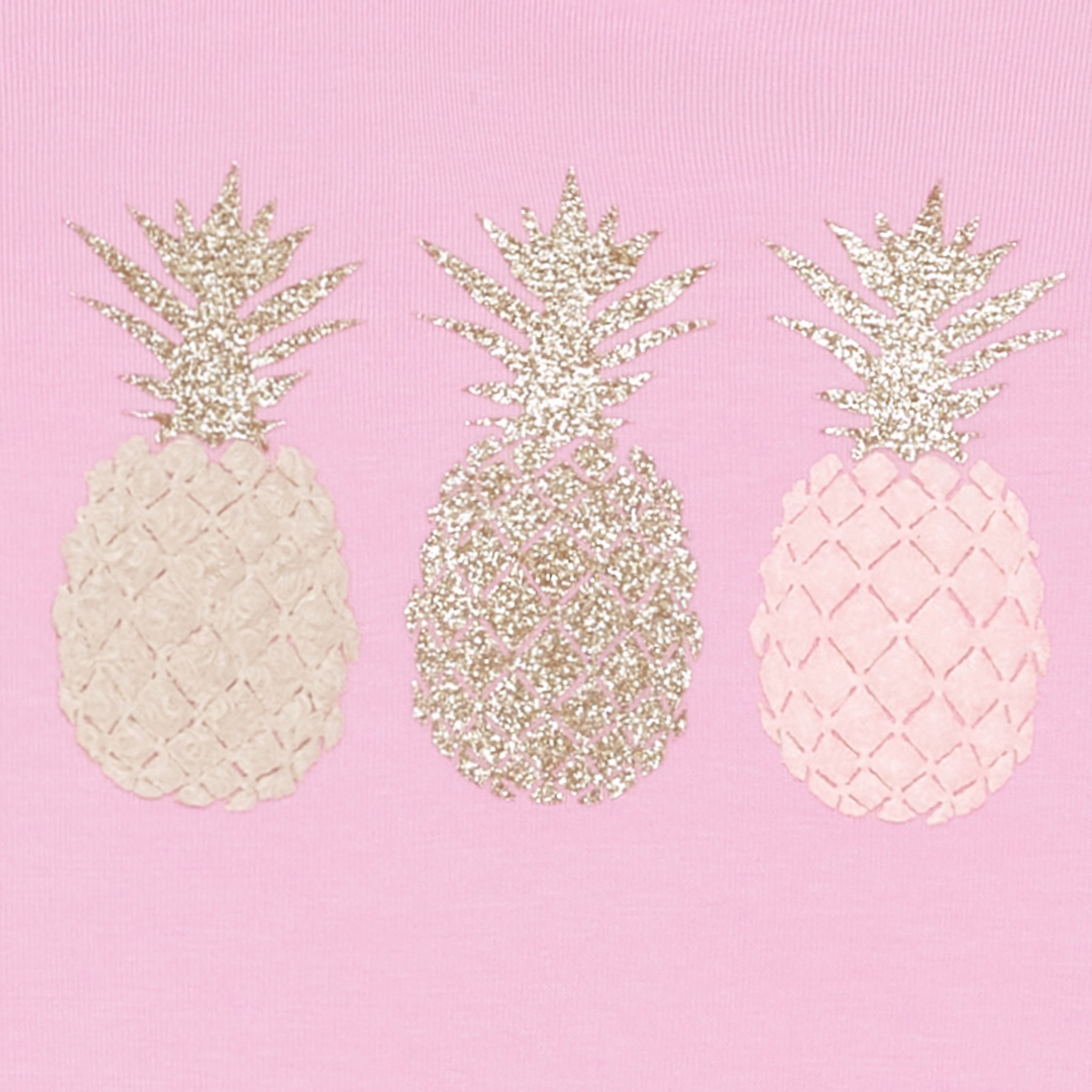 Tilføj lidt tropisk glæde og glimmer til din hverdag med denne søde og sjove T-shirt, der bringer sommerstemning året rundt. Med tre dekorative ananas i glitterprint på brystet er den perfekt til dig, der elsker et afslappet look med et legende twist.