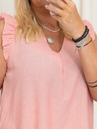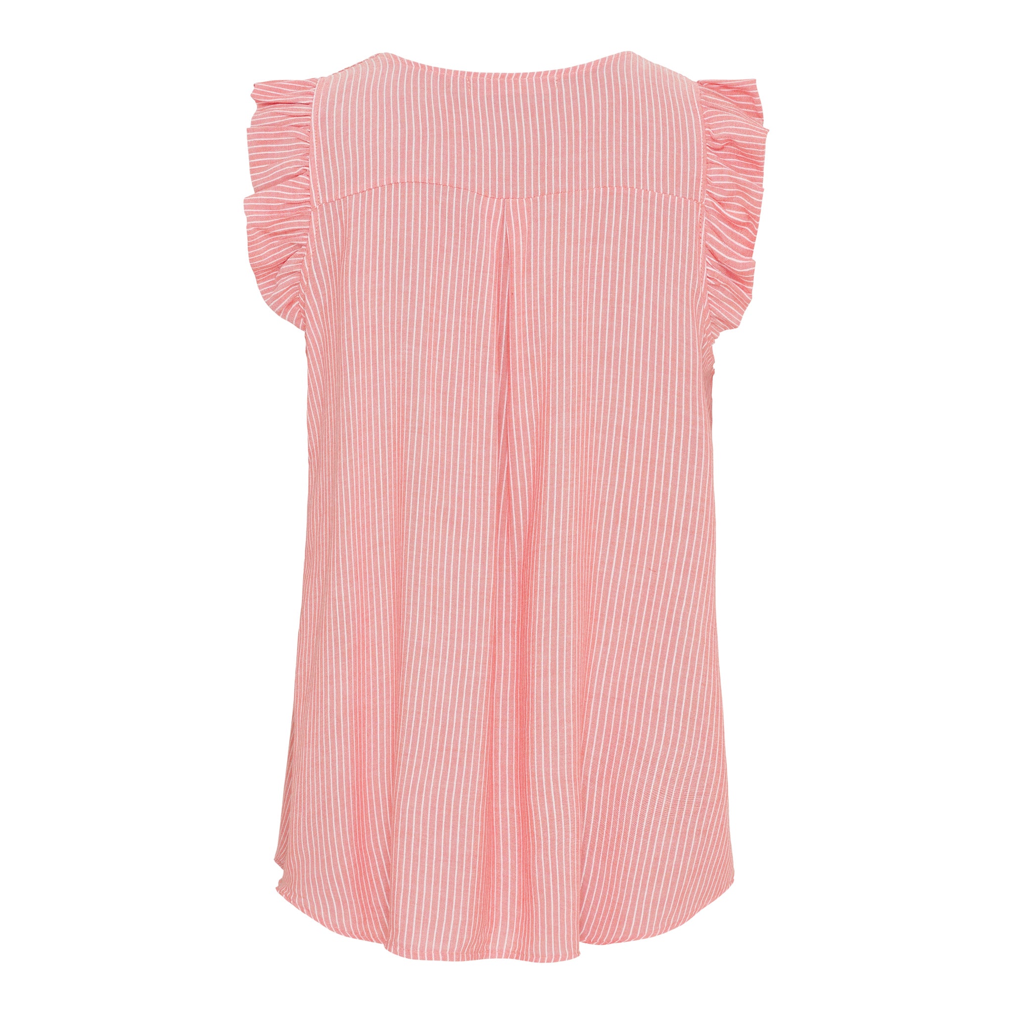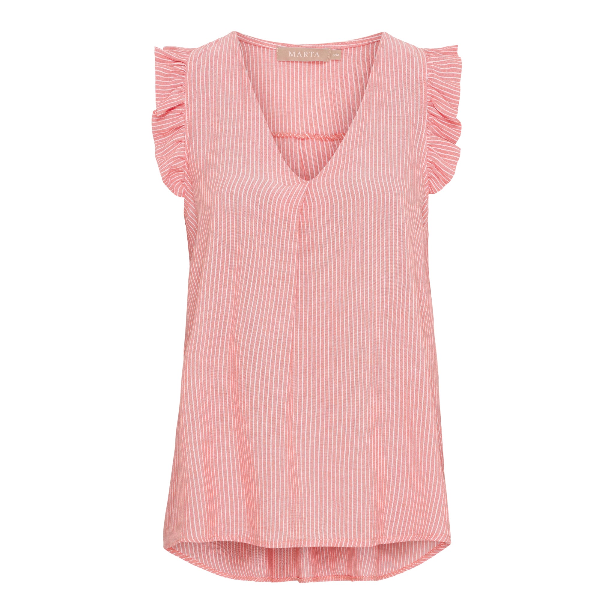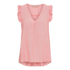 Gør dig klar til solrige dage med denne lette og feminine top, der kombinerer klassisk strib med moderne detaljer. Den ærmeløse pasform og V-udskæring giver et luftigt og elegant look, mens de små flæser ved skuldrene tilføjer et sødt og stilfuldt touch.