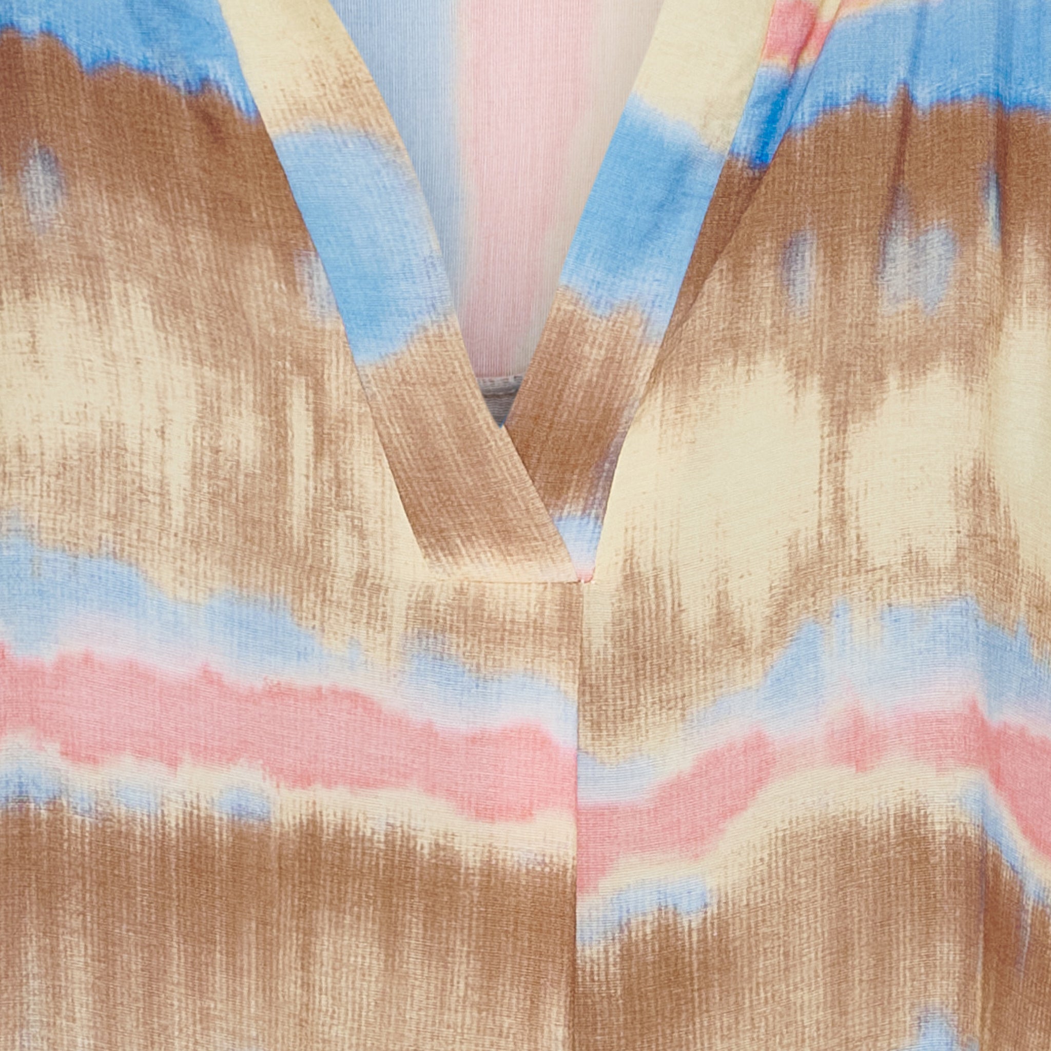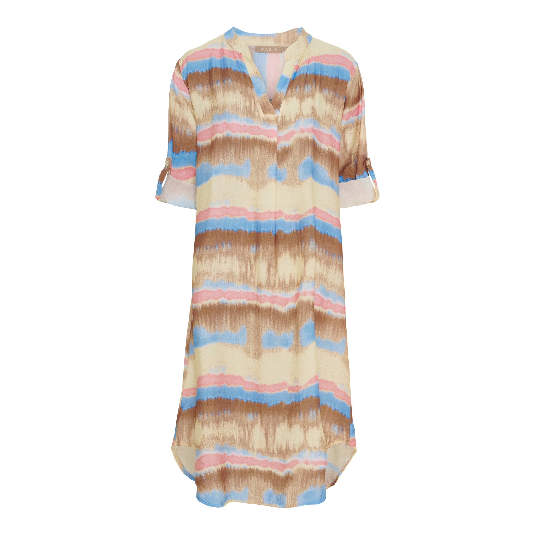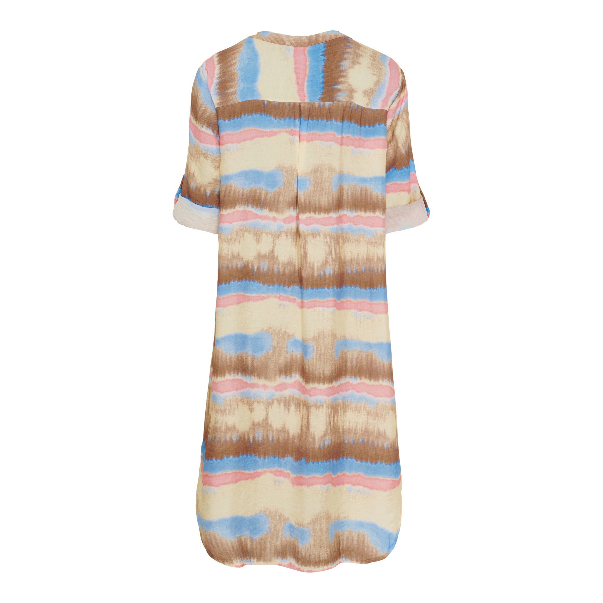Lad farverne tale med denne unikke kjole, der kombinerer bløde pasteltoner med et kunstnerisk stribet mønster. Den løse og luftige pasform gør den ideel til varme dage, hvor komfort og stil går hånd i hånd.
