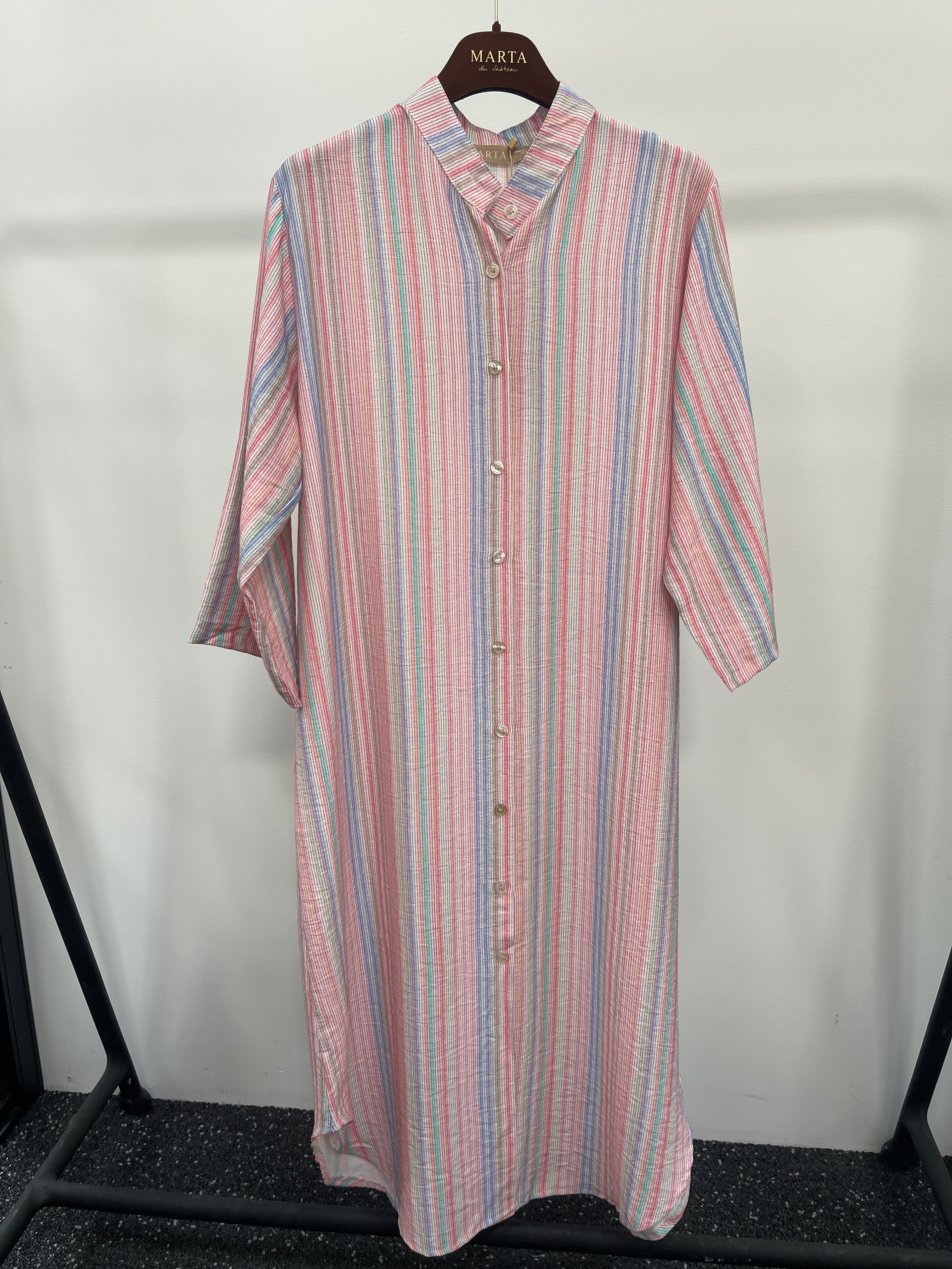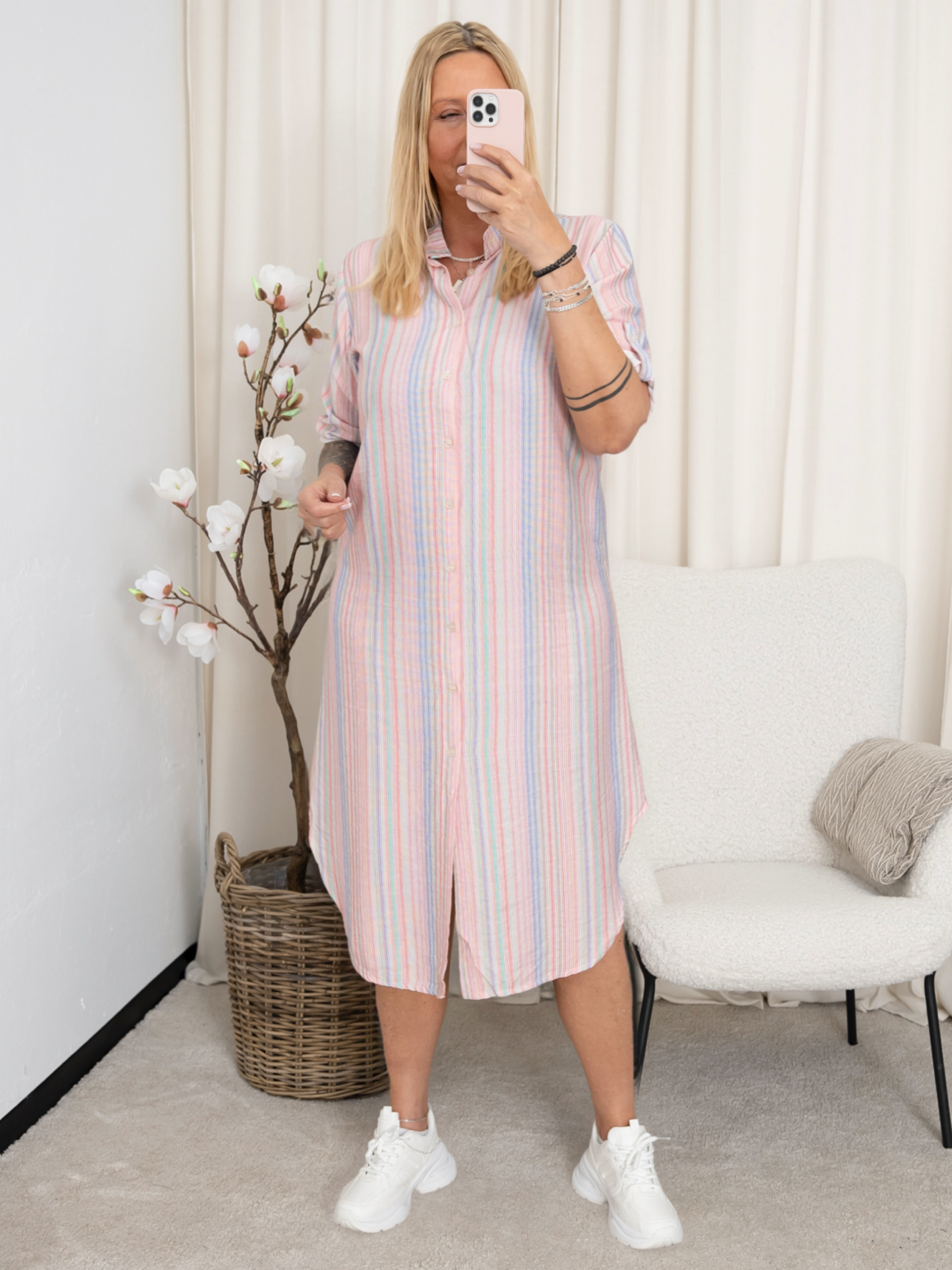 Denne kjole er et skønt valg til dig, der elsker et farverigt, afslappet og sommerligt look. De fine striber i flere nuancer giver et frisk udtryk, mens den lette kvalitet og løse pasform sikrer, at du føler dig godt tilpas hele dagen.