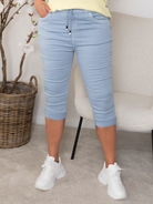 Disse capribukser er et must-have til sæsonens varme dage! De har en flatterende længde under knæet, elastisk talje og et praktisk bindebånd, som sikrer optimal komfort hele dagen.