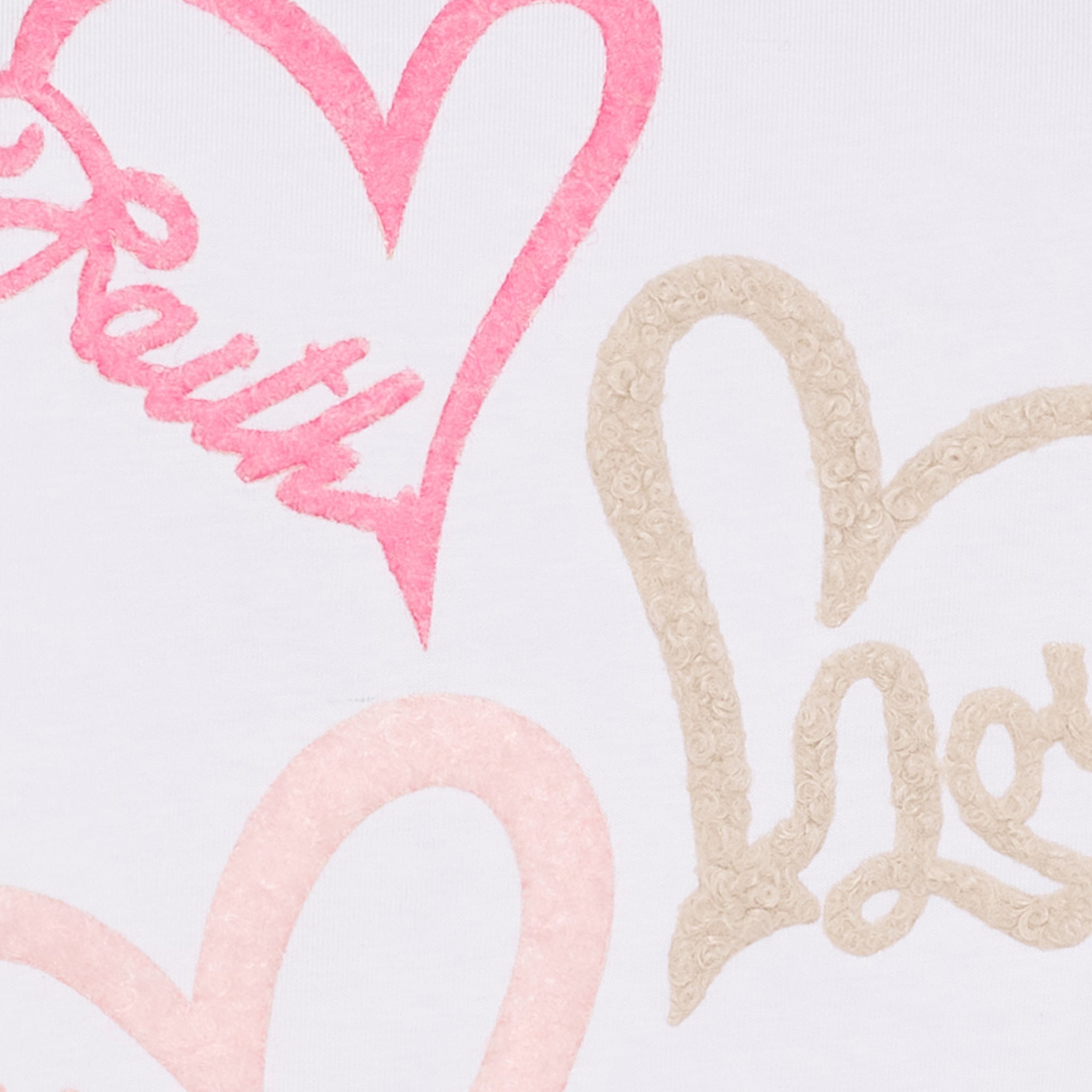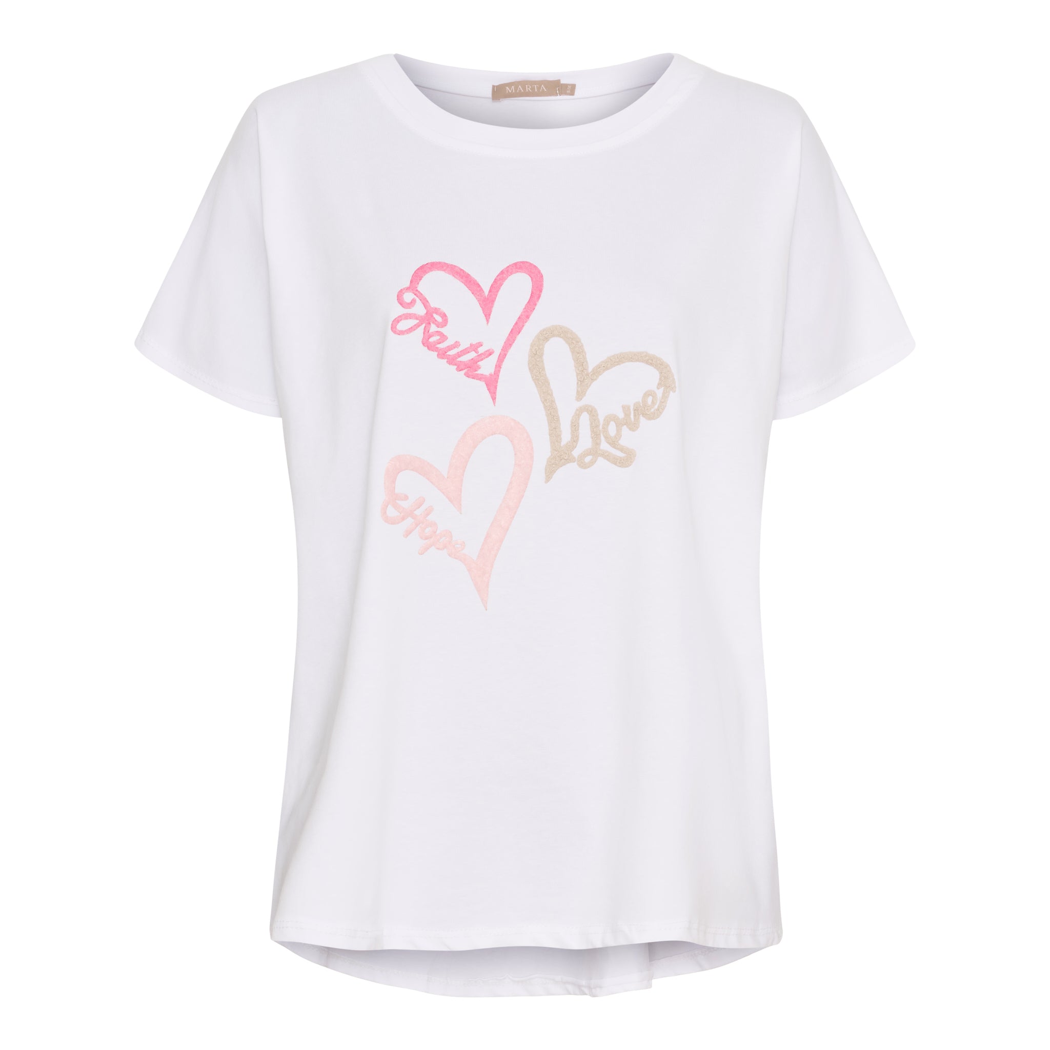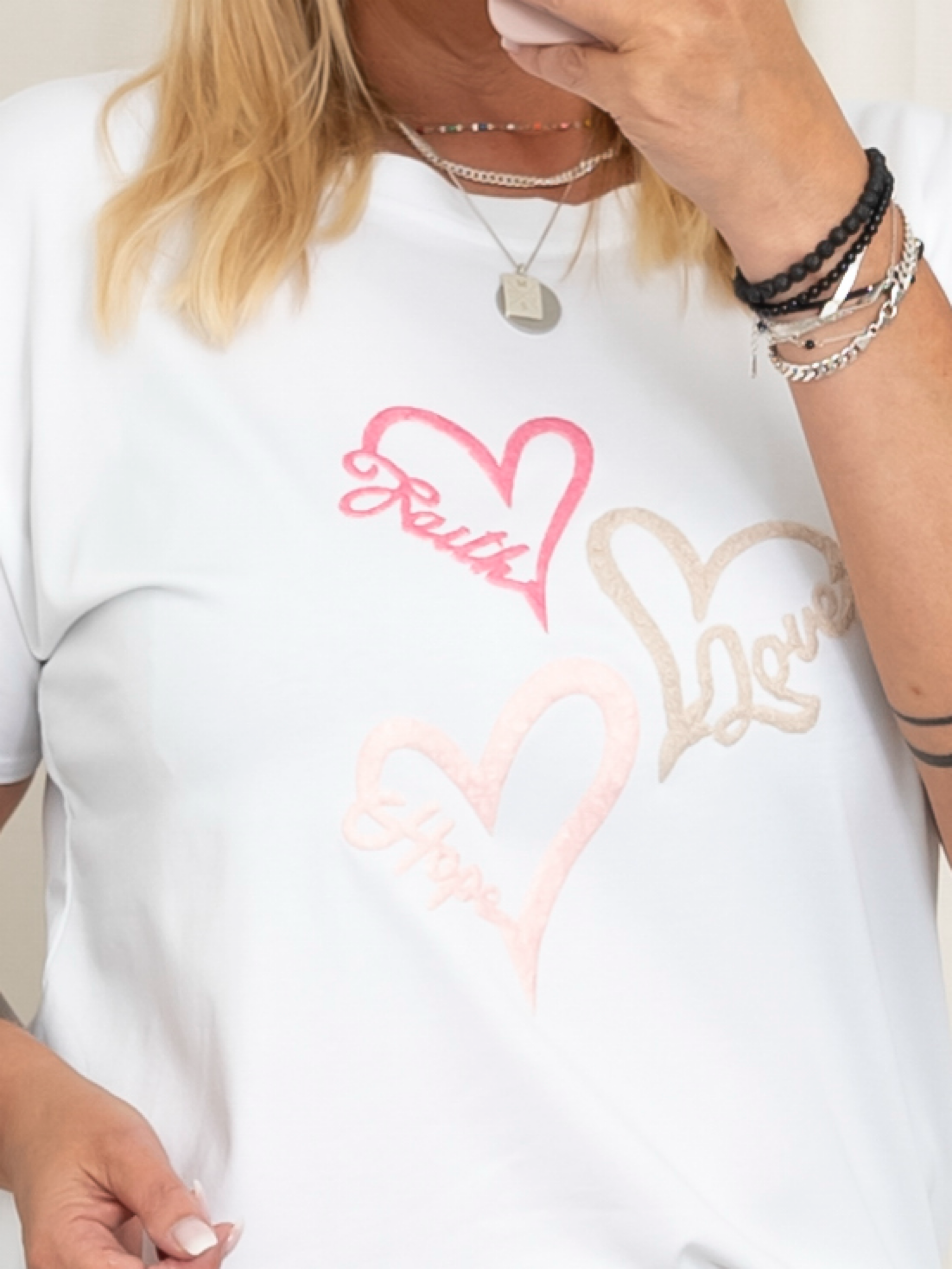 Enkel, sød og med masser af mening – denne t-shirt spreder positiv energi med sit fine print af hjerter og budskaber som faith, hope og love. Lavet i en blød og let bomuldskvalitet, der gør den skøn at have på hele dagen – perfekt til både hverdagslook og afslappede weekendoutfits.