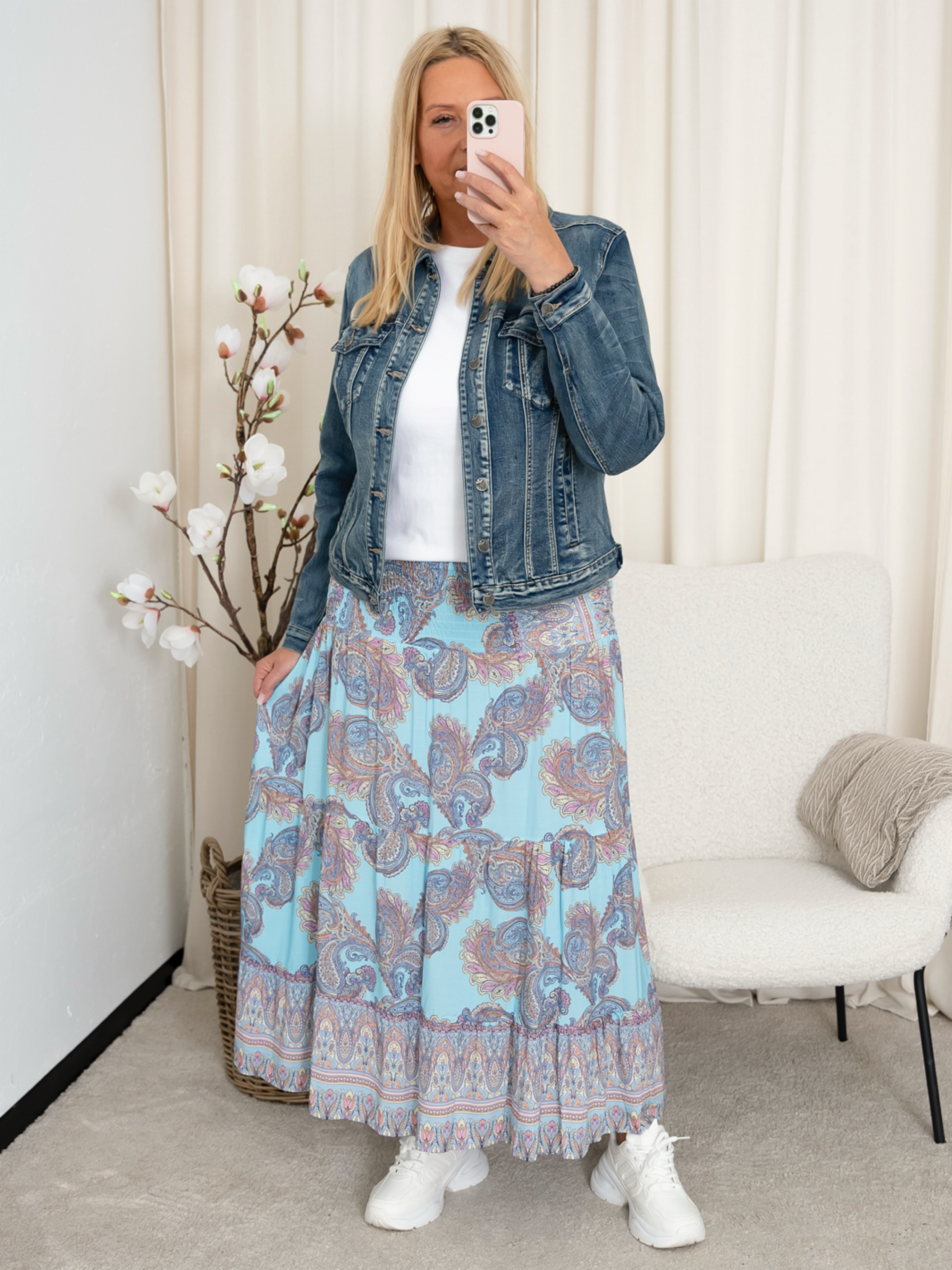 Oplev en farverig og bohemeinspireret stil med denne smukke, mønstrede nederdel. Denne lange nederdel er designet til at give dig et levende og feminint look, perfekt til både hverdag og festlige lejligheder. Fremstillet af let og luftig viskose, sikrer den maksimal komfort og bevægelsesfrihed hele dagen.