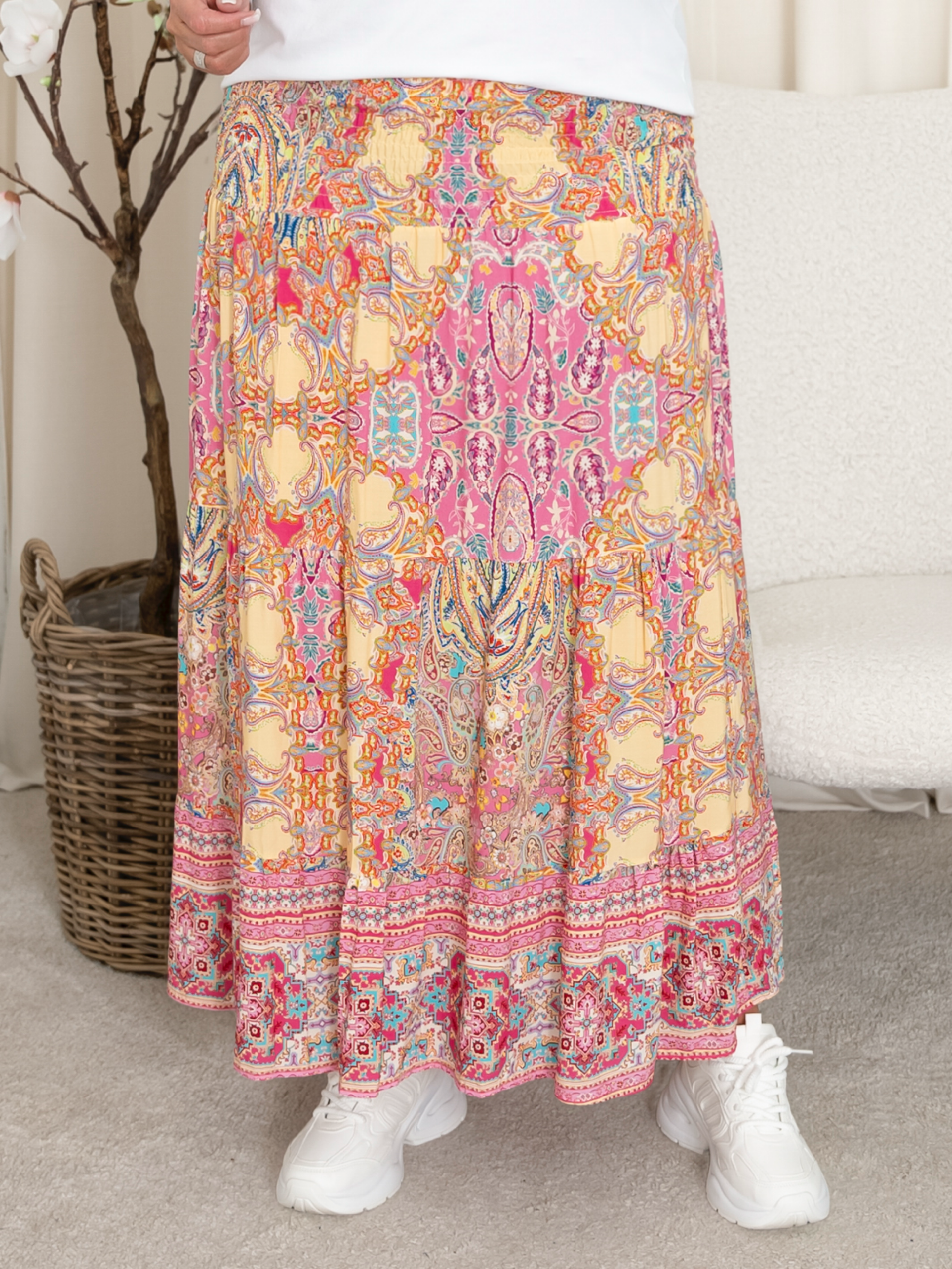 Oplev en farverig og bohemeinspireret stil med denne smukke, mønstrede nederdel. Denne lange nederdel er designet til at give dig et levende og feminint look, perfekt til både hverdag og festlige lejligheder. Fremstillet af let og luftig viskose, sikrer den maksimal komfort og bevægelsesfrihed hele dagen.