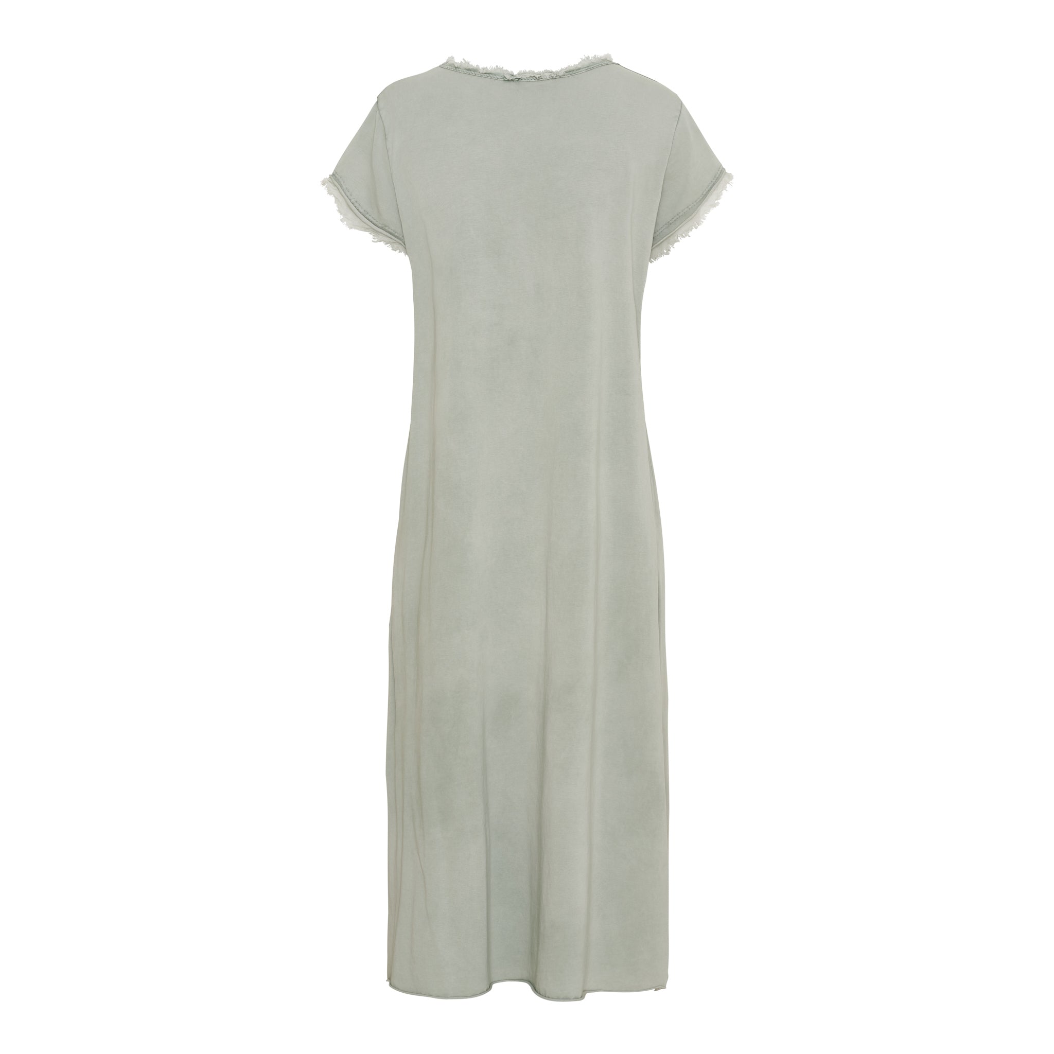 Kjolen har korte ærmer med rå kanter, en let V-udskæring og slidser i begge sider, som gør den ekstra behagelig at bevæge sig i. Det lange, lige snit giver en afslappet silhuet, der er nem at style både til hverdag og ferie.