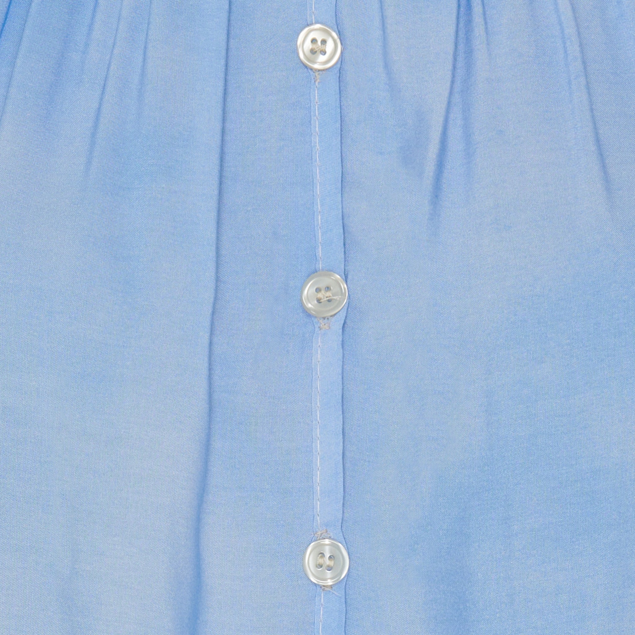 Toppen har en løs pasform med elastik i halsudskæringen og dekorative knapper foran, som tilføjer et feminint touch uden at være for meget. Den er let at style både til hverdag og ferie – med shorts, en nederdel eller dine yndlingsjeans.