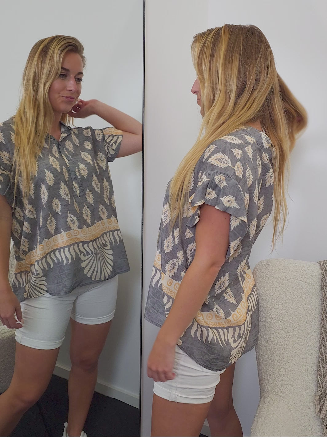 Skøn bluse fra Marta du Chateau med små flæseærmer og knapstolpe i udskæringen samt et fint mønsterprint i stoffet.