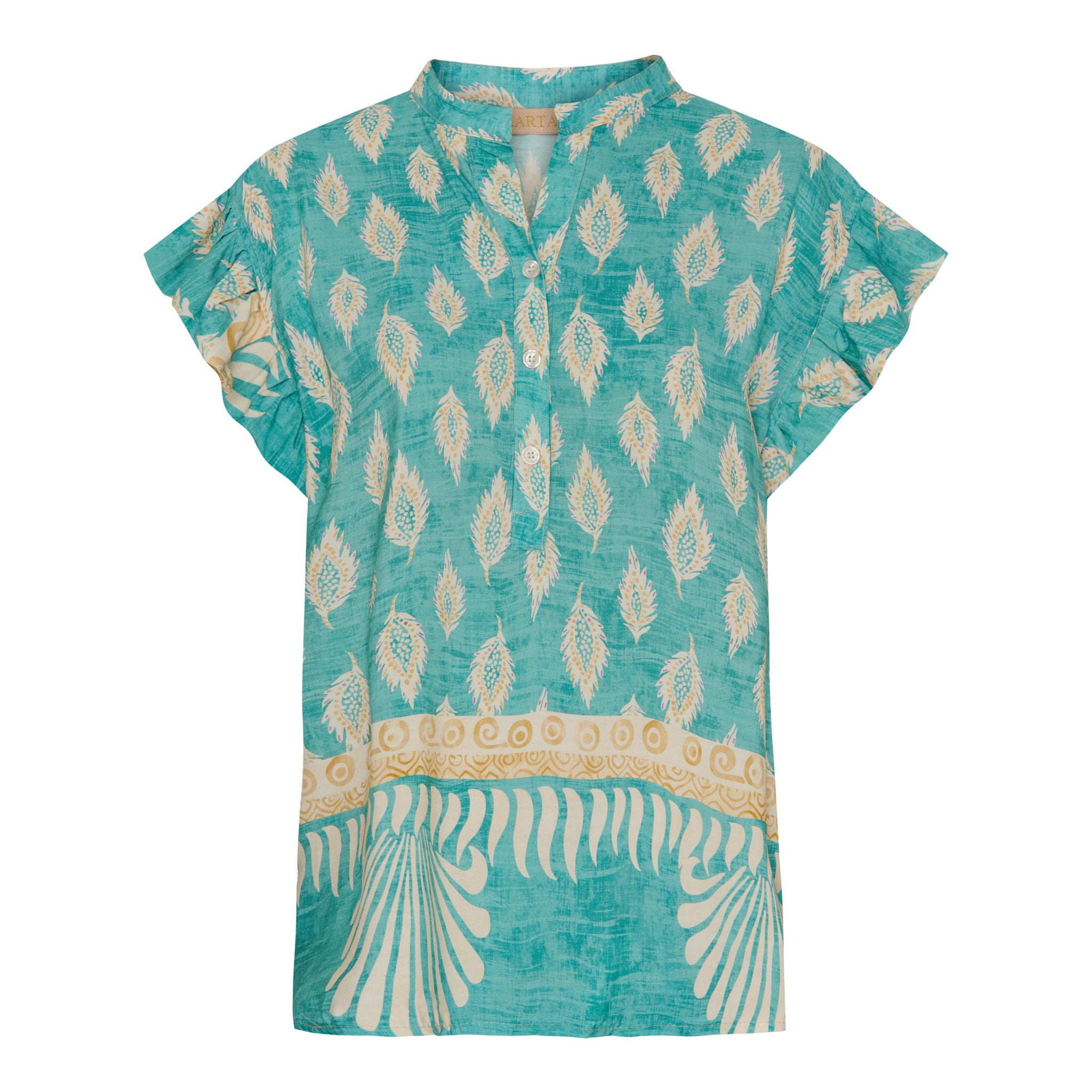 Blusen har korte, let rynkede ærmer og en åben stolpelukning med små knapper, der giver en casual, men feminin finish. Den er skøn at have på – både til varme sommerdage eller lag-på-lag til de køligere tider.
