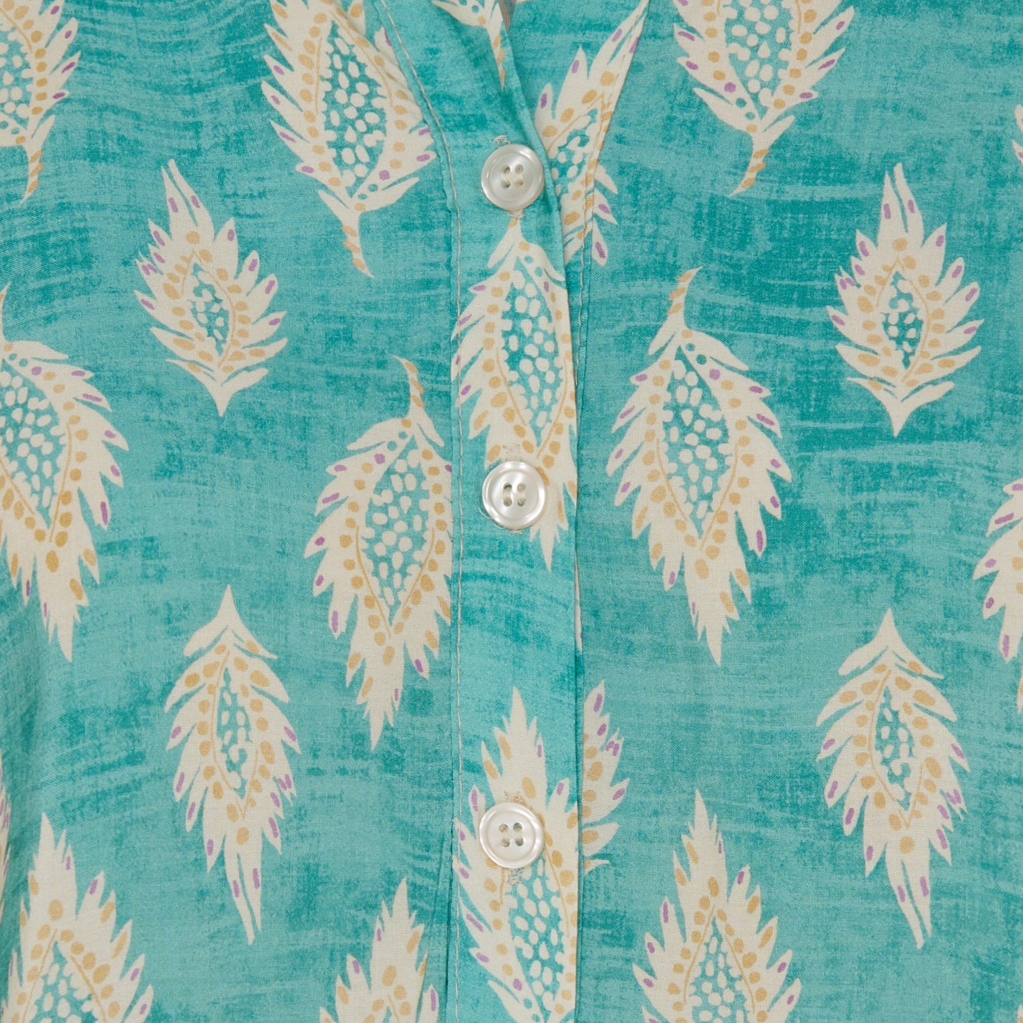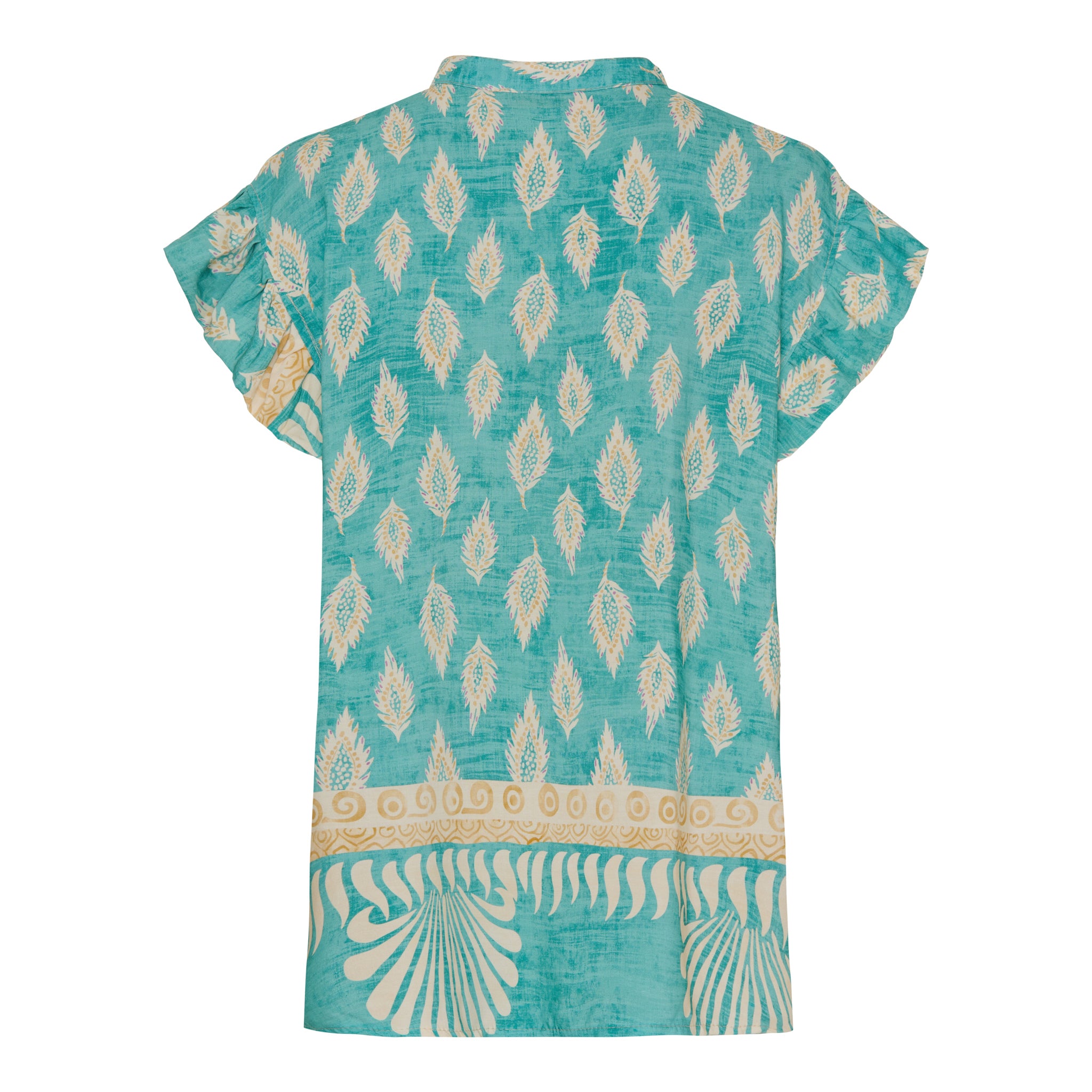 Bring naturens farver og bohemestemning ind i din garderobe med denne smukke og luftige bluse. Med sit fine bladprint og de dekorative bånd og kanter, får du et unikt og levende udtryk, som både er stilfuldt og afslappet.