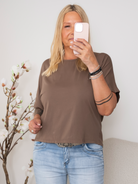Den bløde bomuldsblanding føles behagelig mod huden, og den lette vidde i ærmerne tilføjer både komfort og et moderne touch.