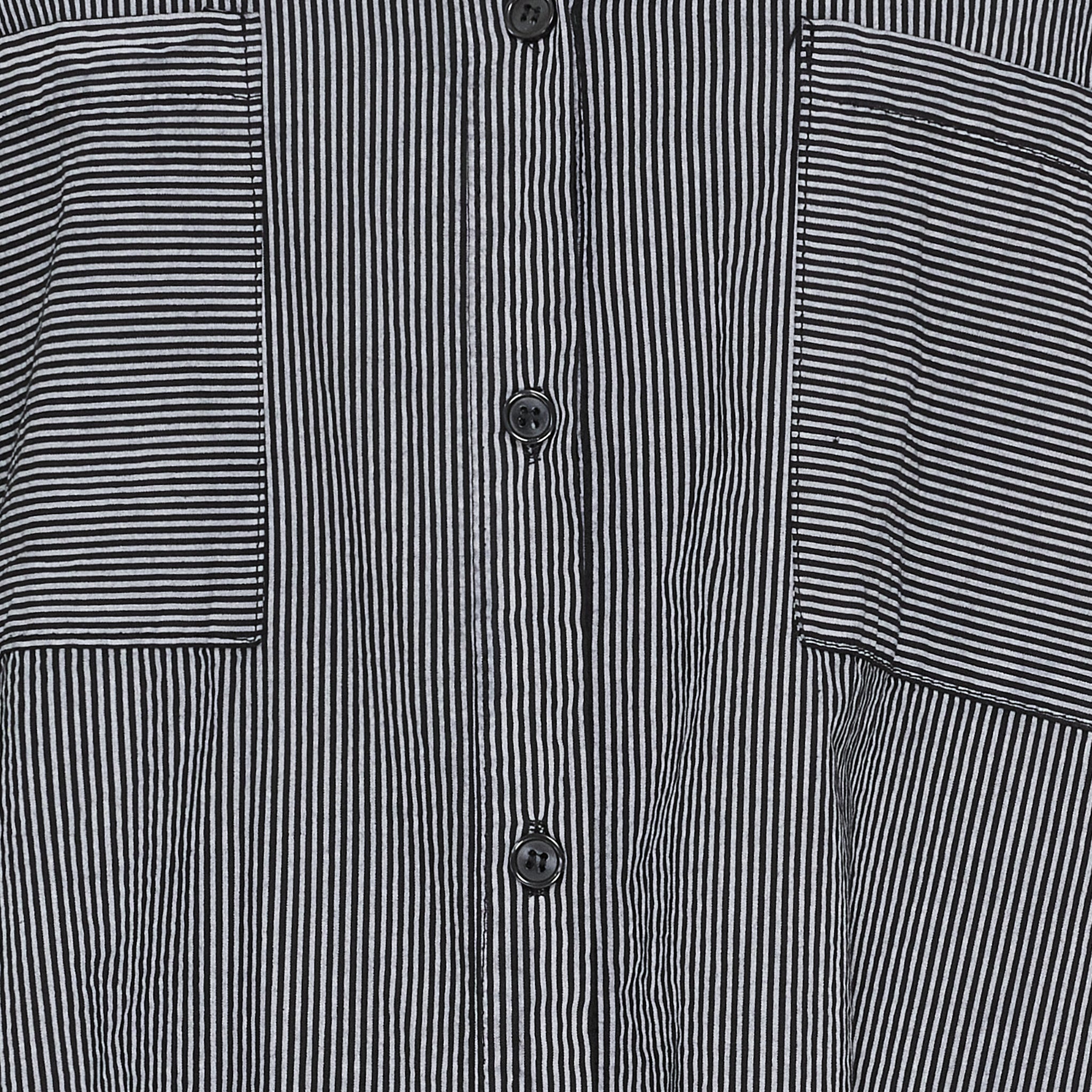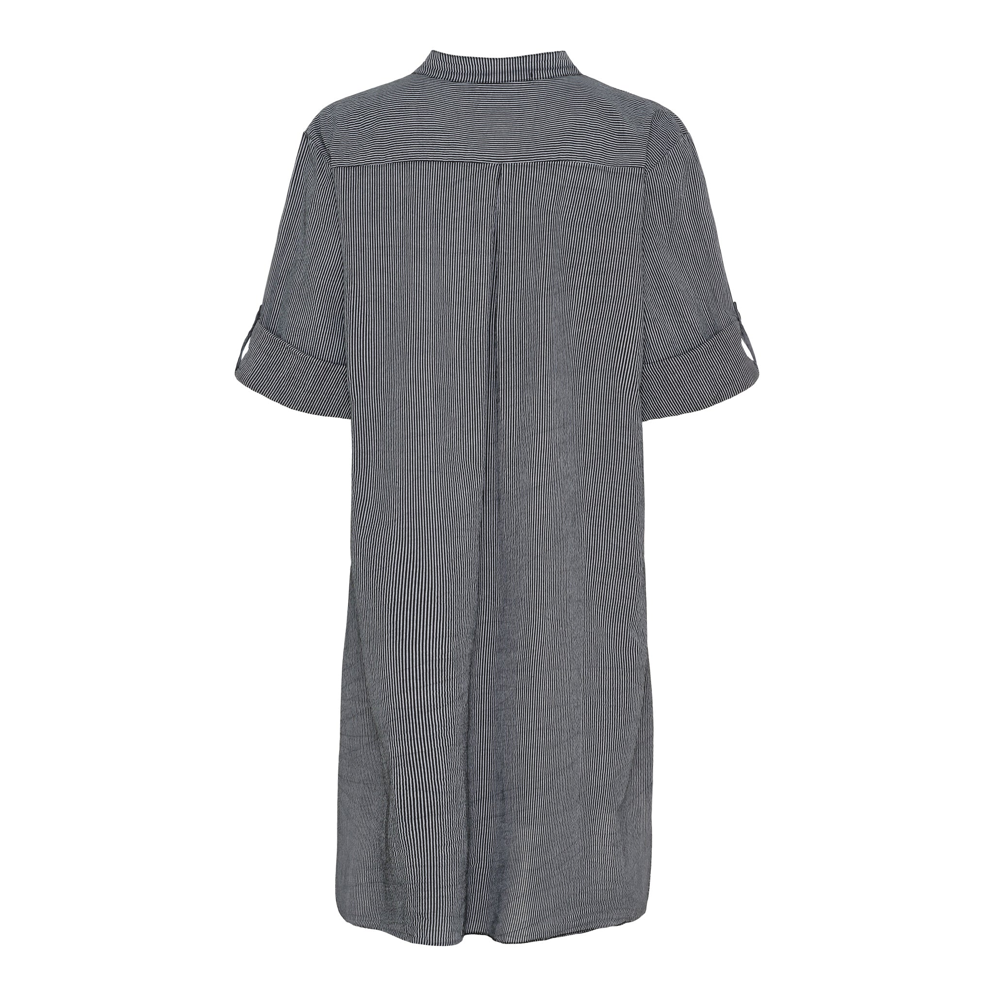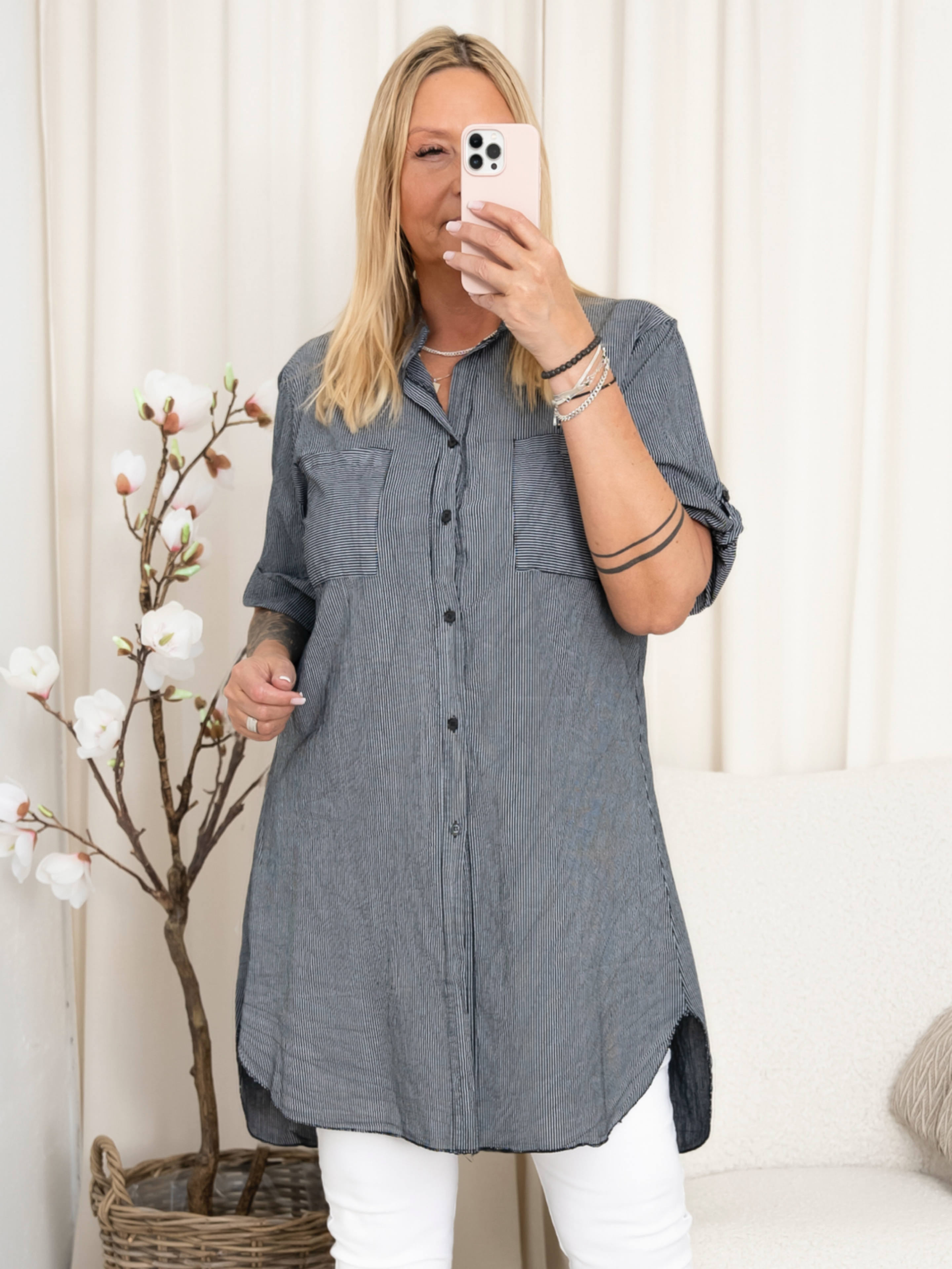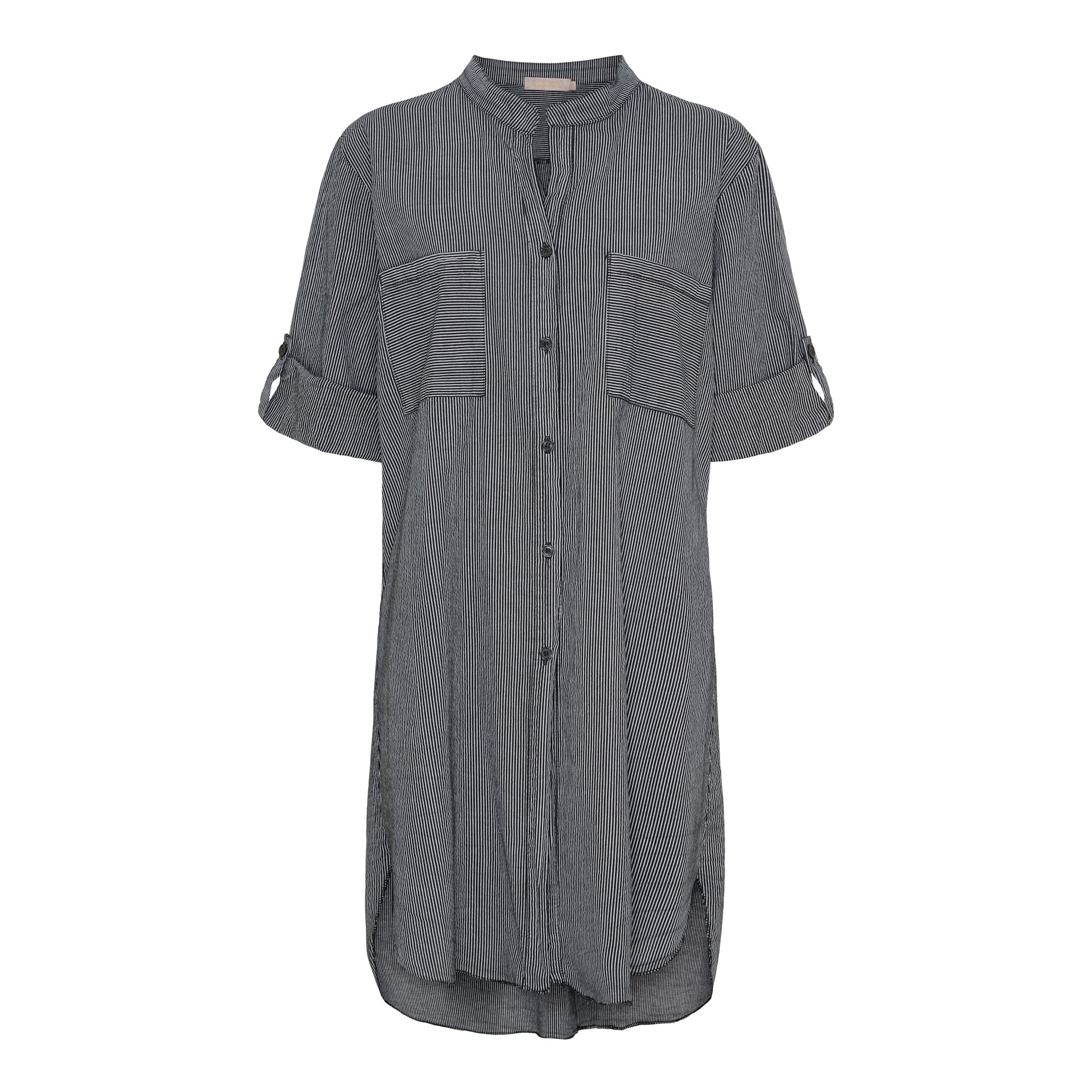 Denne skjortekjole er en afslappet og stilfuld klassiker, som passer perfekt til varme dage og et casual-chic look. De fine striber og brystlommer giver et moderne twist, mens den luftige pasform og afrundede længde skaber et flatterende fald.