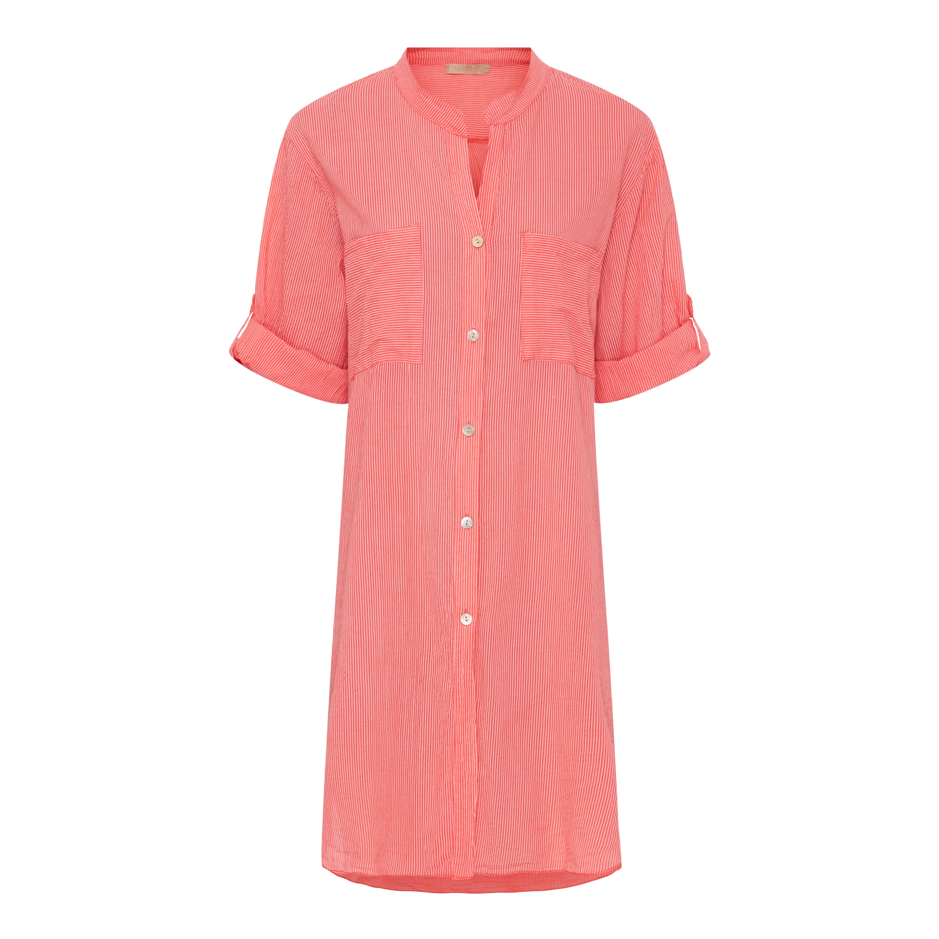 Denne skjortekjole er en afslappet og stilfuld klassiker, som passer perfekt til varme dage og et casual-chic look. De fine striber og brystlommer giver et moderne twist, mens den luftige pasform og afrundede længde skaber et flatterende fald.