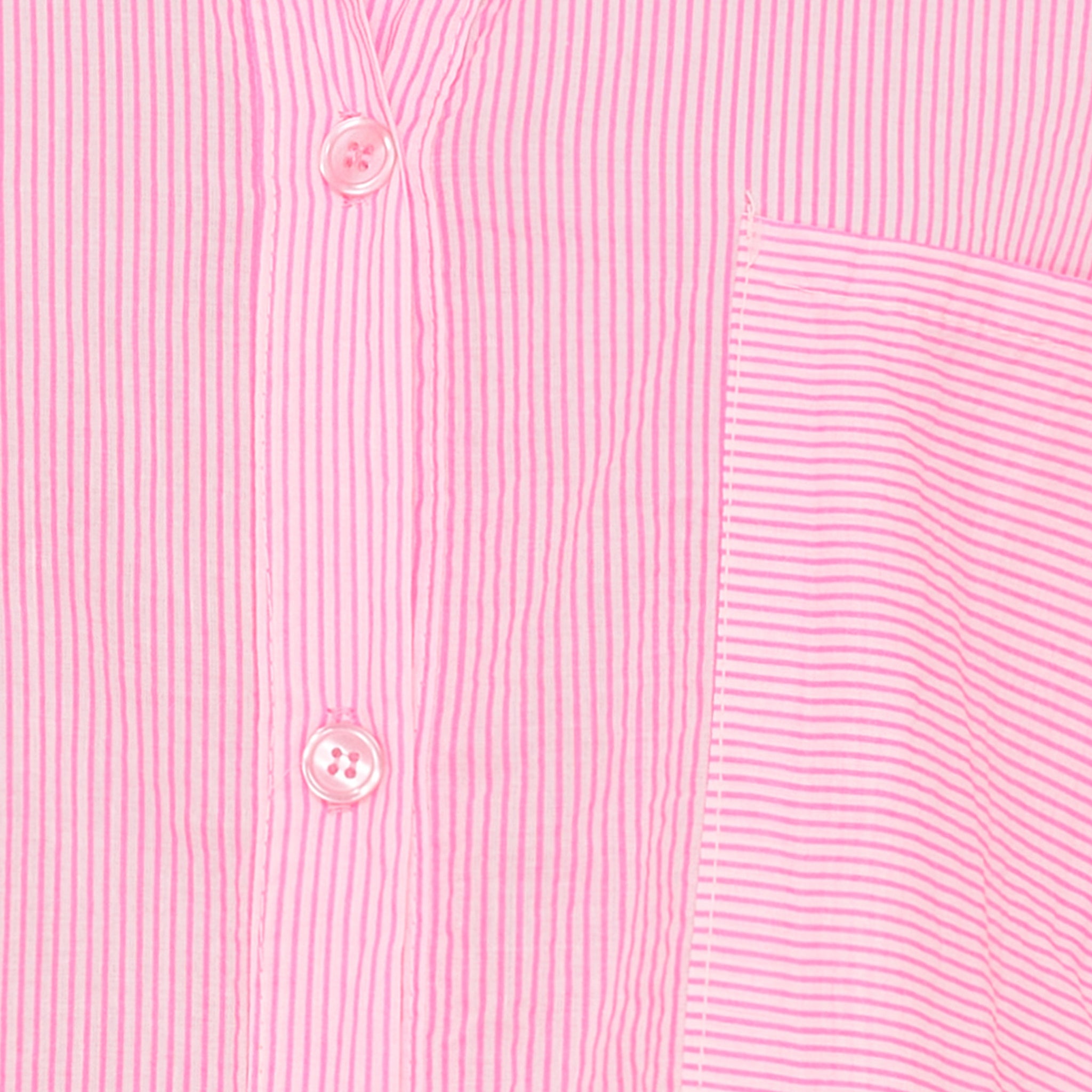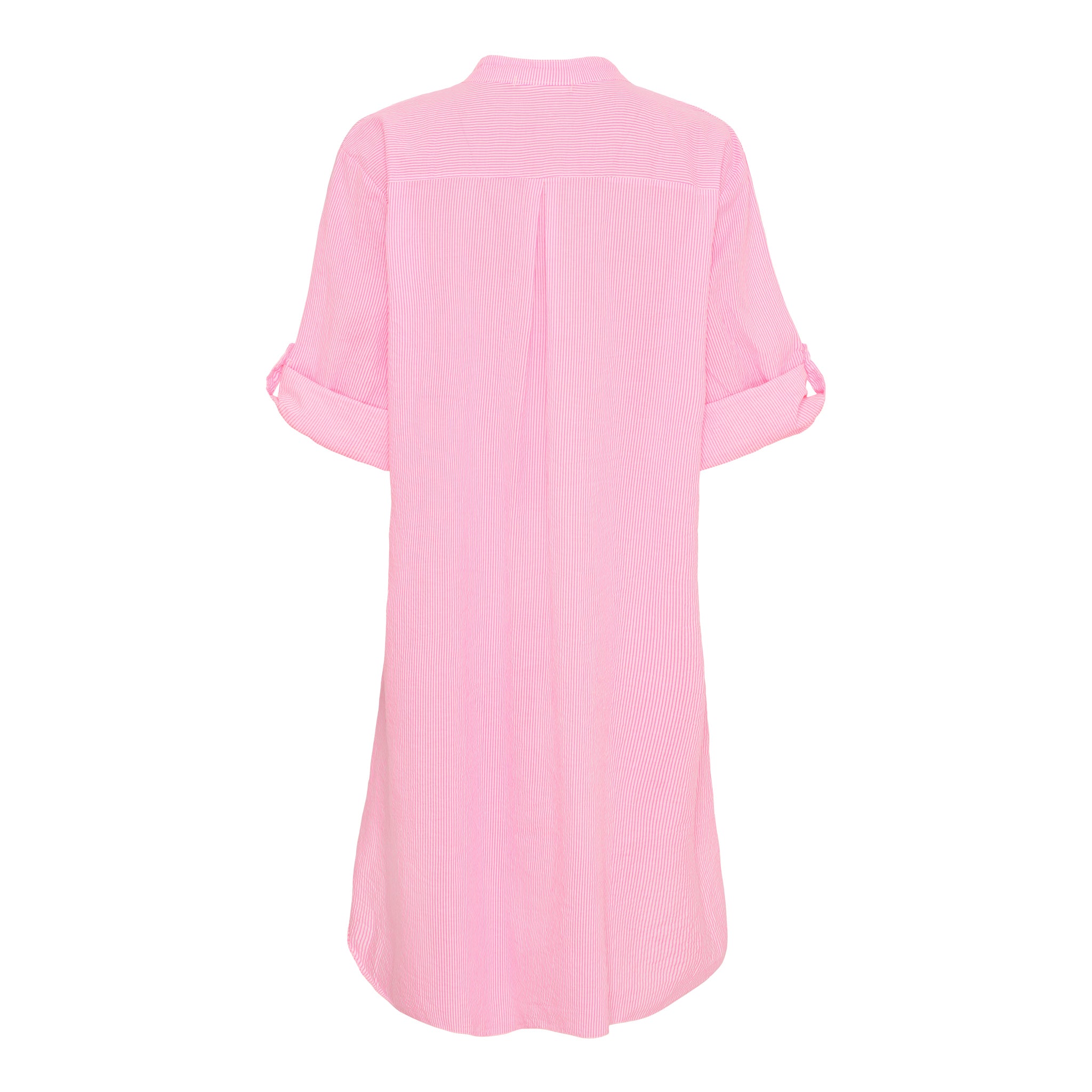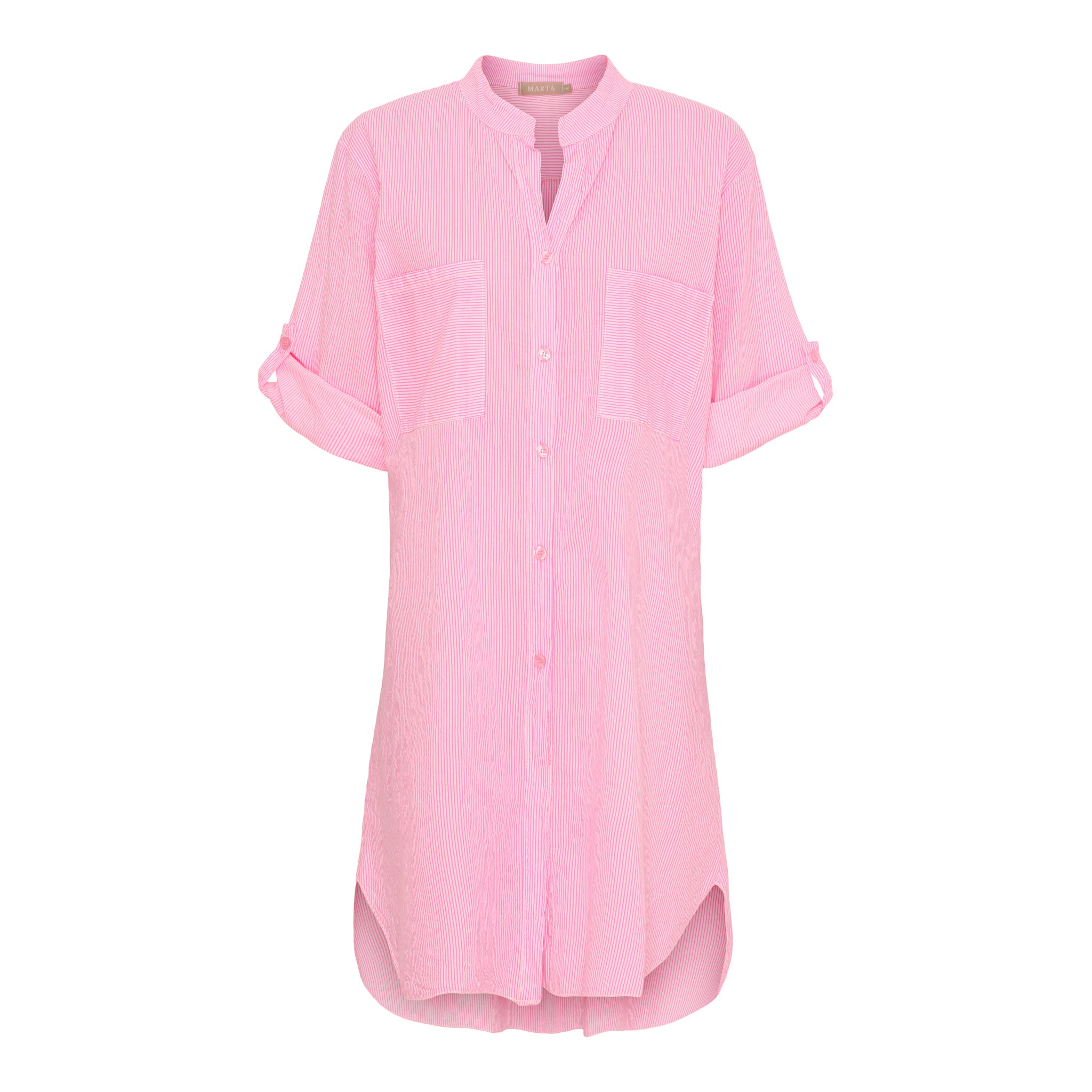 Denne skjortekjole er en afslappet og stilfuld klassiker, som passer perfekt til varme dage og et casual-chic look. De fine striber og brystlommer giver et moderne twist, mens den luftige pasform og afrundede længde skaber et flatterende fald.