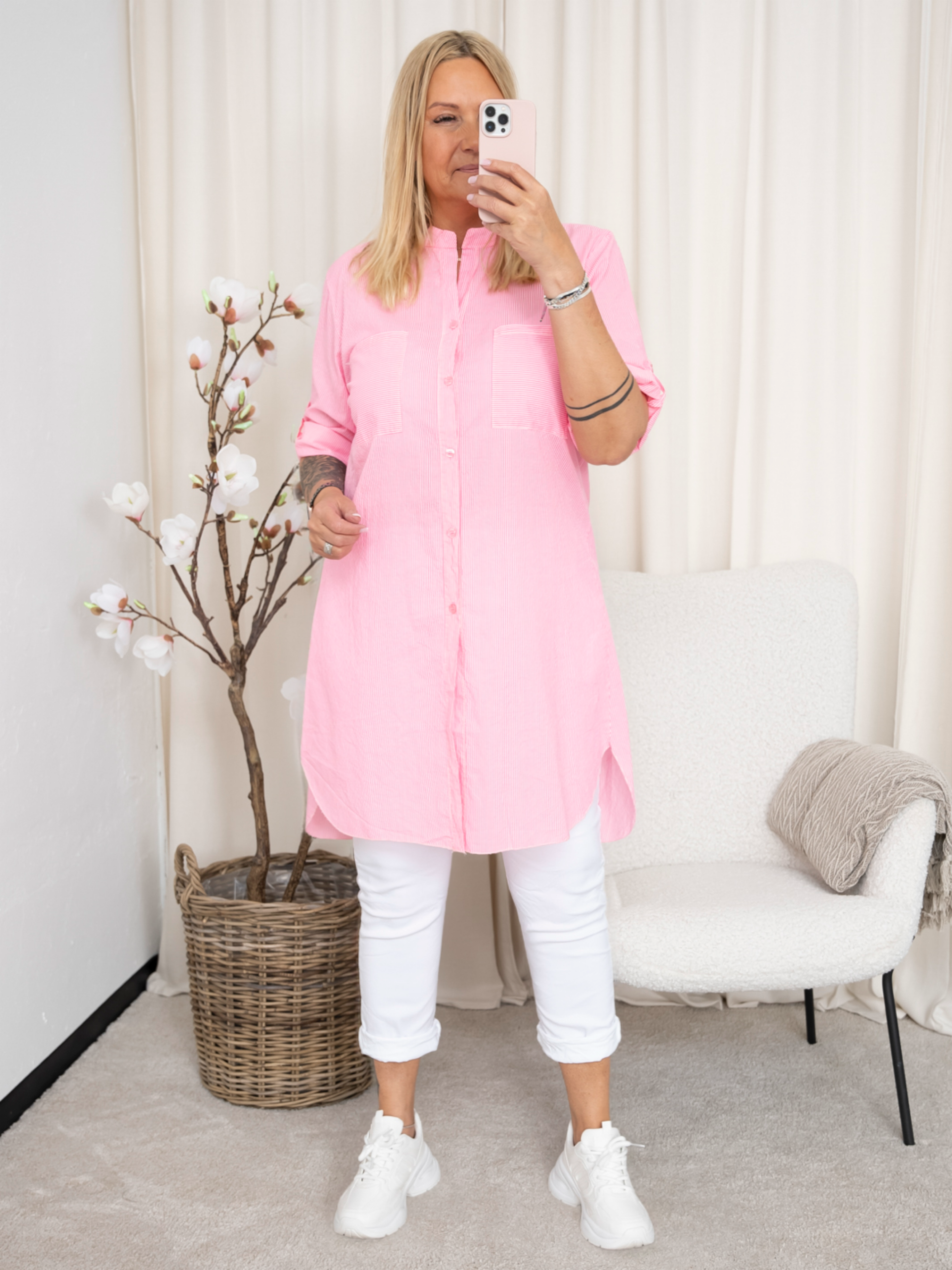 Knaplukningen hele vejen ned gør den nem at bruge både åben som kimono eller lukket som kjole. Ærmerne kan justeres med opsmøg og knappelukning, hvilket gør den fleksibel i udtrykket – både til sommerdage og lag-på-lag-styling.