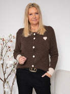Cardiganen har rund hals, gennemgående knaplukning og ribkanter, der afslutter designet på elegant vis. Det lille hjertebroderi på brystet skaber en sød kontrast til det enkle snit og gør modellen ideel til både hverdagsbrug og afslappede anledninger.