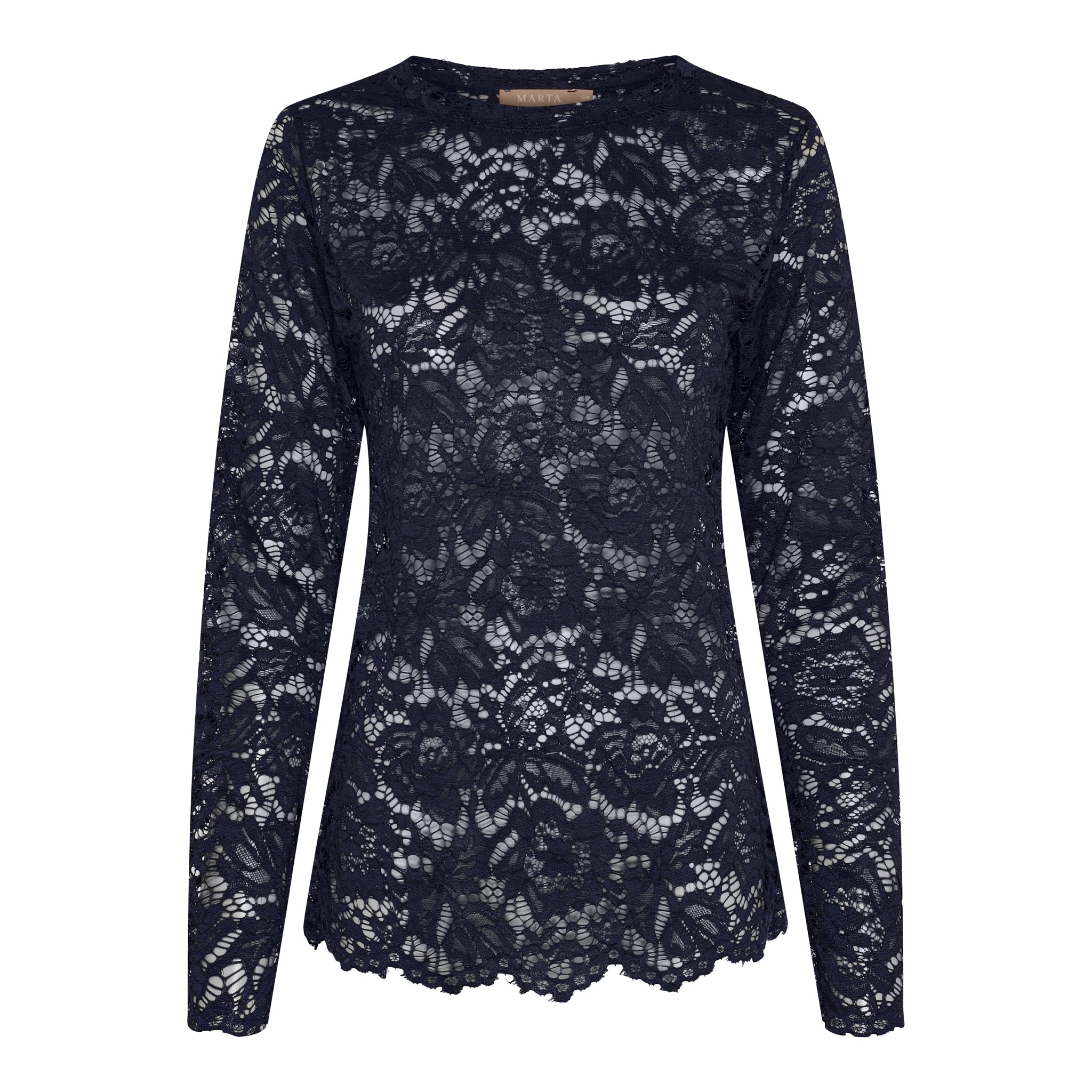 Blusen har lange ærmer, rund hals og en lige pasform, der gør den let at kombinere med både rå jeans og mere formelle underdele. Detaljerne i blonden giver et eksklusivt præg, mens den lette kvalitet sikrer høj komfort.