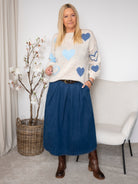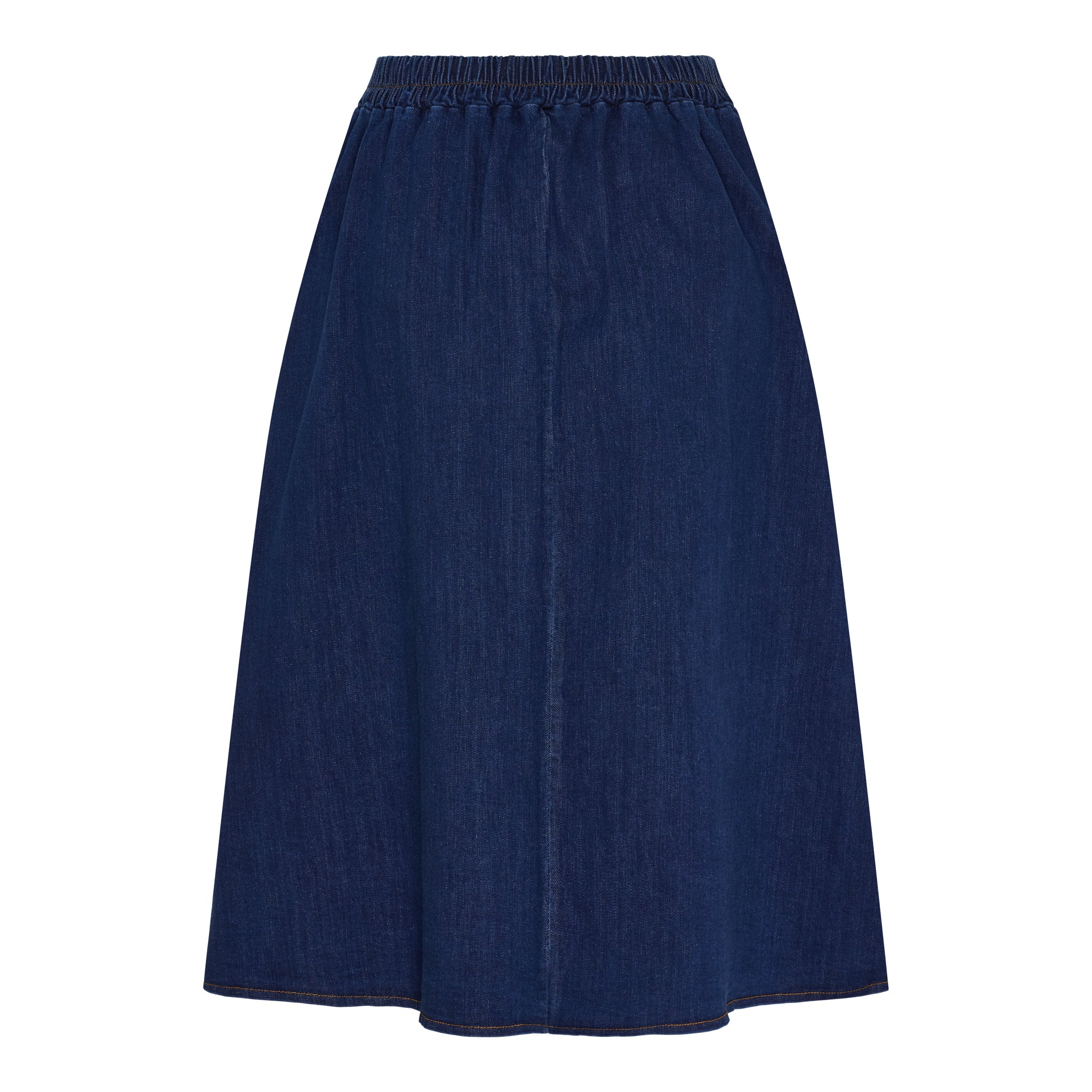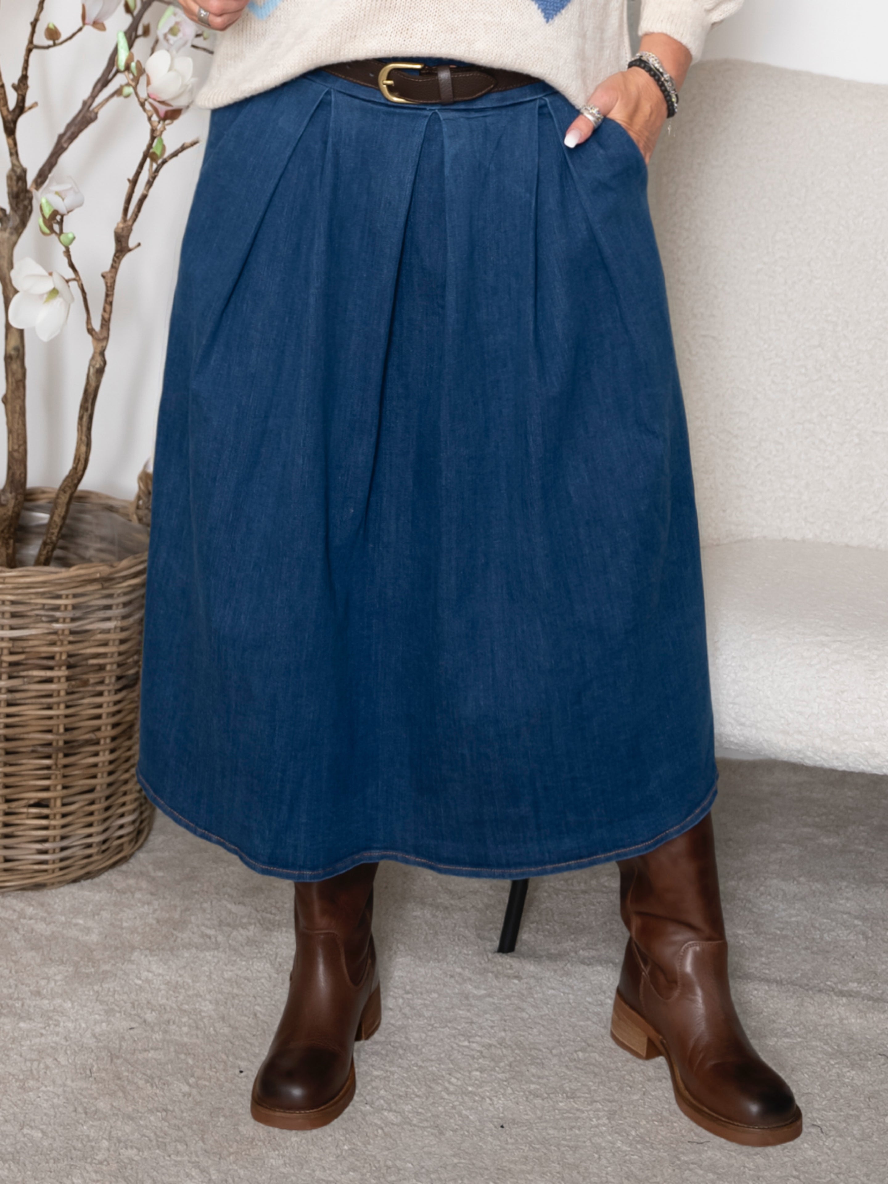 Denne smukke denimnederdel kombinerer et klassisk udtryk med en feminin og afslappet silhuet. Det bløde denimstof falder flot og giver et elegant look, mens de fine læg foran tilfører bevægelse og struktur.