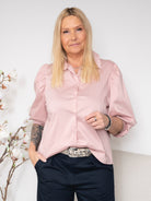 Designet er klassisk med gennemgående knaplukning og krave, som giver et tidløst udtryk. De voluminøse 3/4-ærmer med let rynkning tilfører skjorten et feminint touch og skaber en flot silhuet, mens den let figursyede pasform giver et elegant fald.