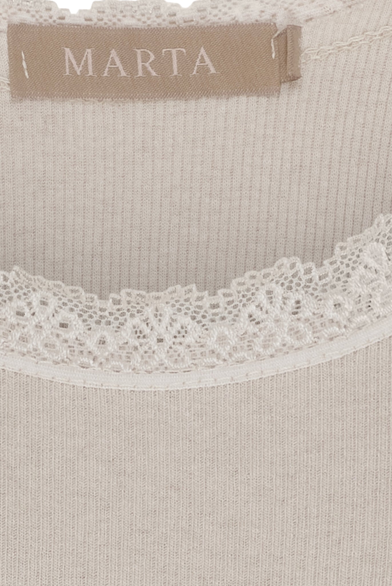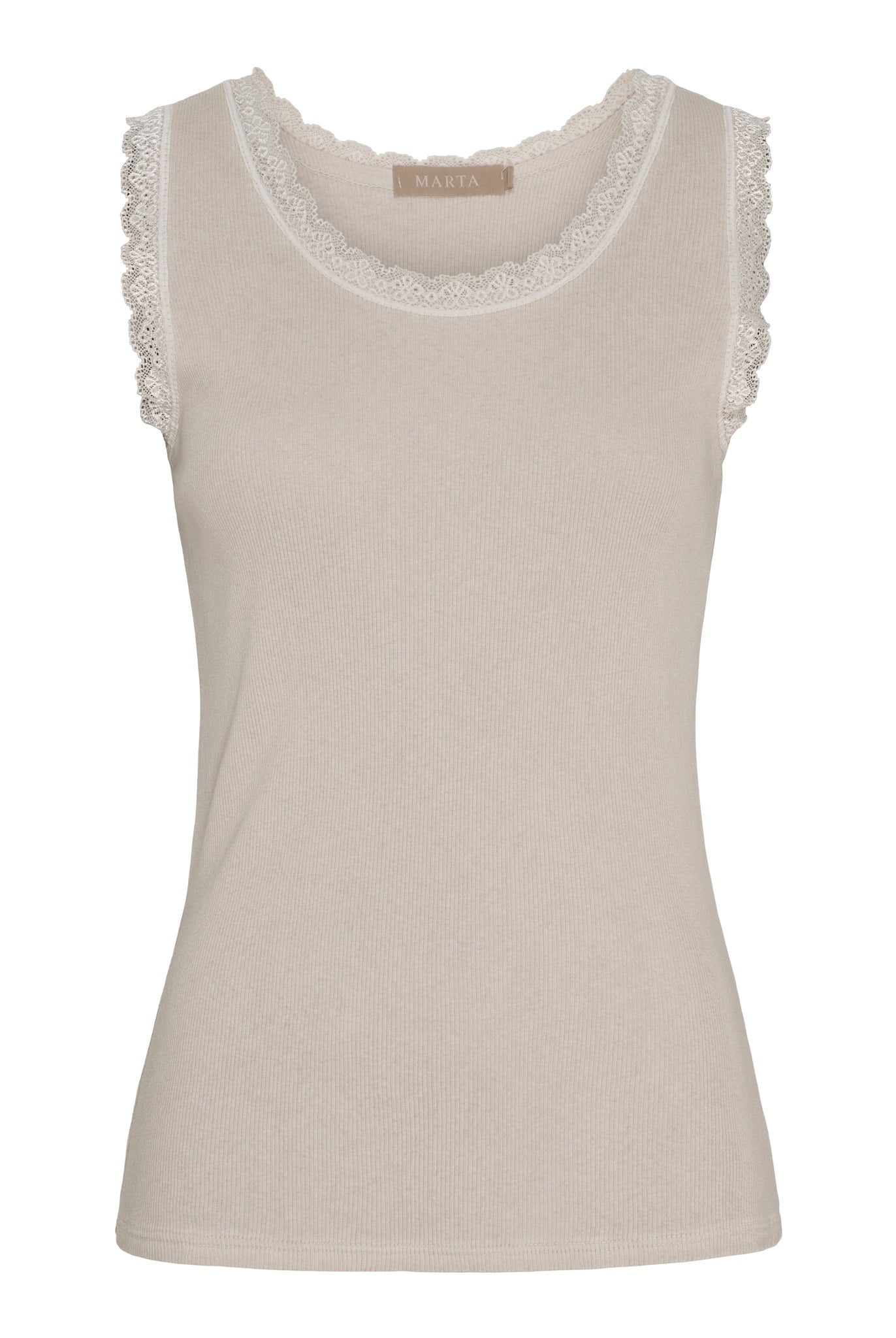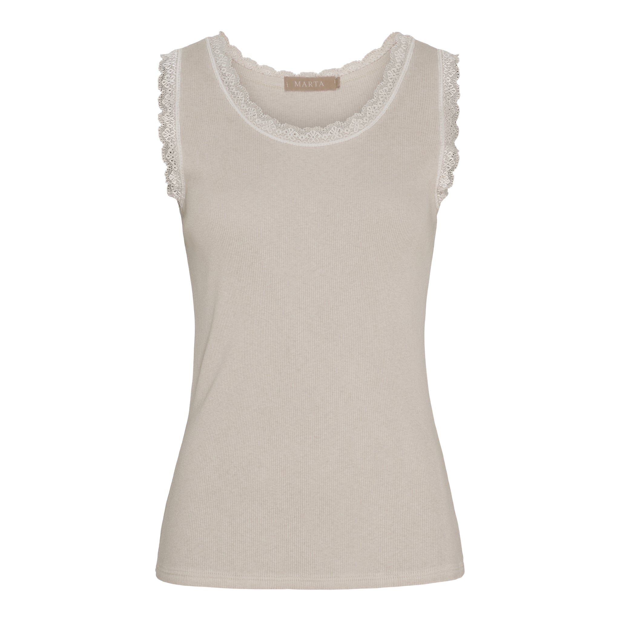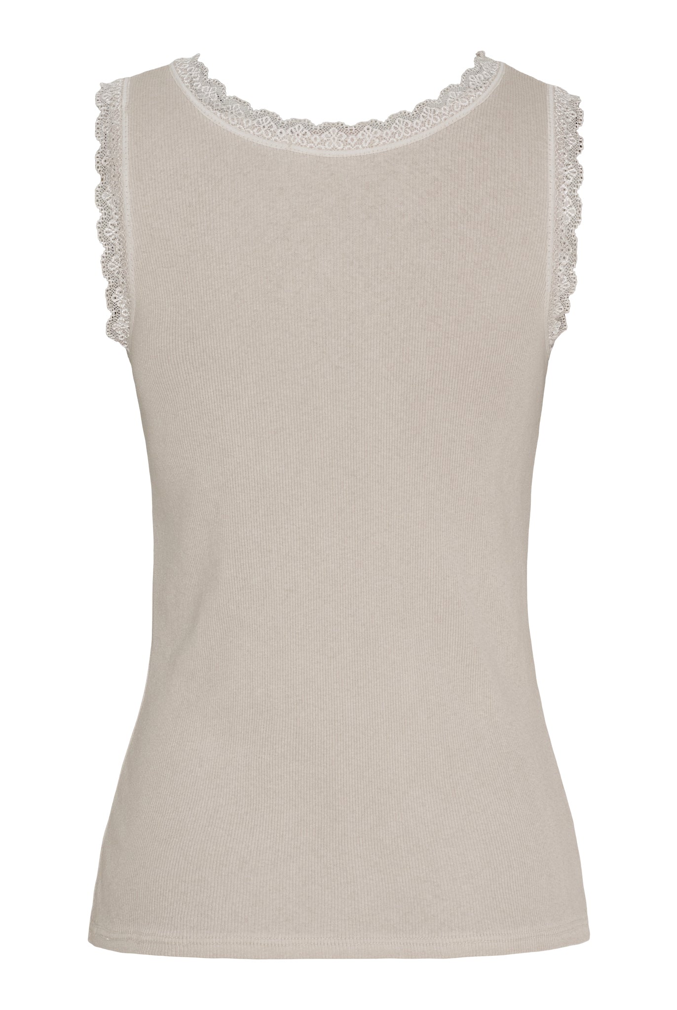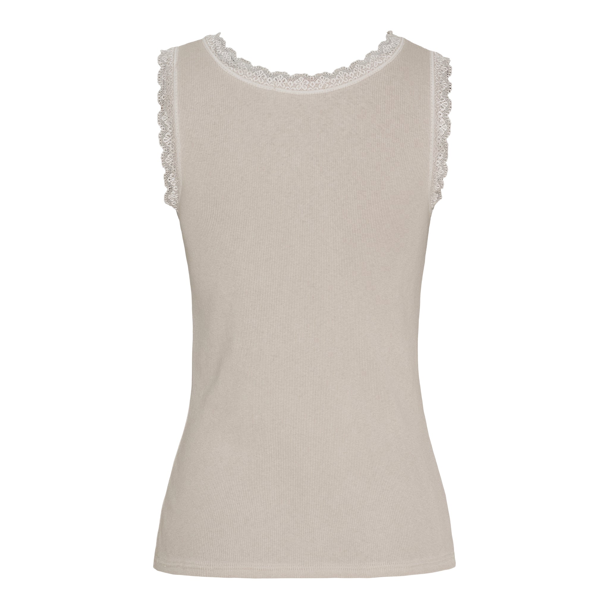 En klassiker i garderoben – denne top er både enkel og feminin med sin smukke blondekant, der giver et romantisk løft til et ellers helt basic design. Den bløde ribkvalitet sikrer en skøn pasform, der smyger sig let om kroppen og føles behagelig hele dagen.