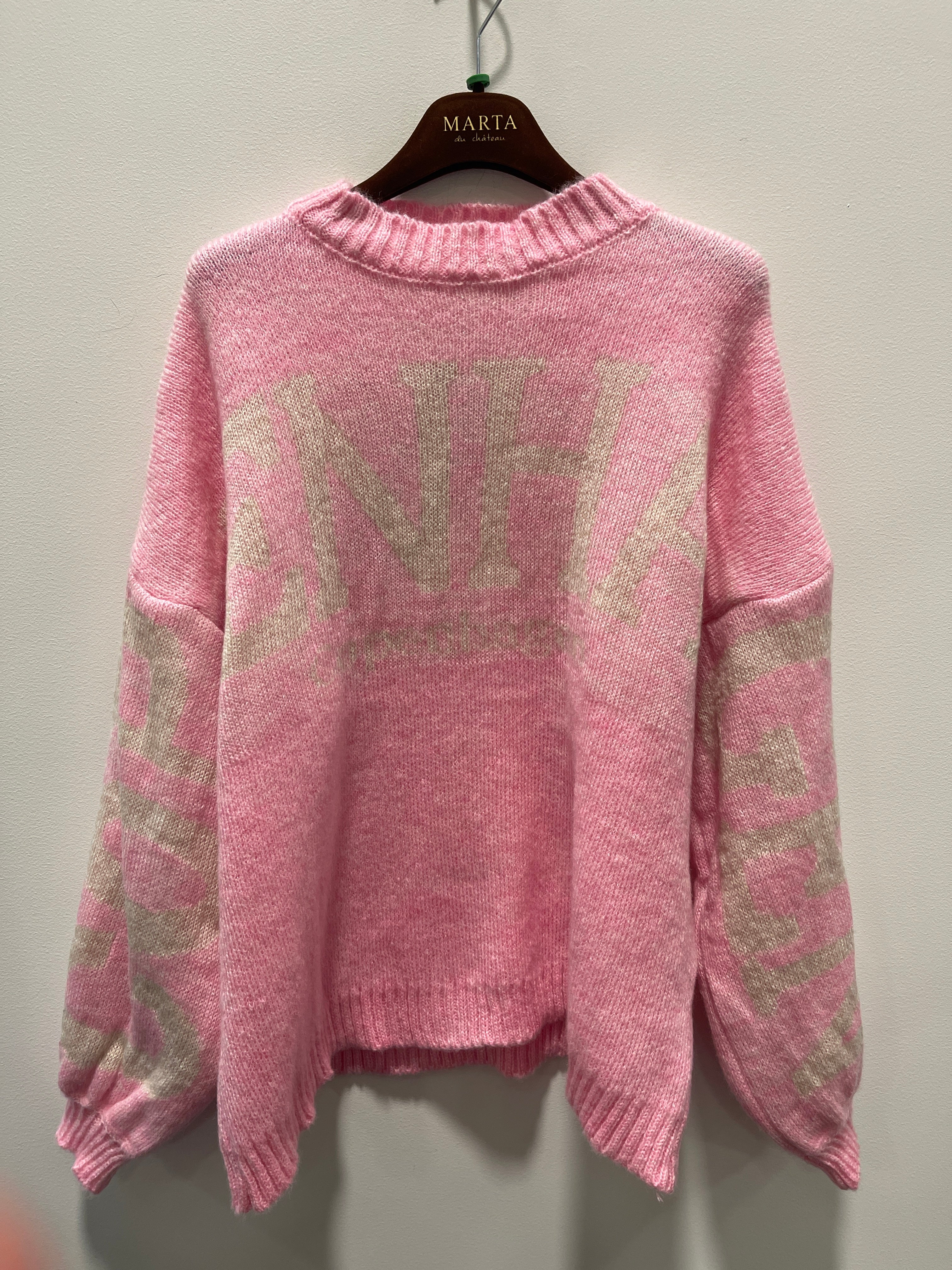 Denne striktrøje med stort tekstmotiv bringer både kant og komfort til vintergarderoben. Det oversized design og den chunky strikkvalitet giver en afslappet silhuet med masser af personlighed og varme.
