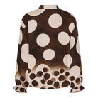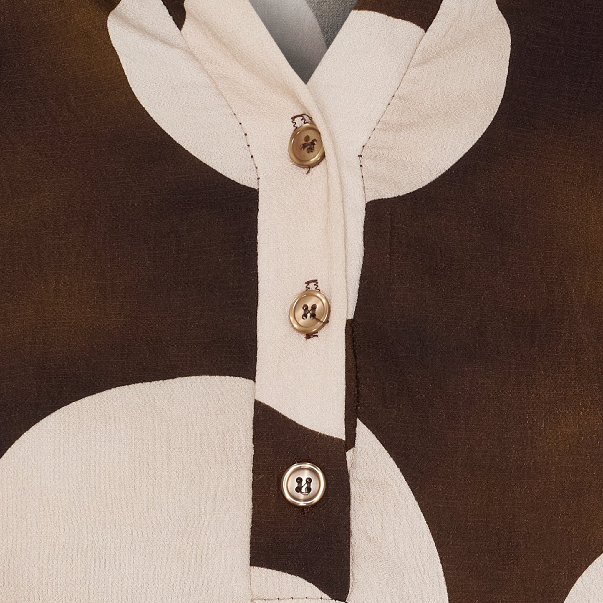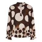 Det store polkaprikkede mønster skaber et moderne og iøjnefaldende udtryk, der nemt kan styles op eller ned. Den korte stolpelukning med fine knapper og den lille ståkrave tilfører et feminint touch, mens de rynkede manchetter afslutter looket med elegance.
