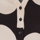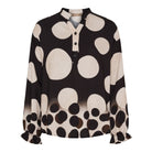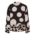 Det store polkaprikkede mønster skaber et moderne og iøjnefaldende udtryk, der nemt kan styles op eller ned. Den korte stolpelukning med fine knapper og den lille ståkrave tilfører et feminint touch, mens de rynkede manchetter afslutter looket med elegance.